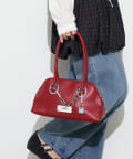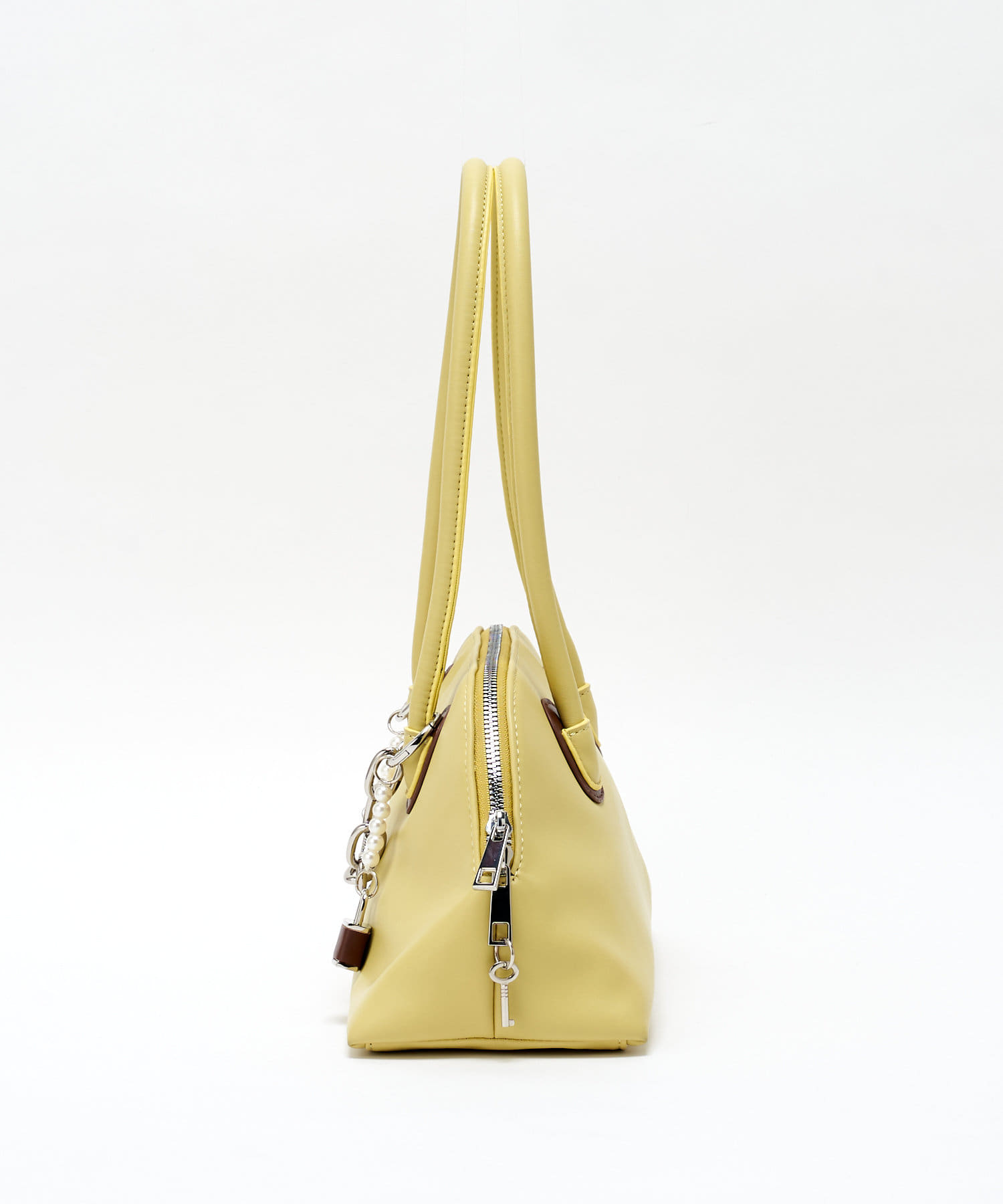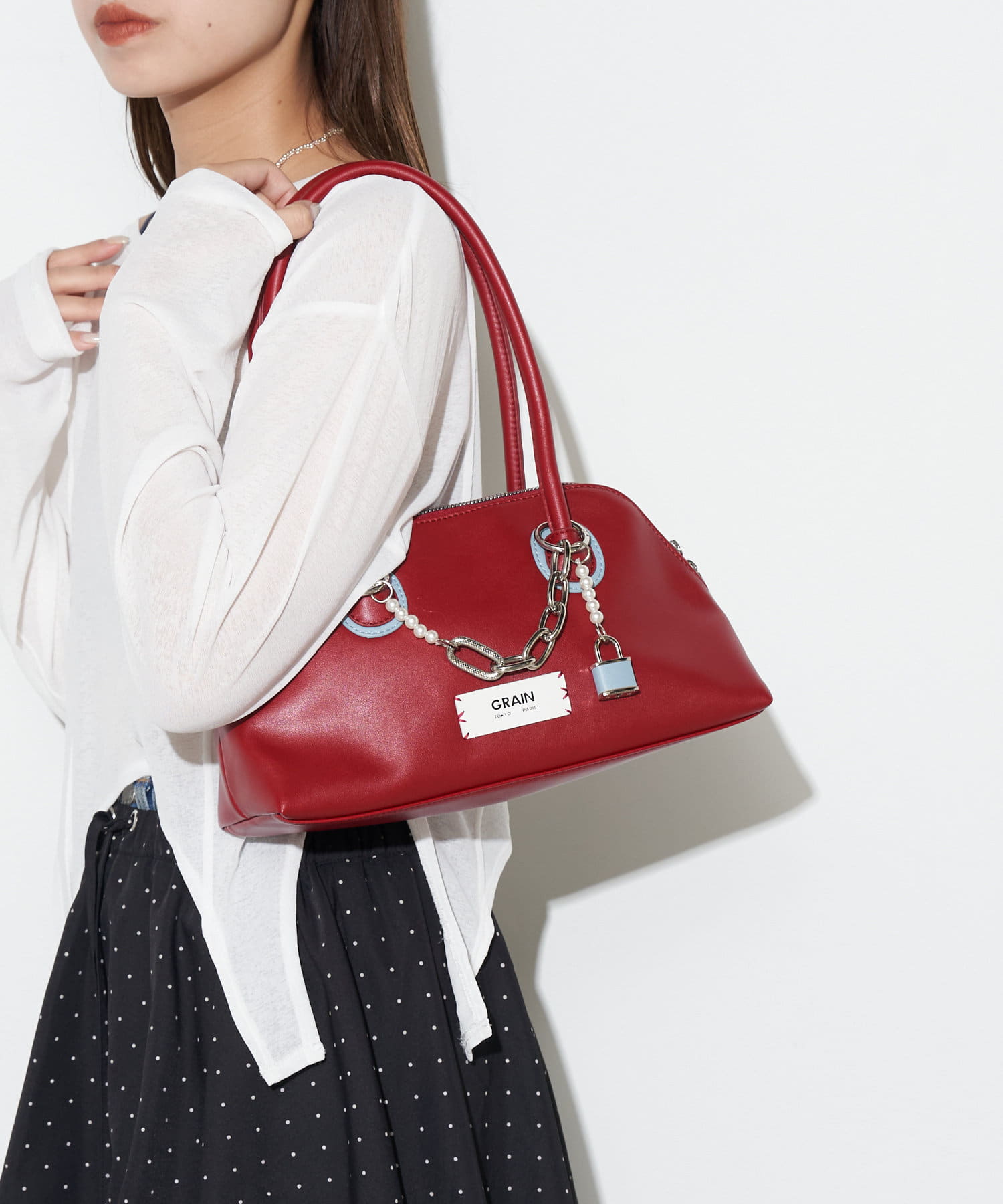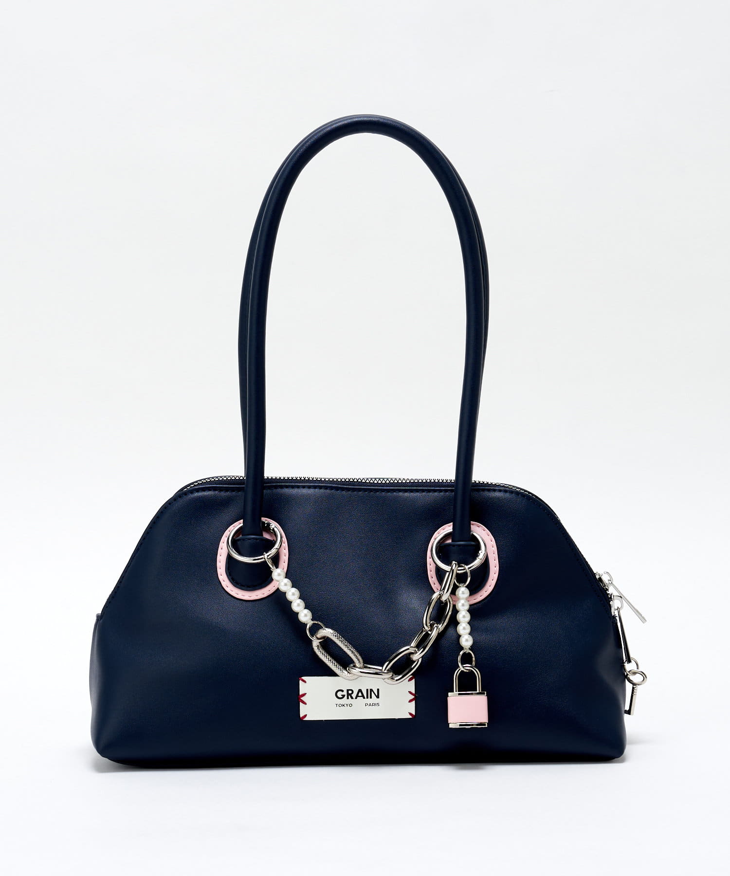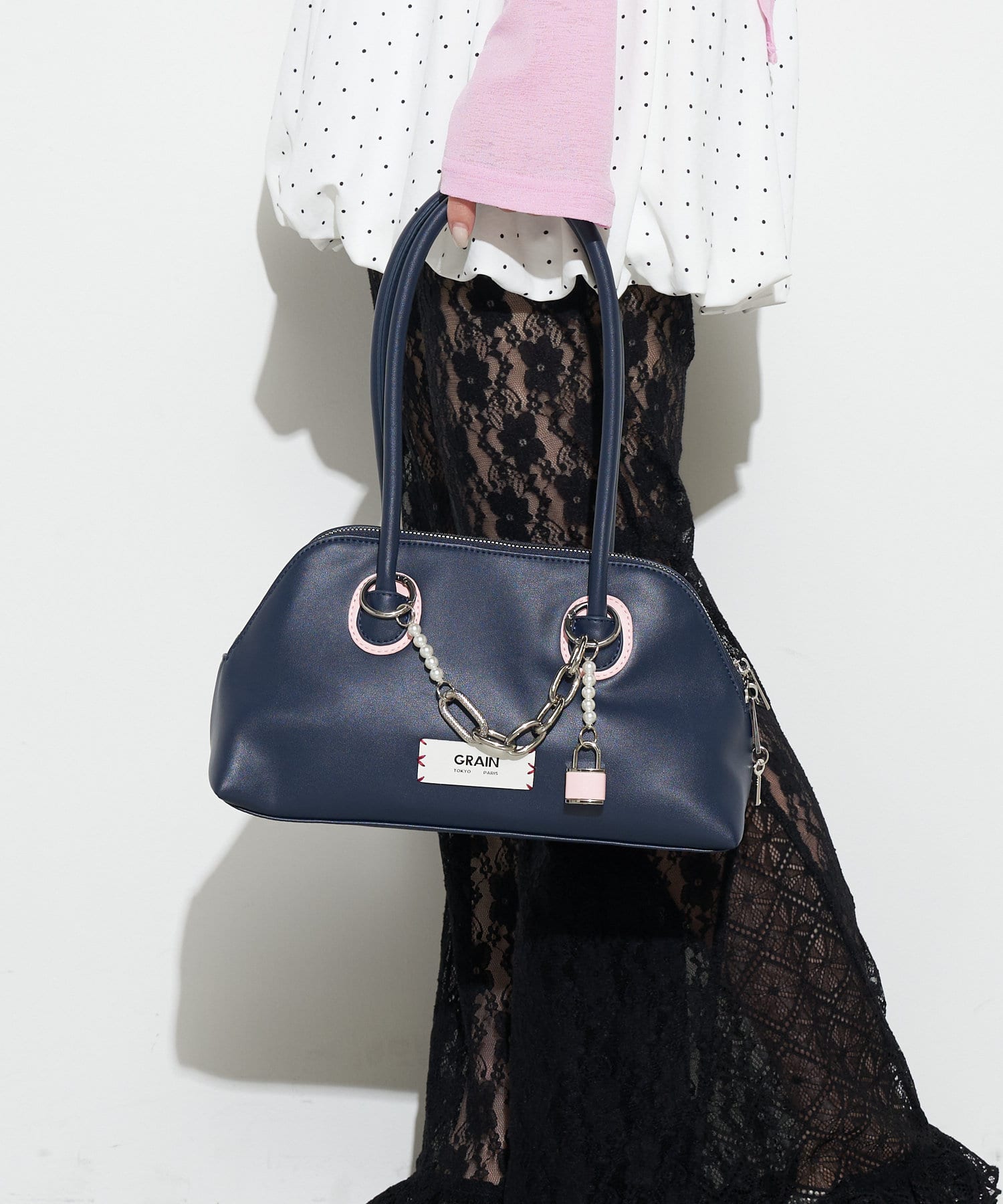 メタル×パール×南京錠チャームが目を引く、バイカラー配色のトートバッグ。