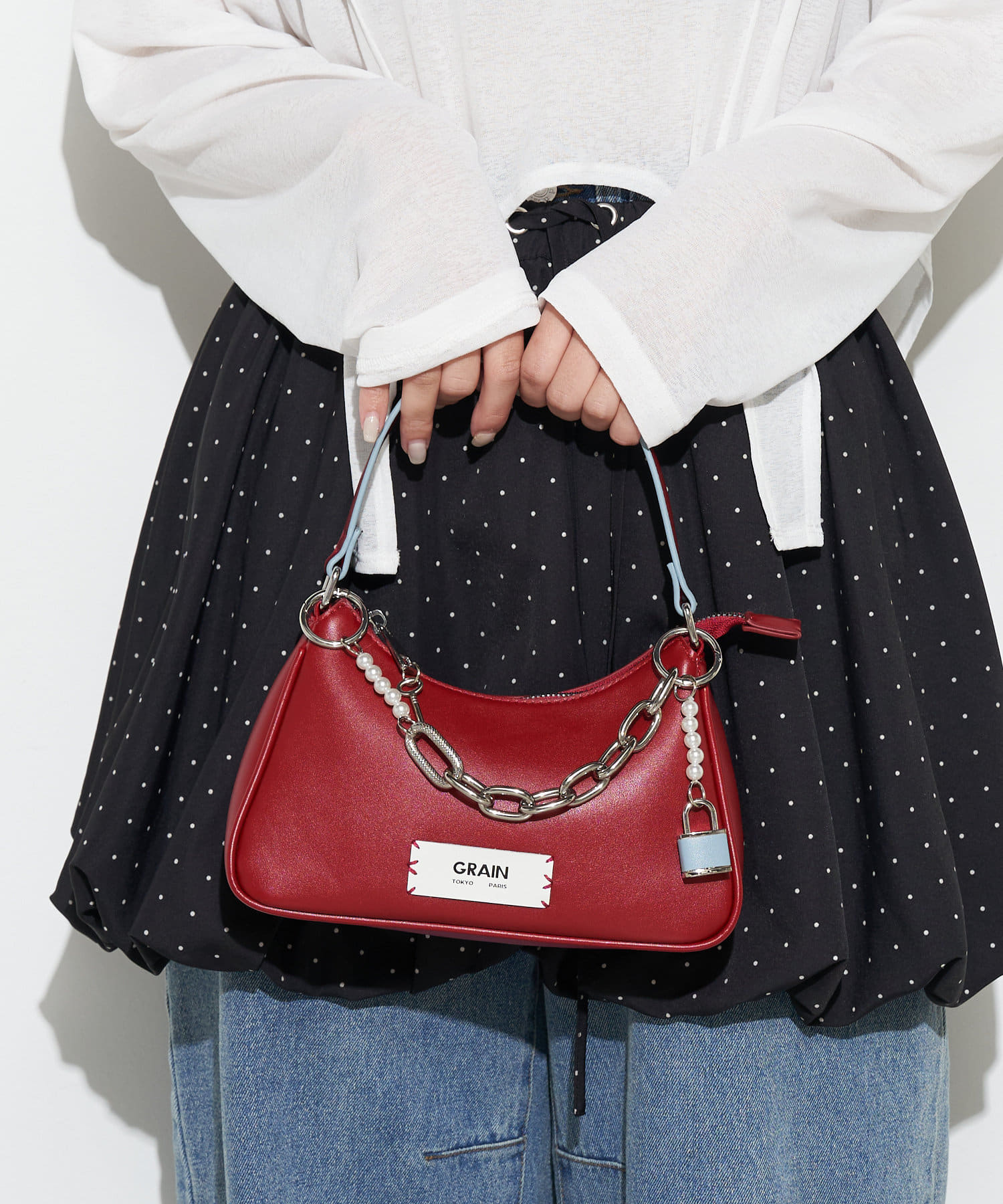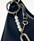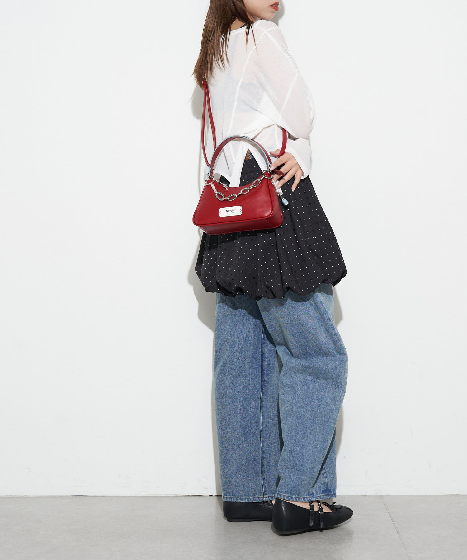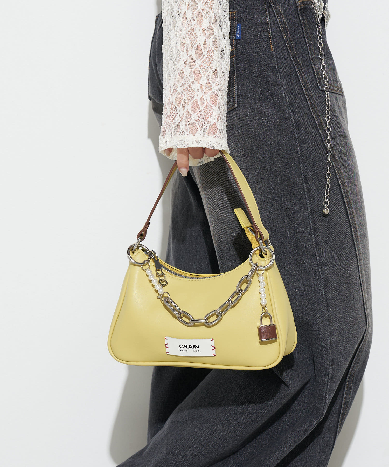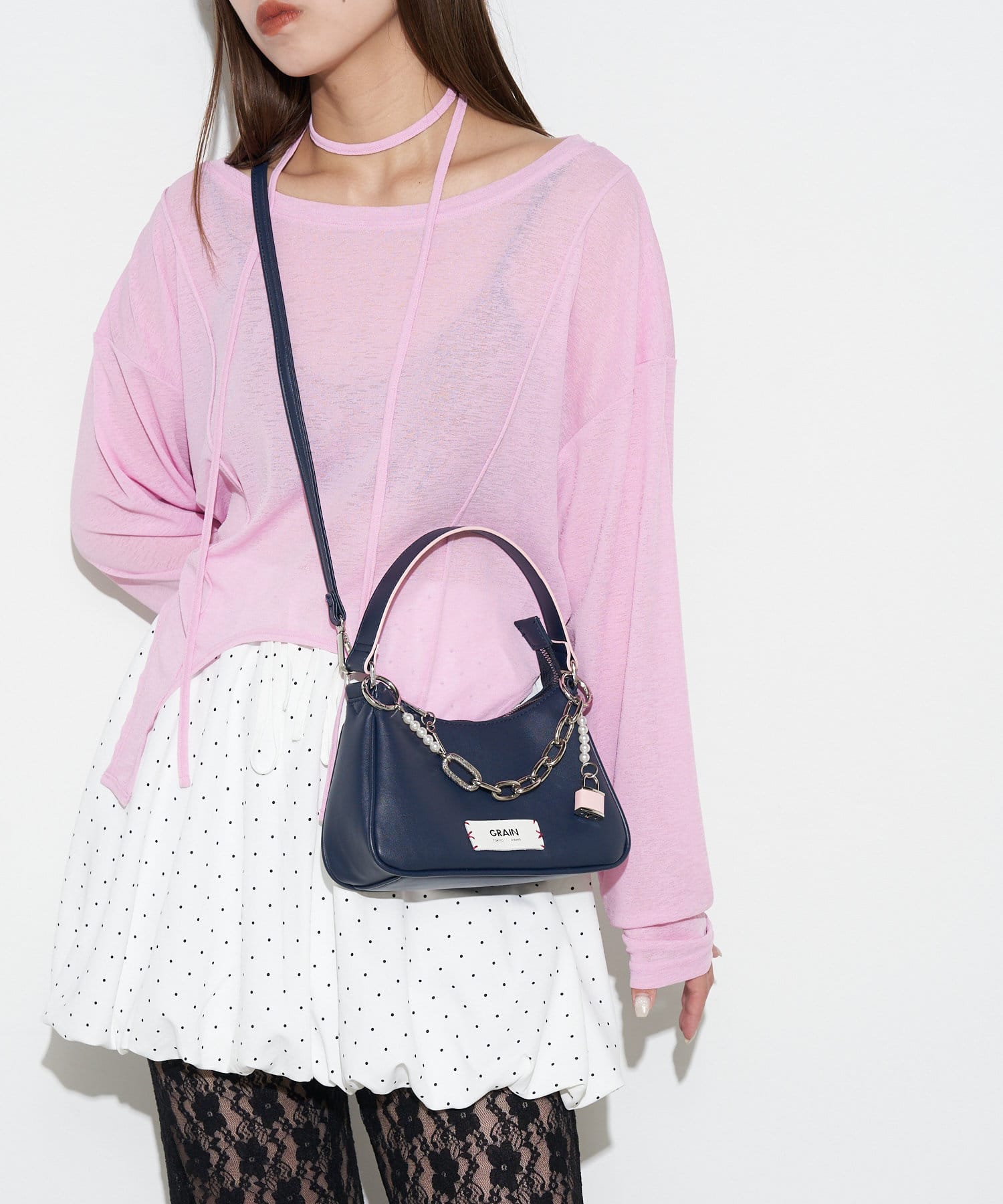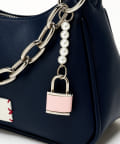 メタルとパールの異素材ミックスのチャームがアクセントになり、持つだけでこなれた印象に。