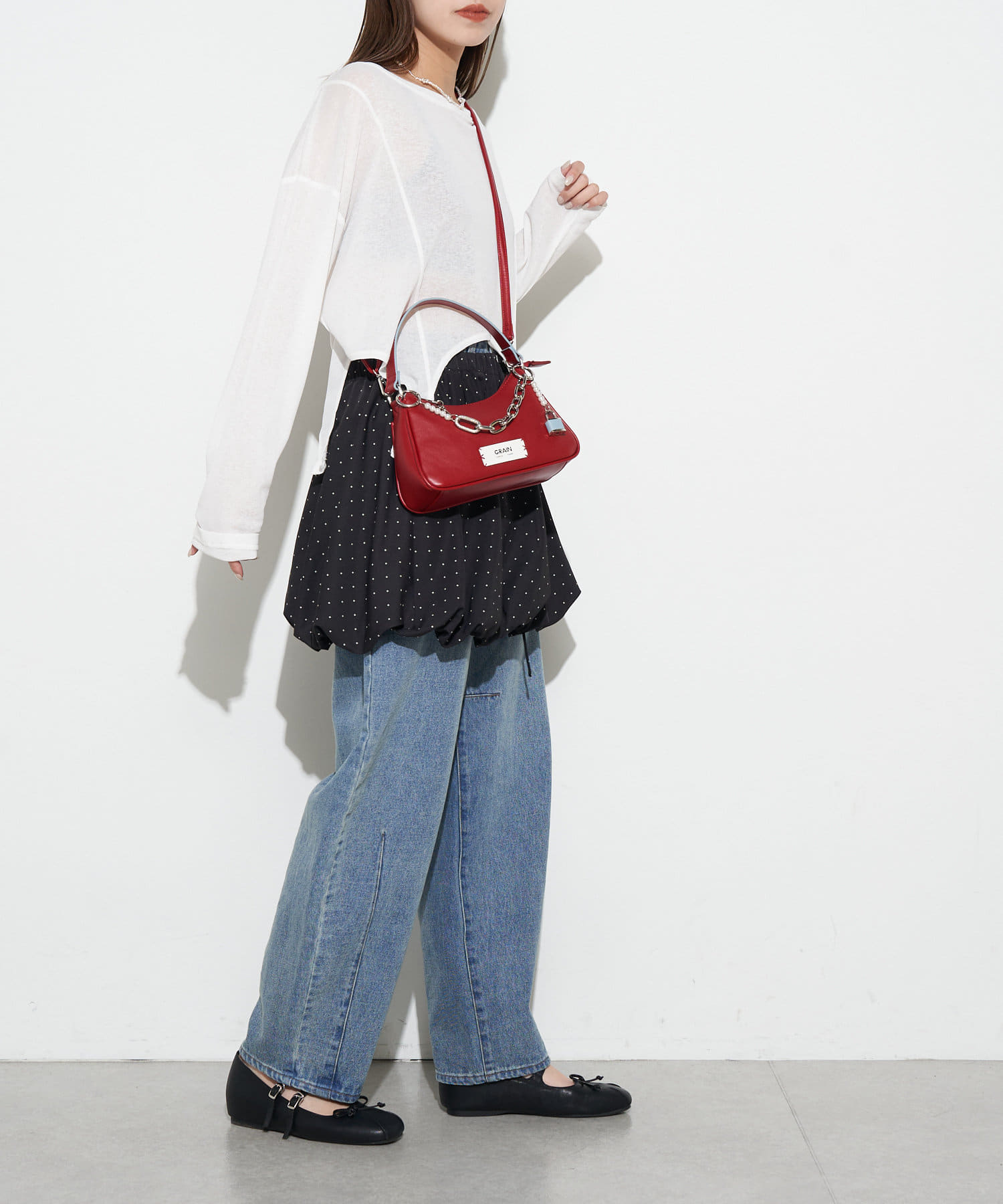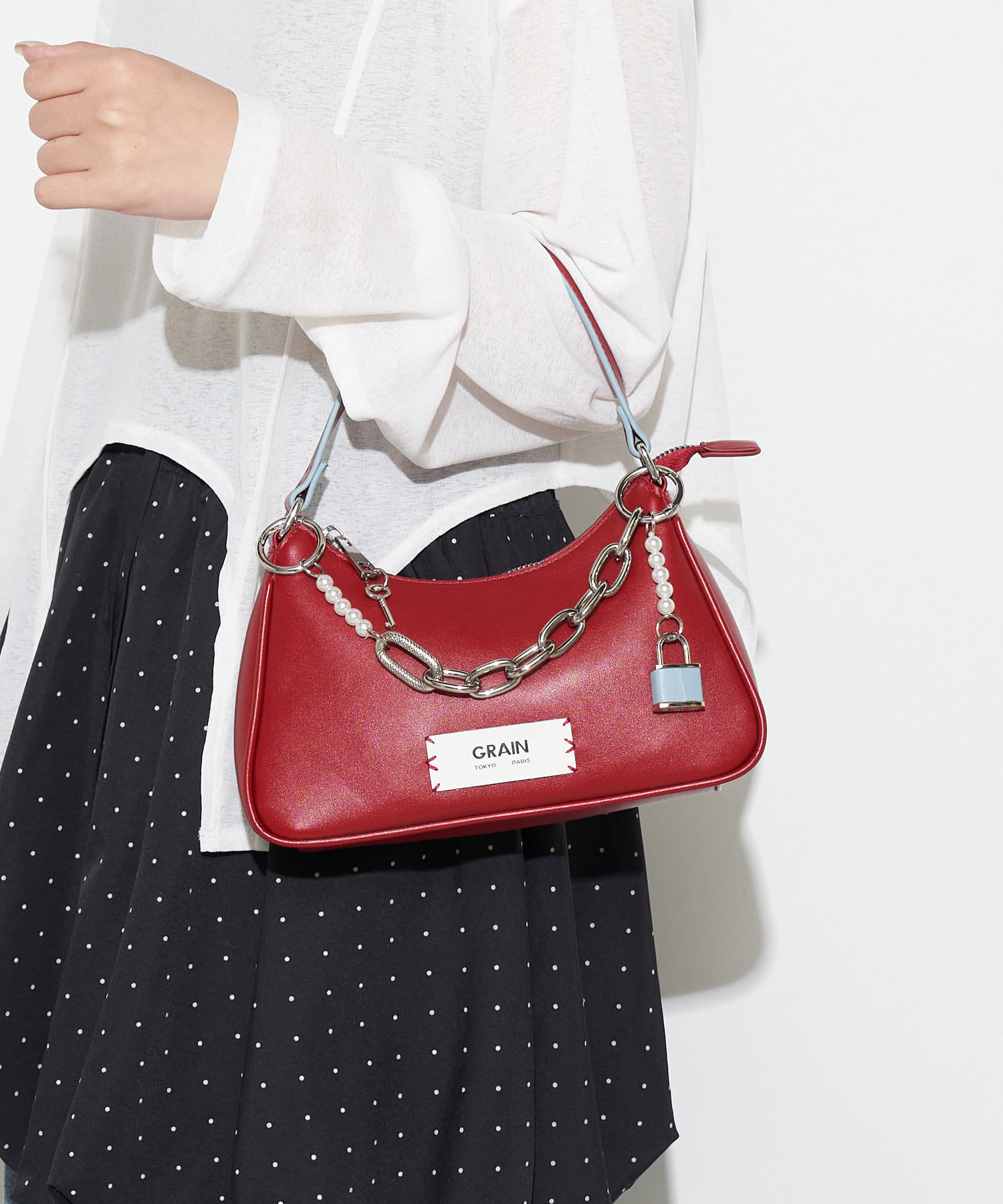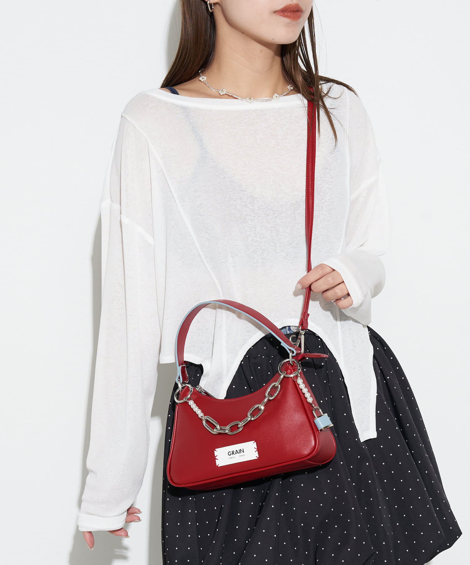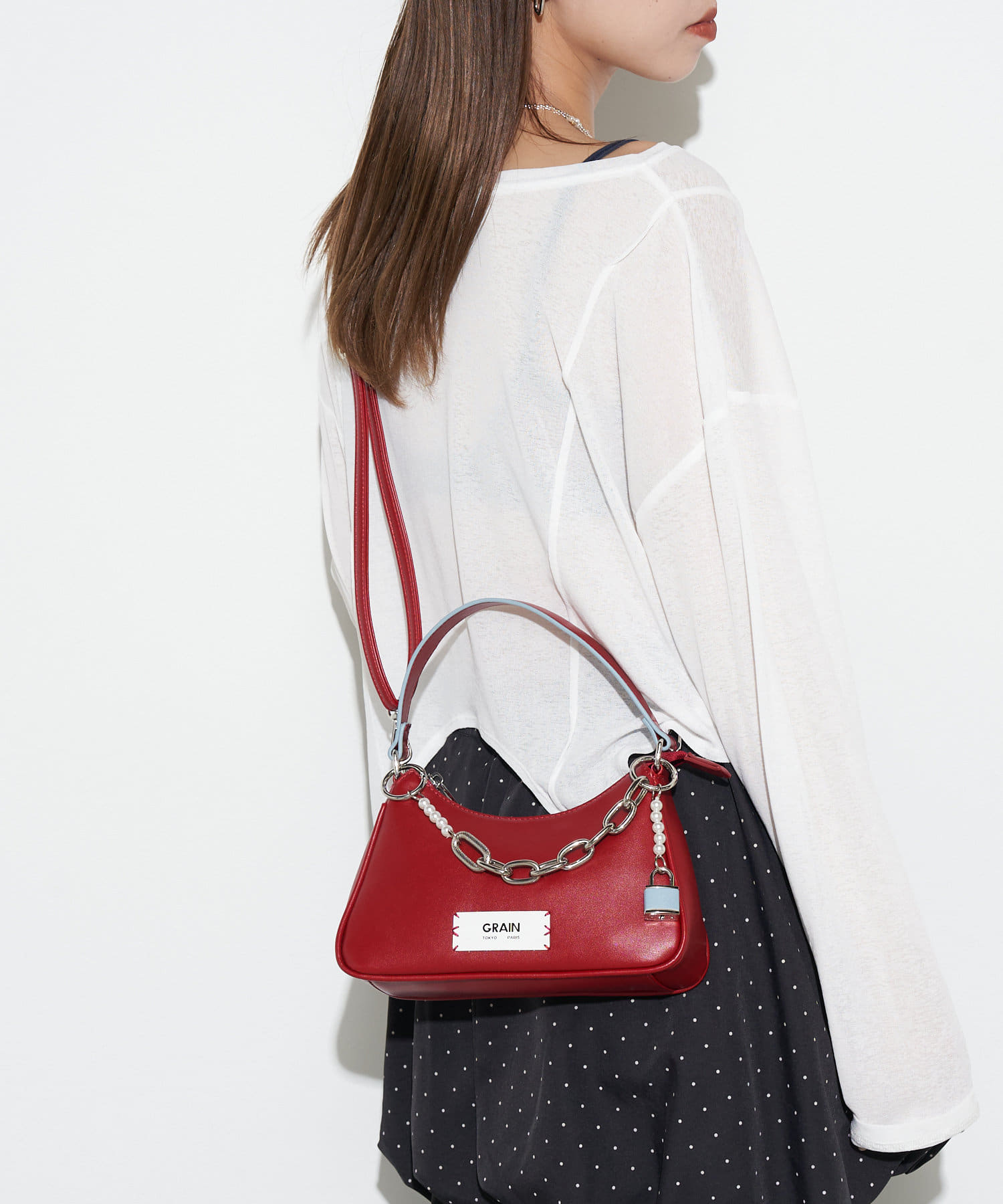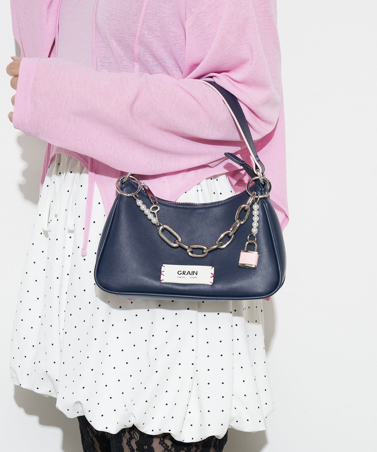 メタルとパールの異素材ミックスのチャームがアクセントになり、持つだけでこなれた印象に。