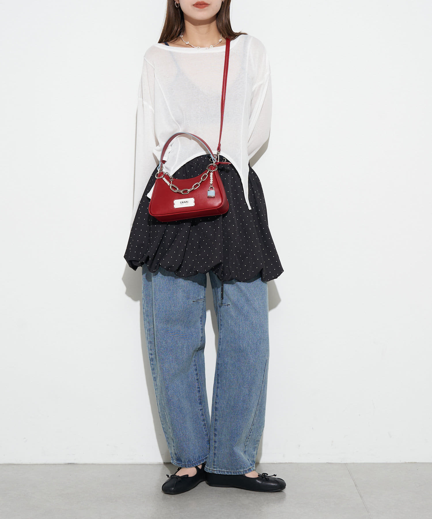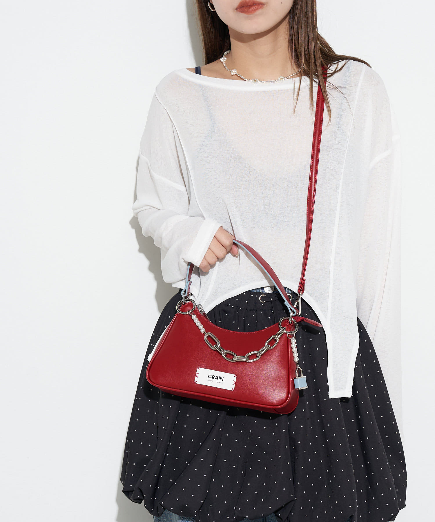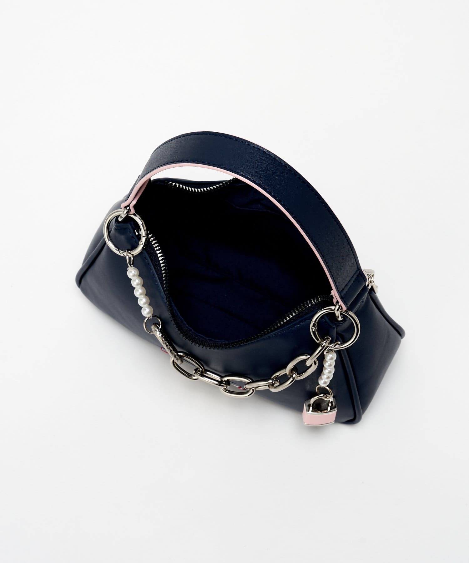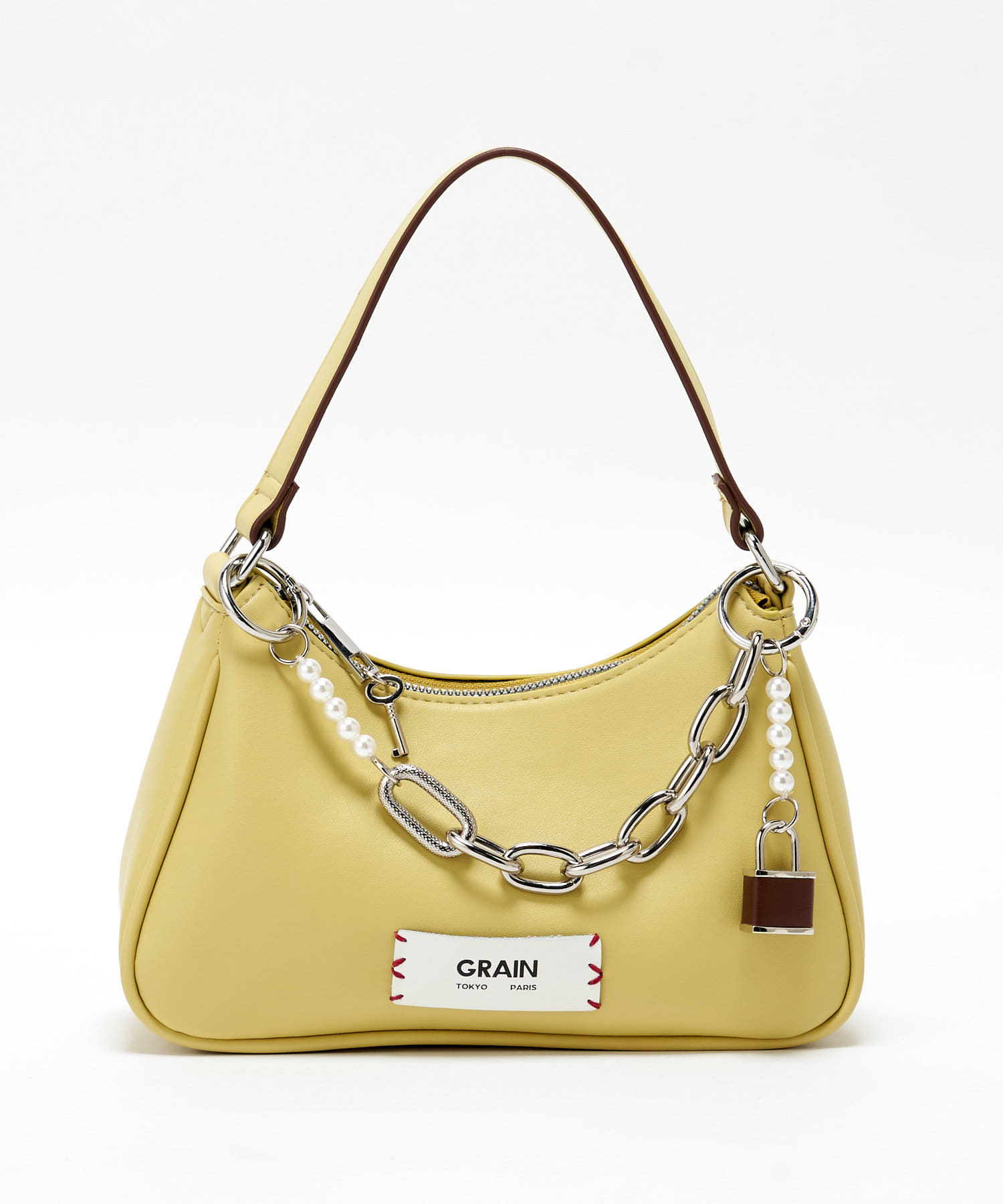 メタルとパールの異素材ミックスのチャームがアクセントになり、持つだけでこなれた印象に。