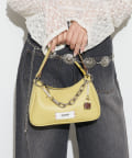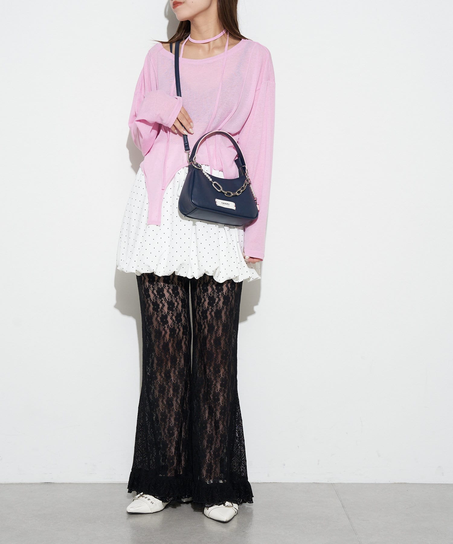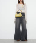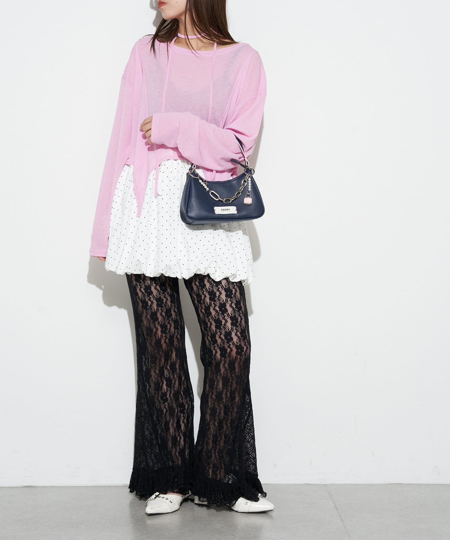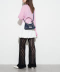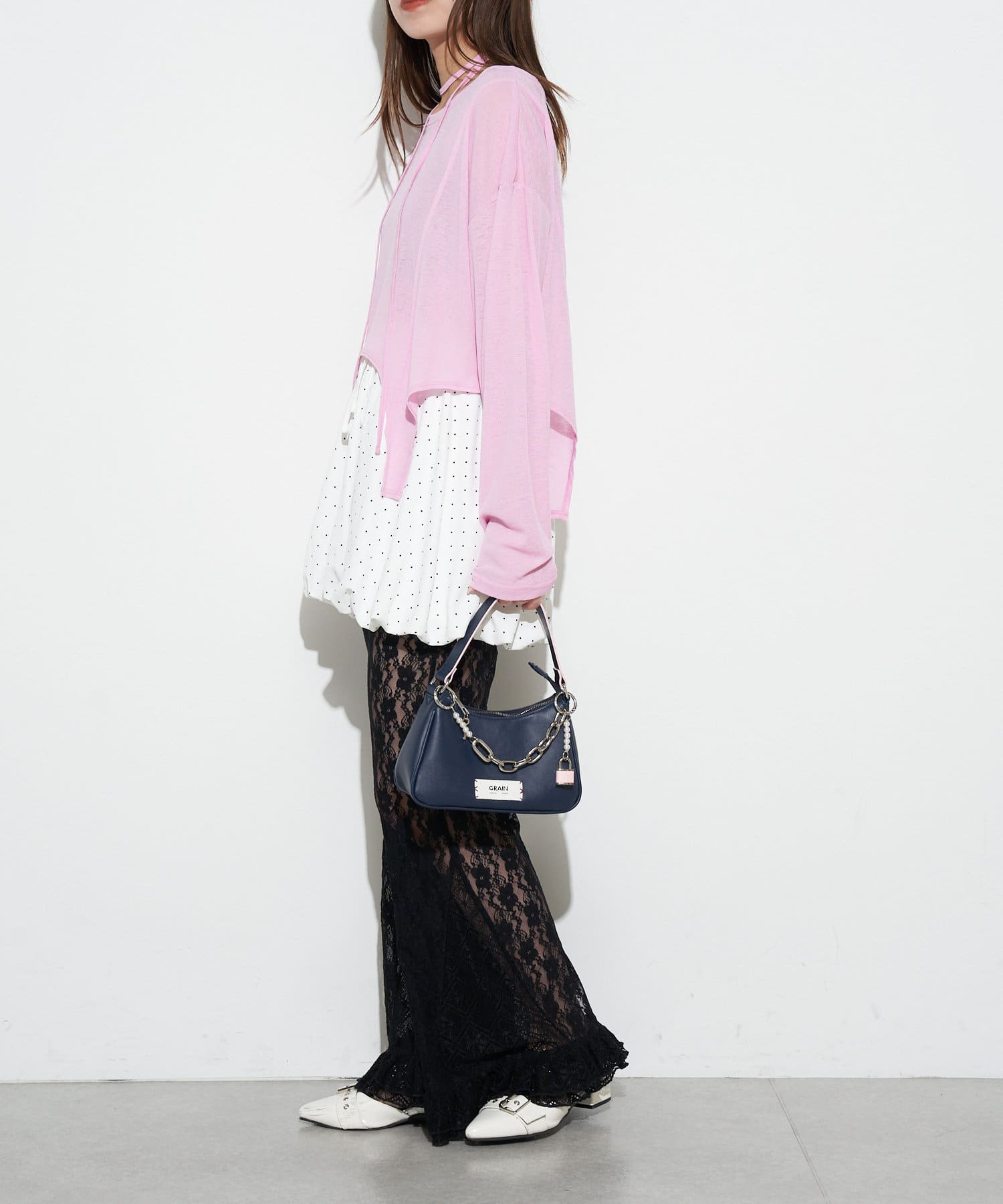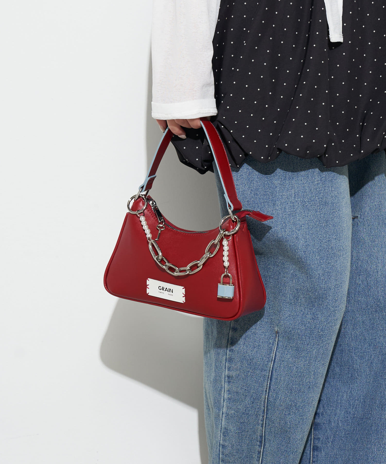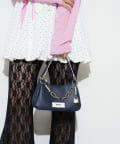 メタルとパールの異素材ミックスのチャームがアクセントになり、持つだけでこなれた印象に。