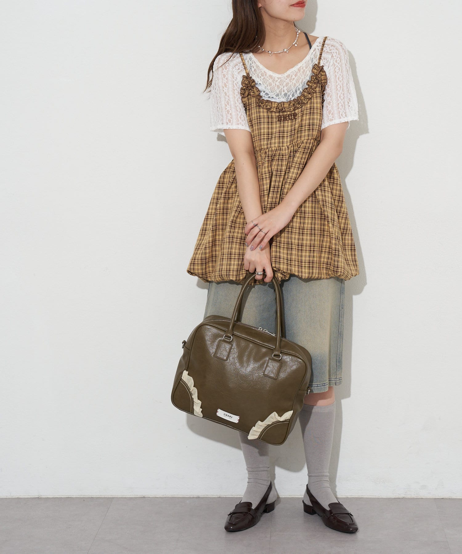 カジュアルなデニムスタイルに合わせて、バッグで甘さをひとさじ。