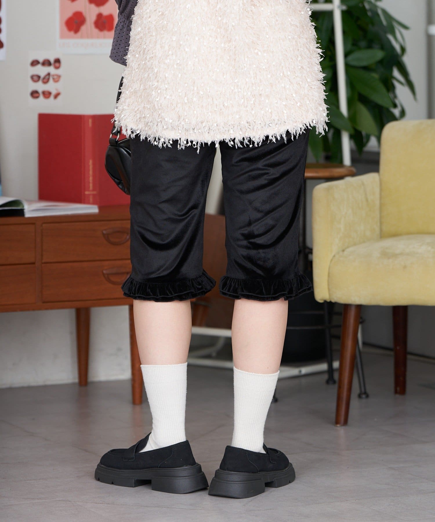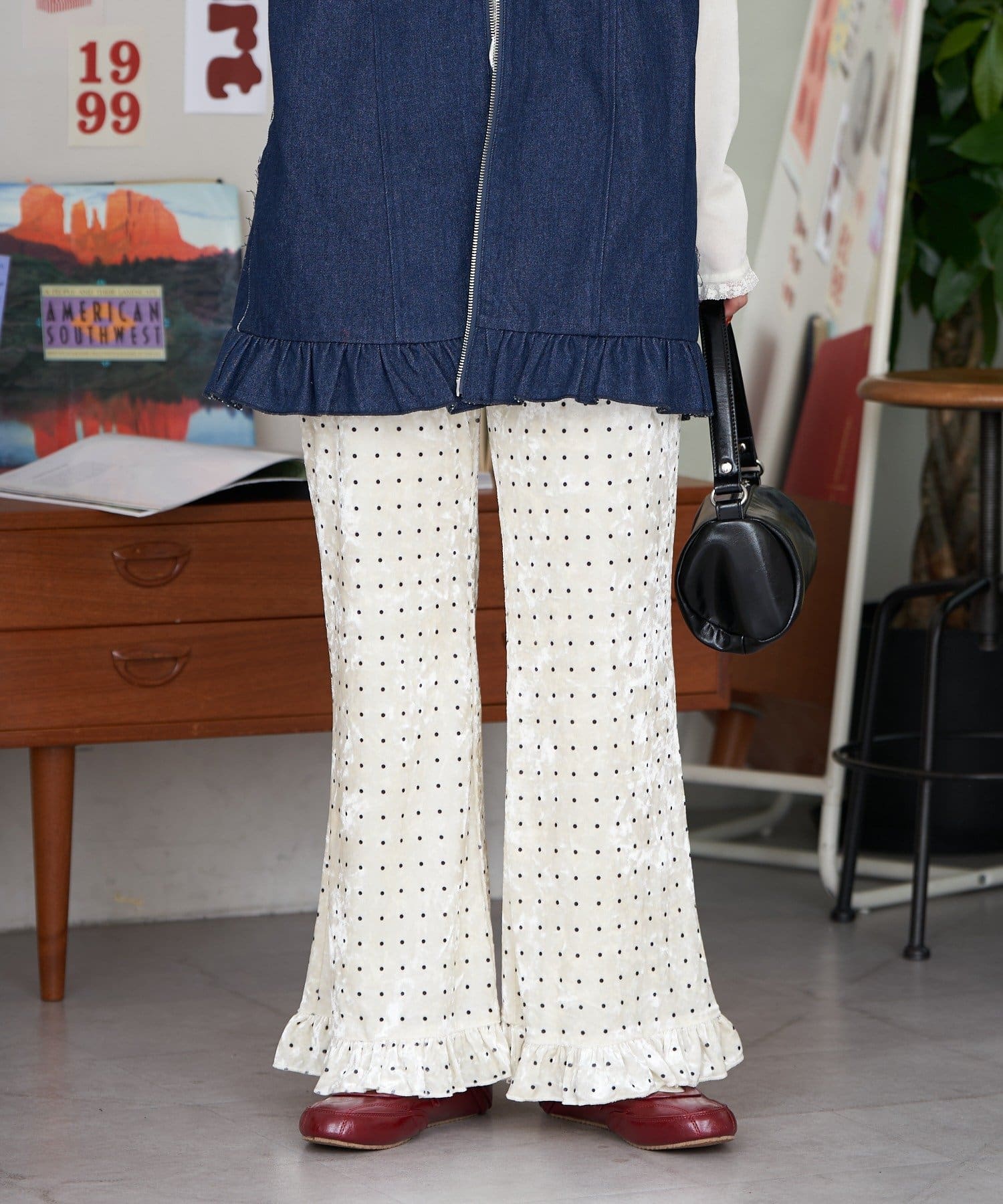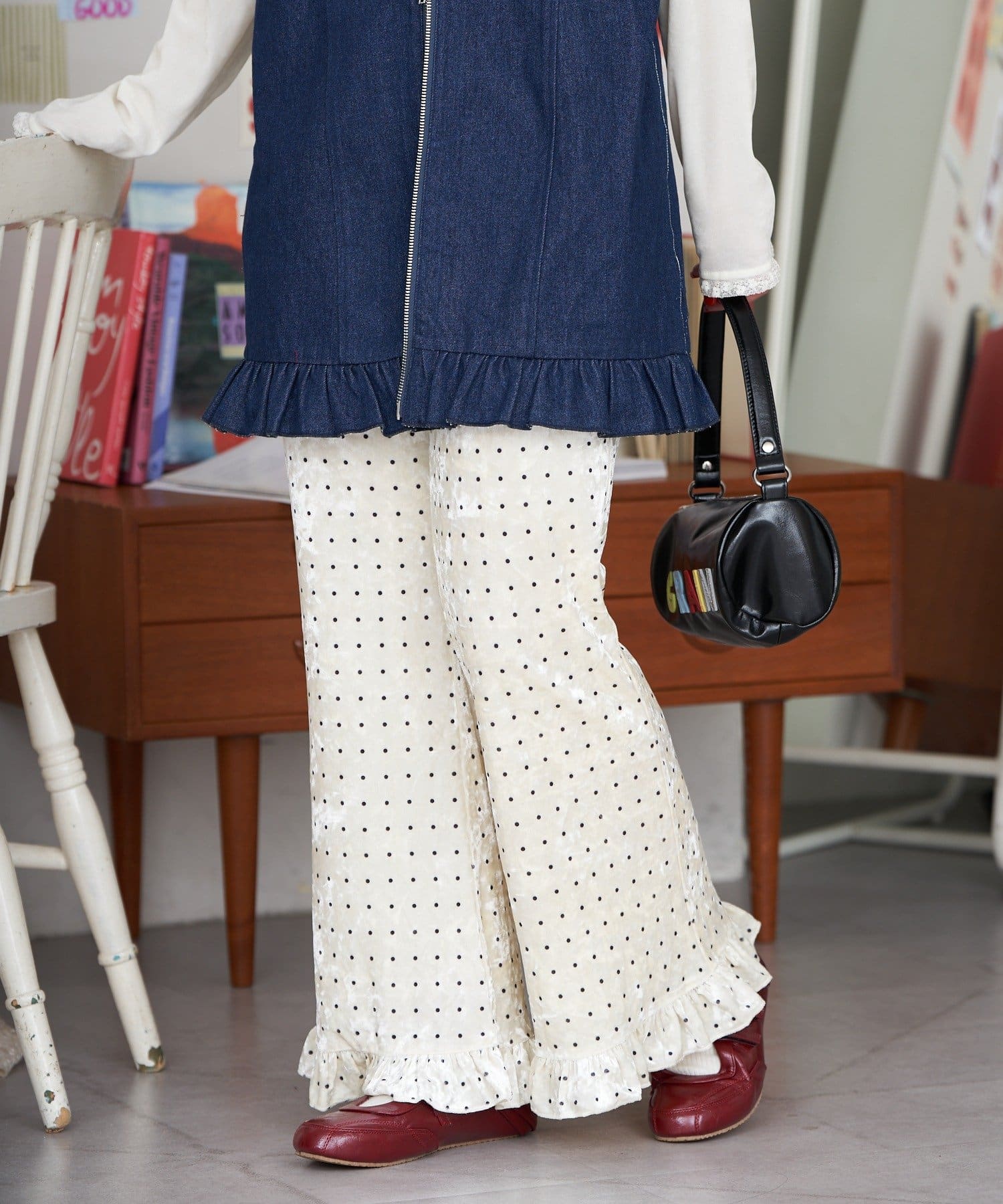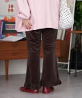 裾のフリルデザインが、コーデに旬のガーリーなムードをプラスするベロアパンツ。