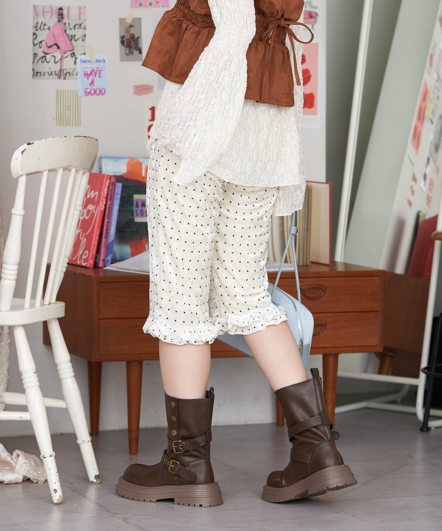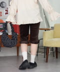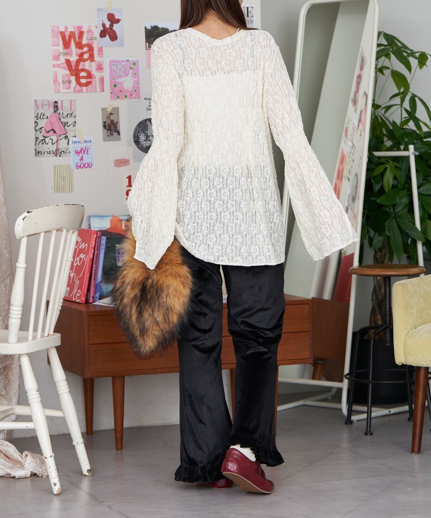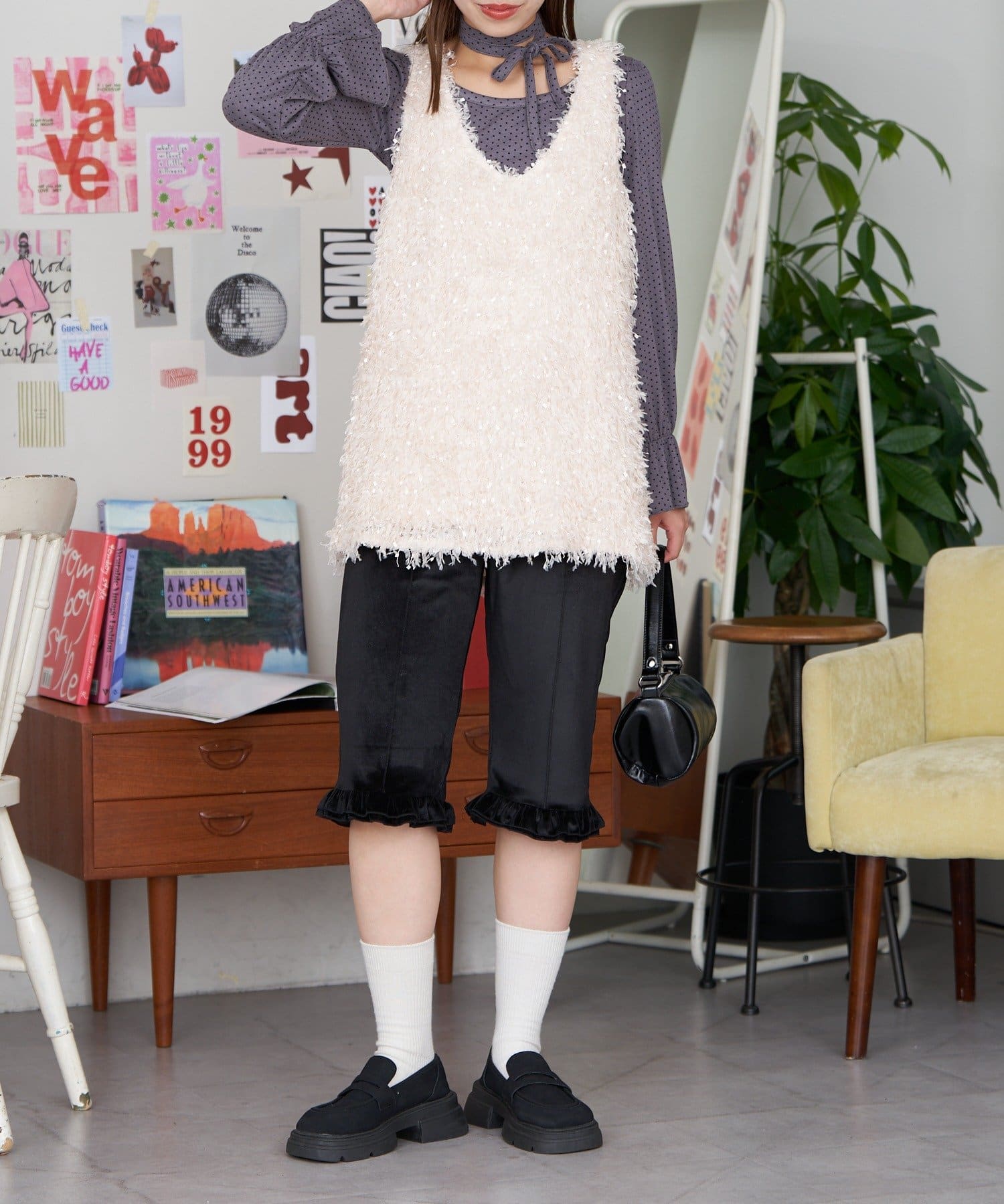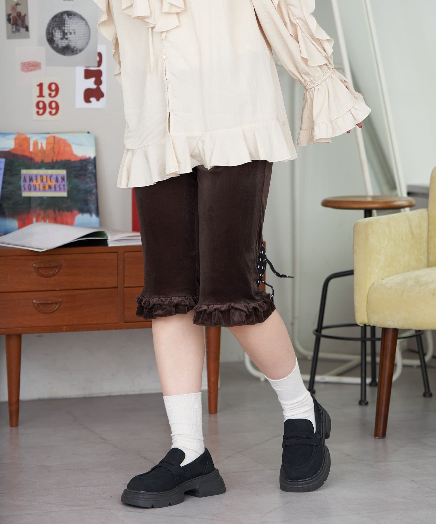 裾のフリルデザインが、コーデに旬のガーリーなムードをプラスするベロアパンツ。