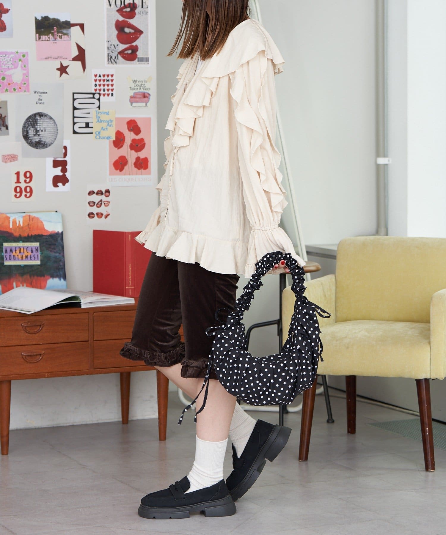 光沢のあるベロア調の生地を使用し、カジュアルながらも上品な印象に。