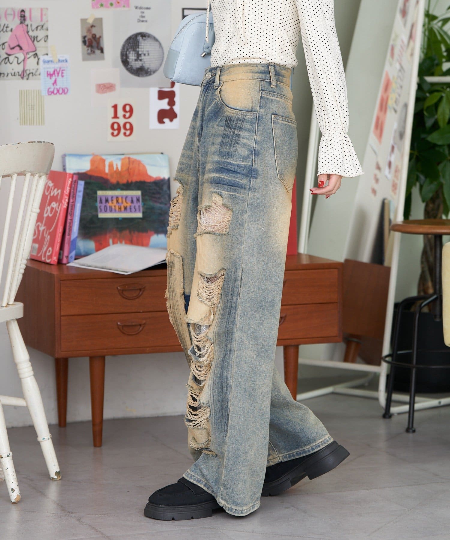 大胆なダメージ加工に、裏側の繊細なレースが華やかさをプラス。