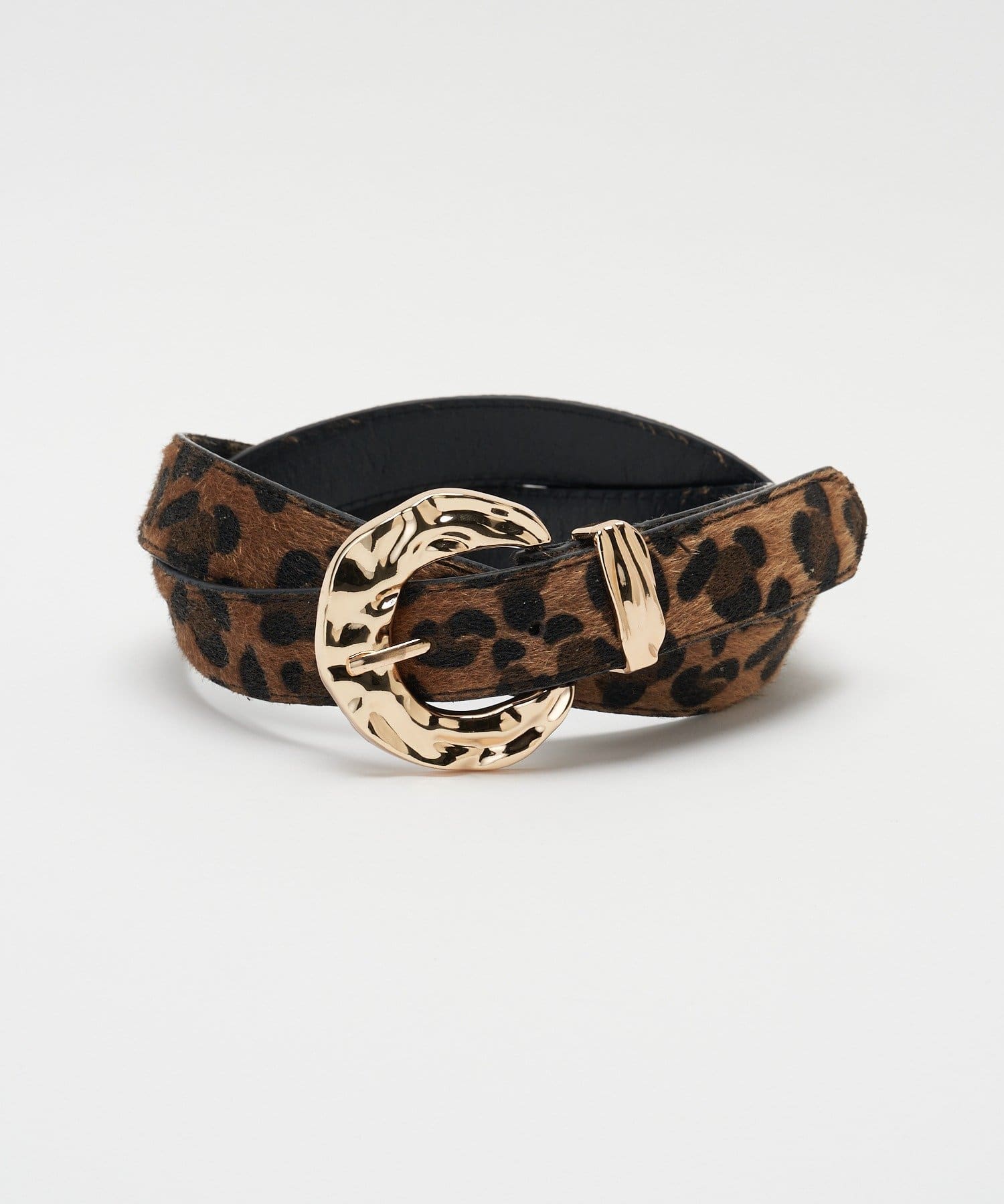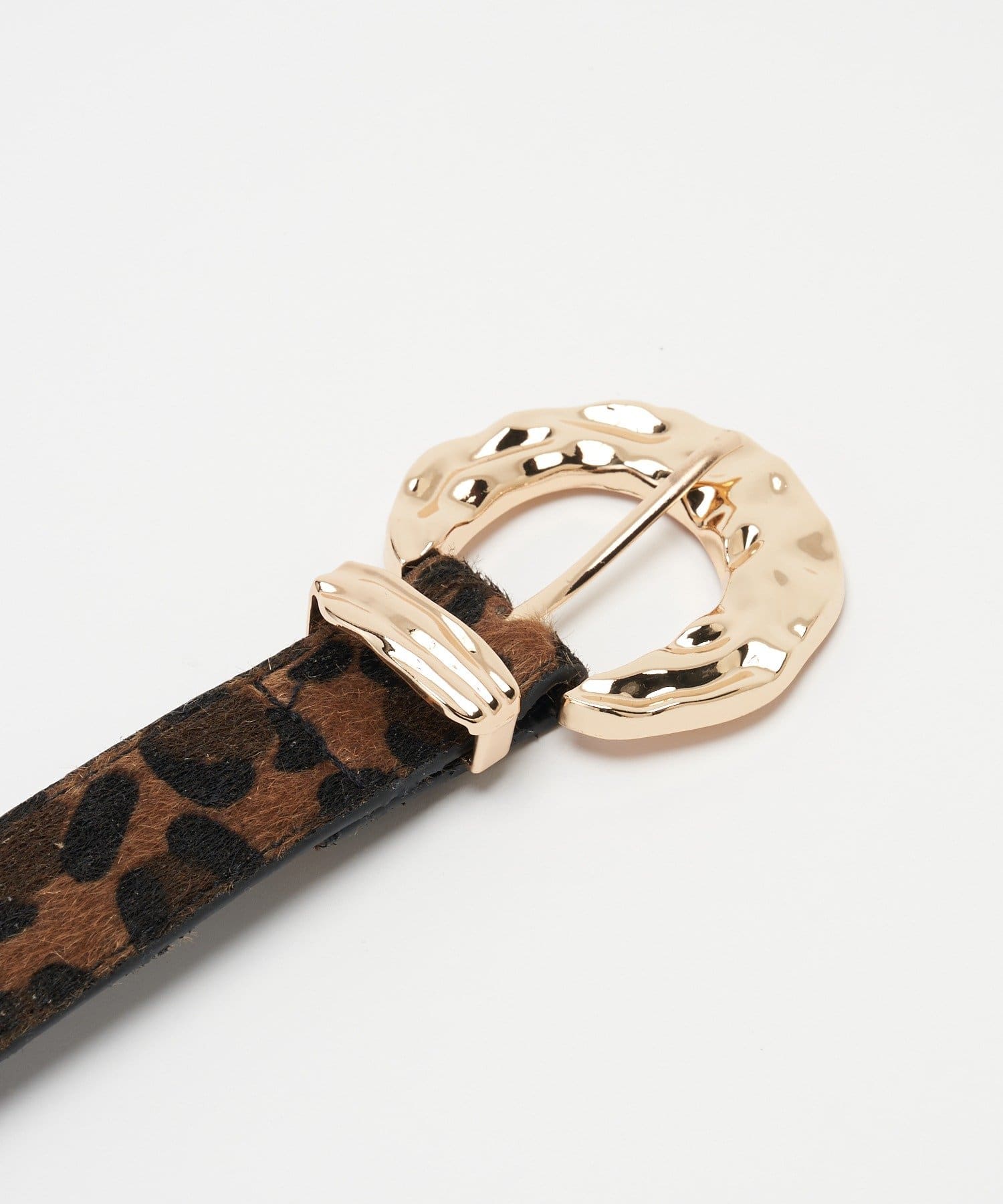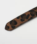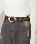 レオパード柄の細身ベルトに、存在感のあるゴールドバックルを合わせた一本。