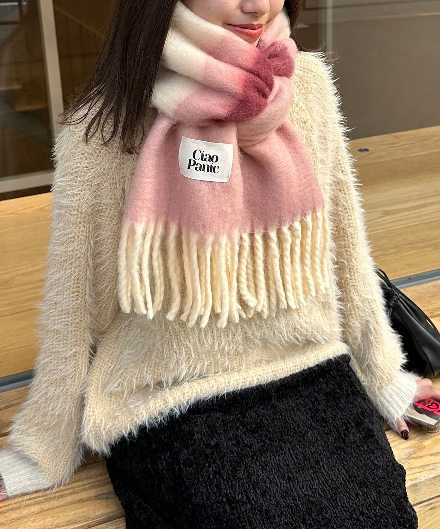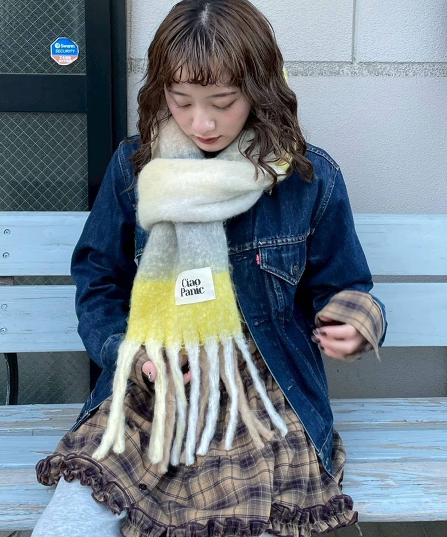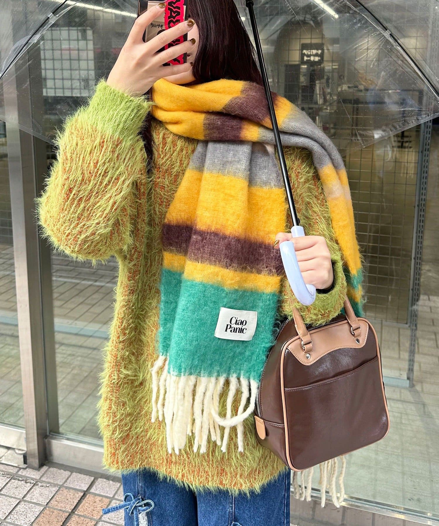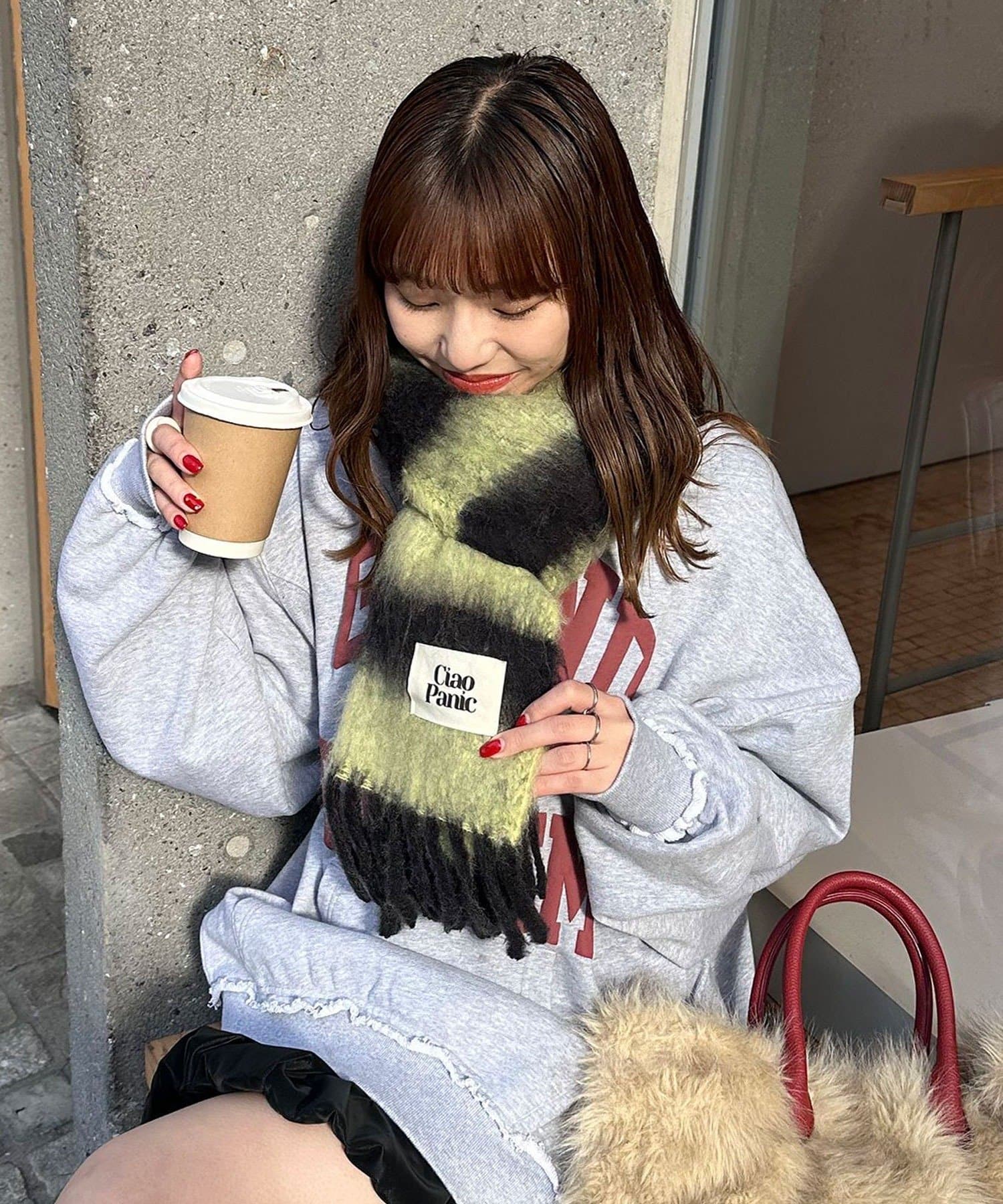 軽さと保温性を兼ね備えたシャギー素材のオーバーマフラーは、肌触りが良く防寒性もバッチリ。