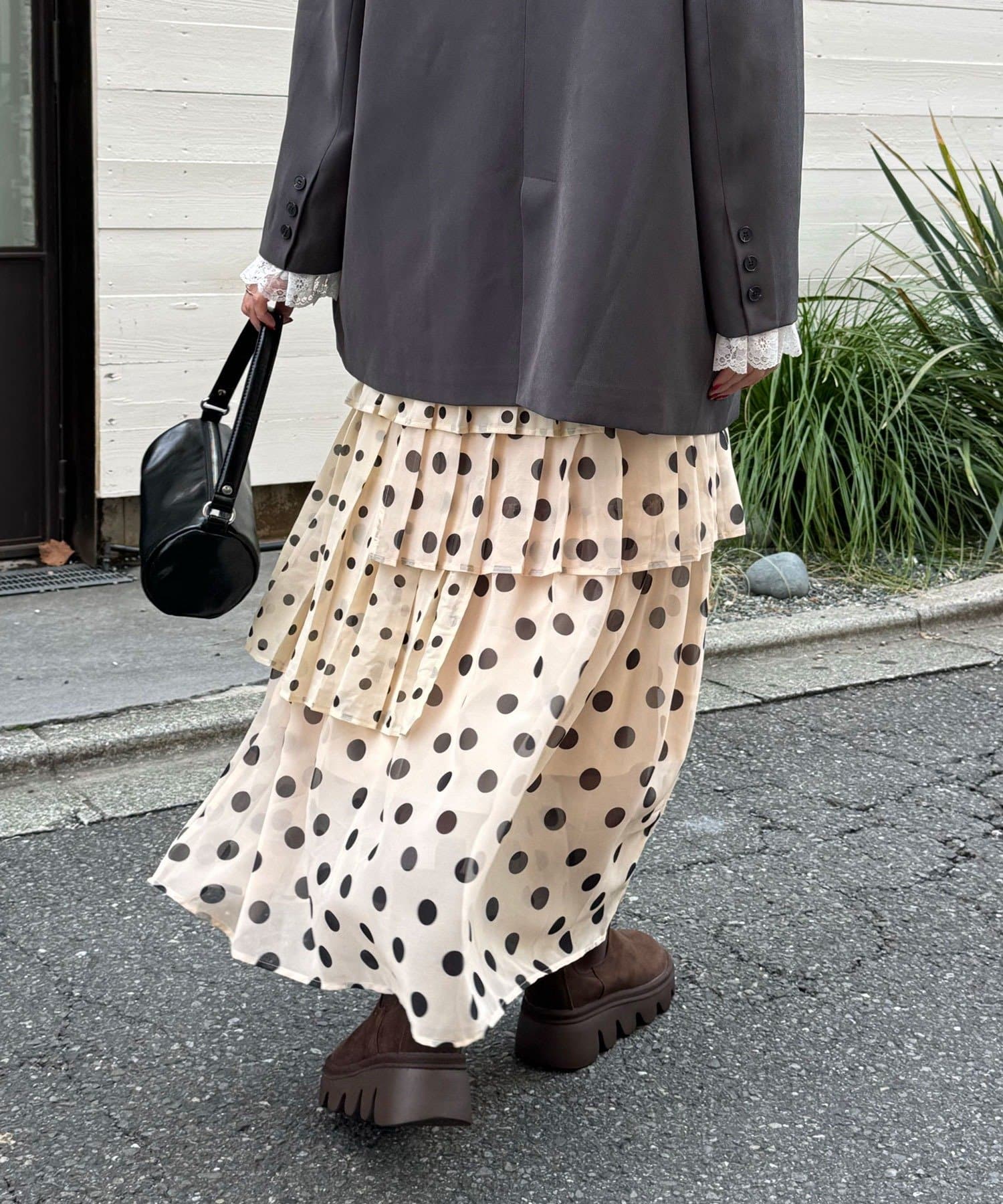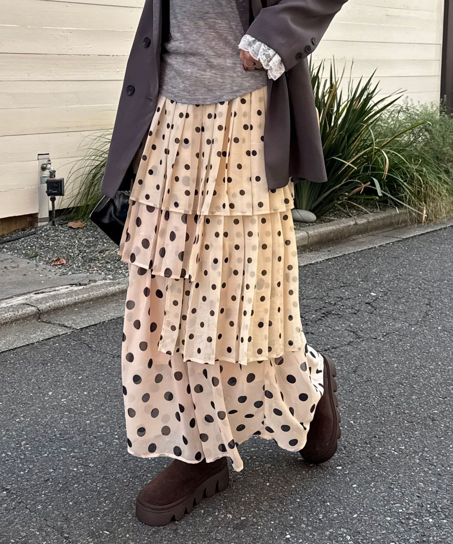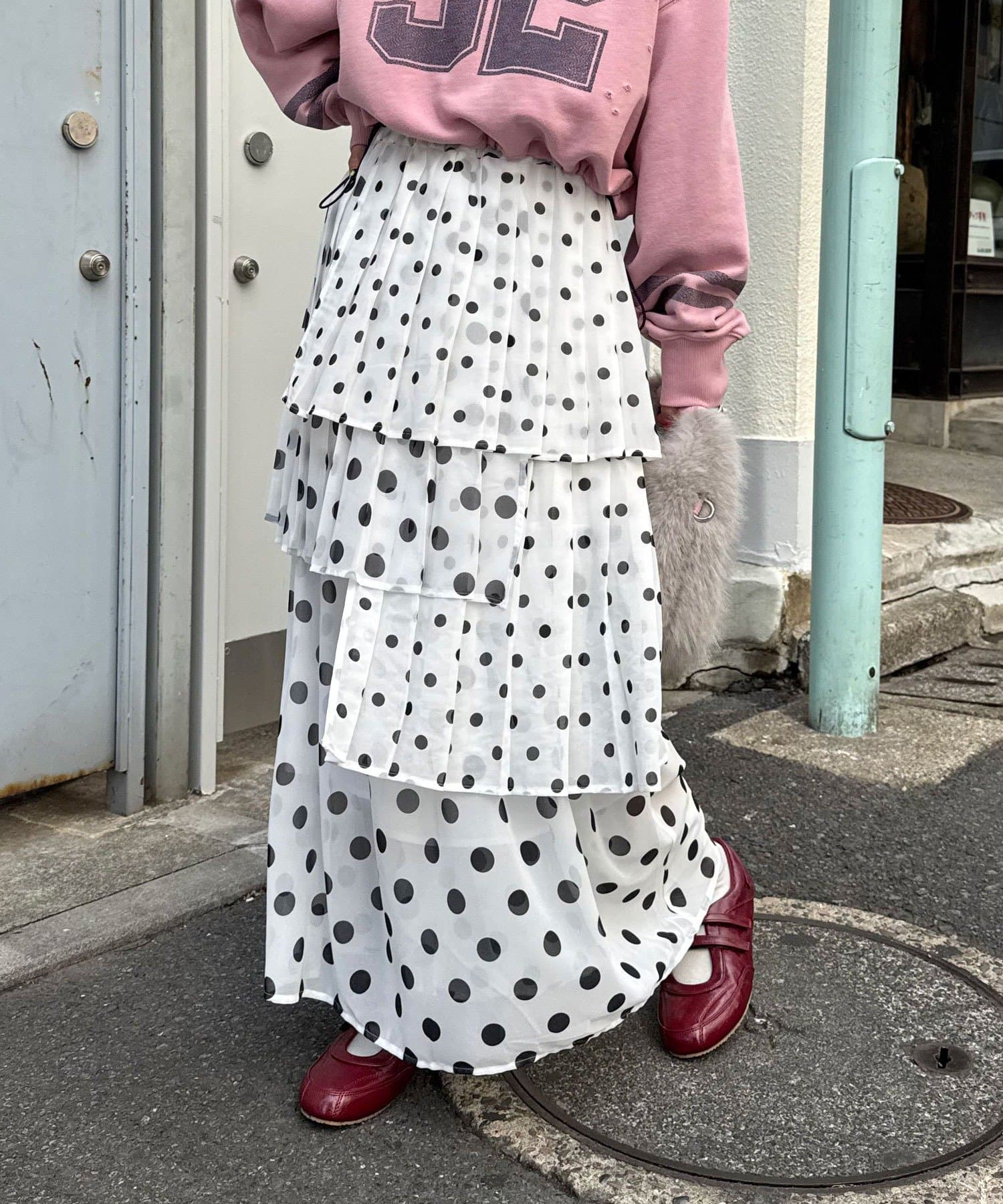 ドット柄のプリーツ生地をたっぷり使ったティアードスカート。