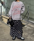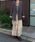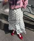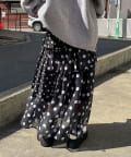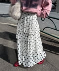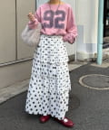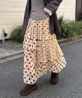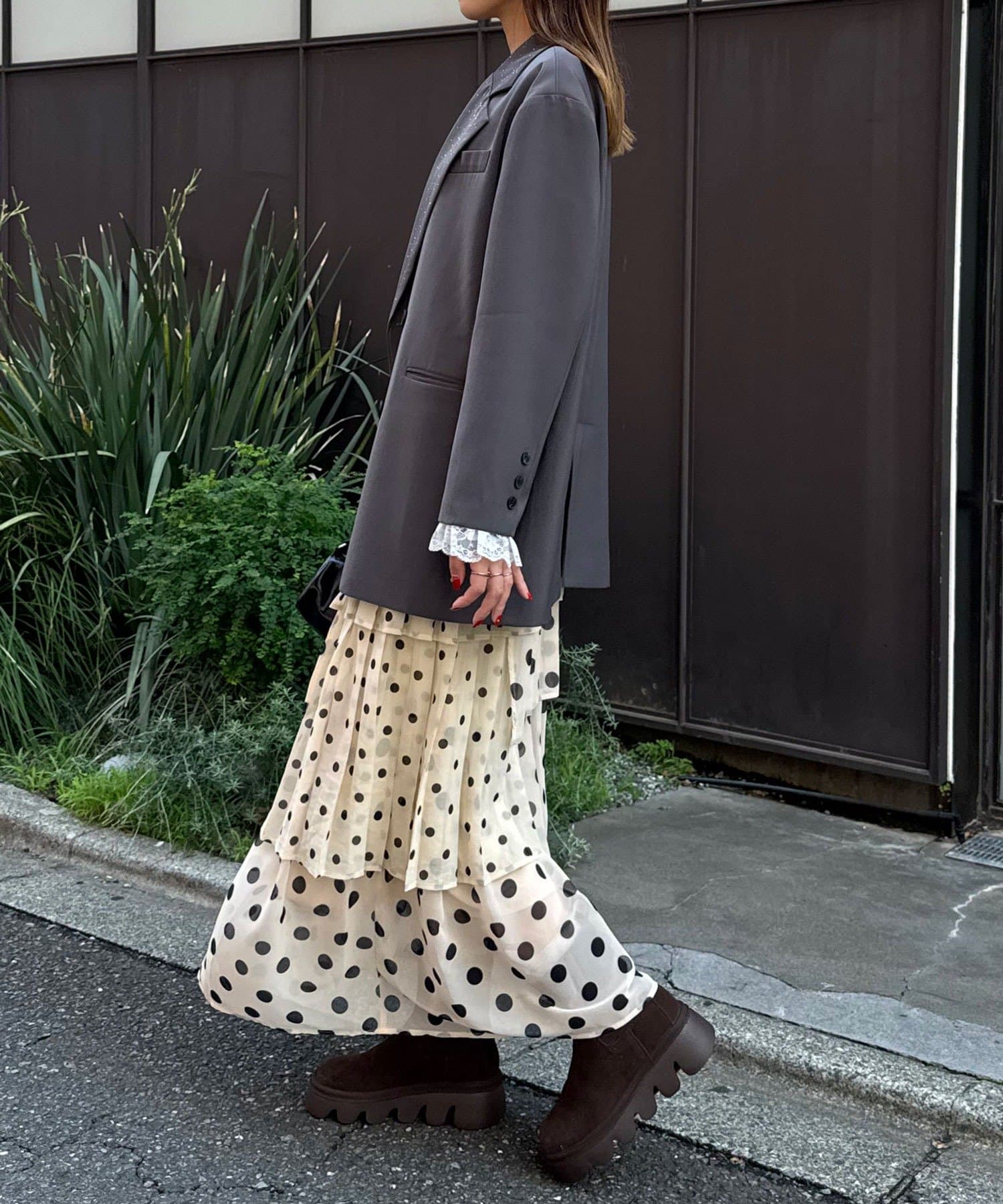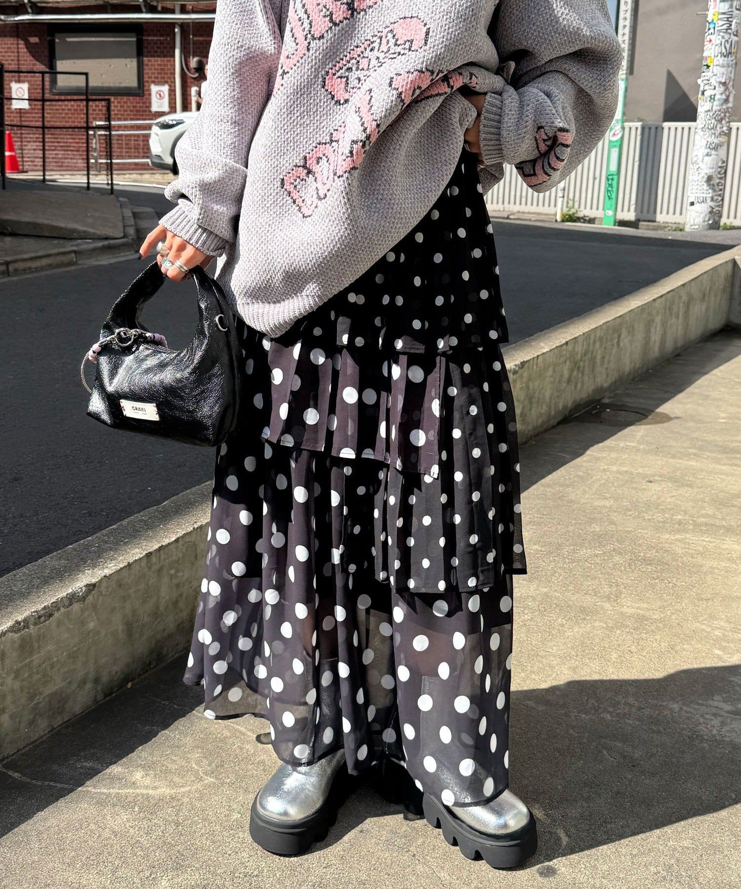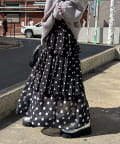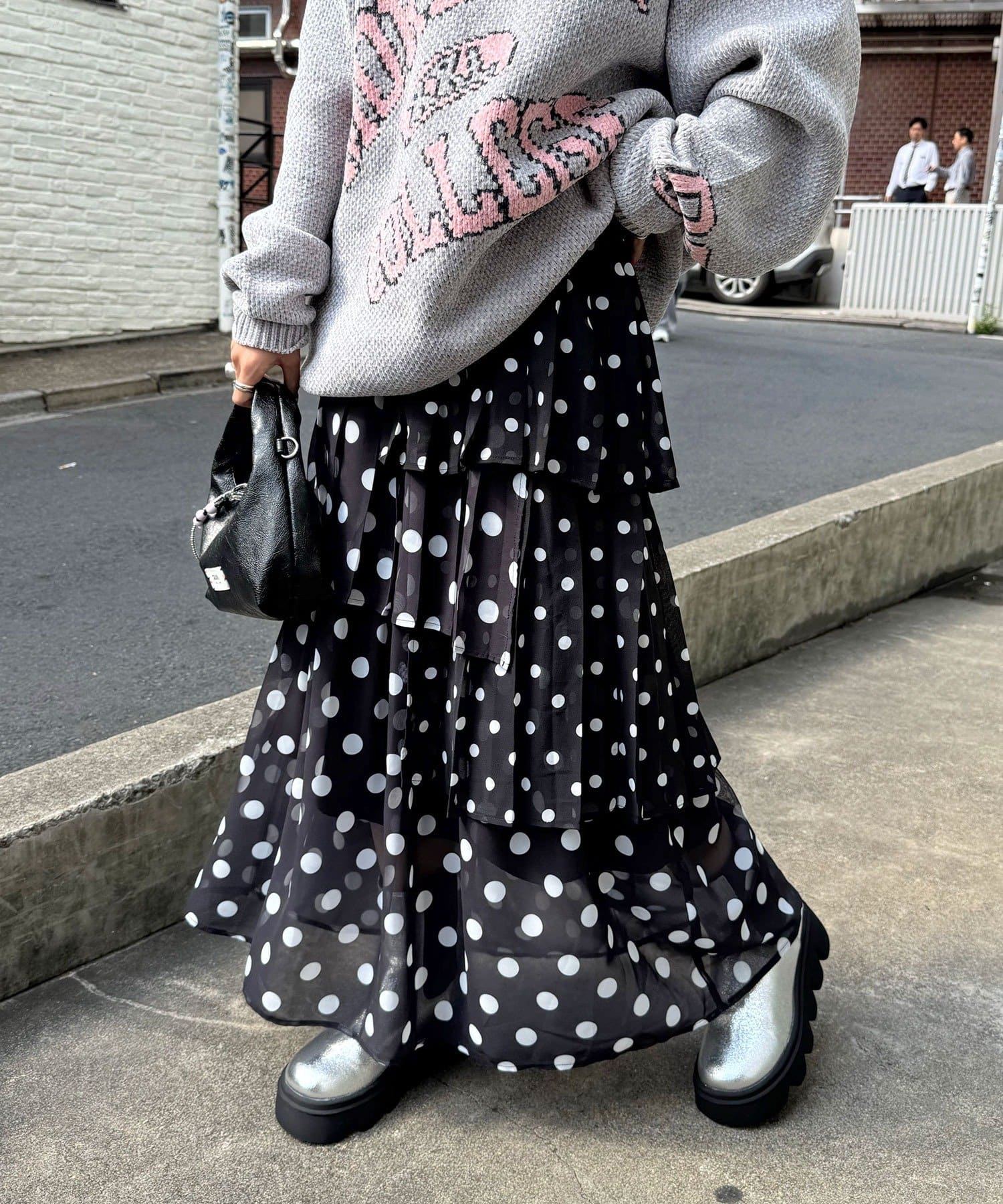ドット柄のプリーツ生地をたっぷり使ったティアードスカート。