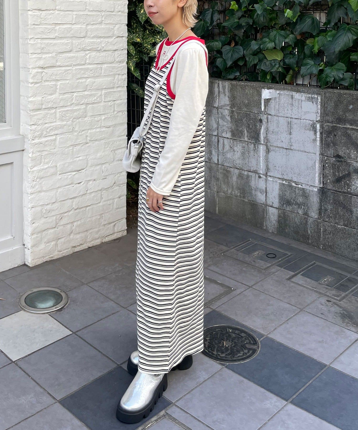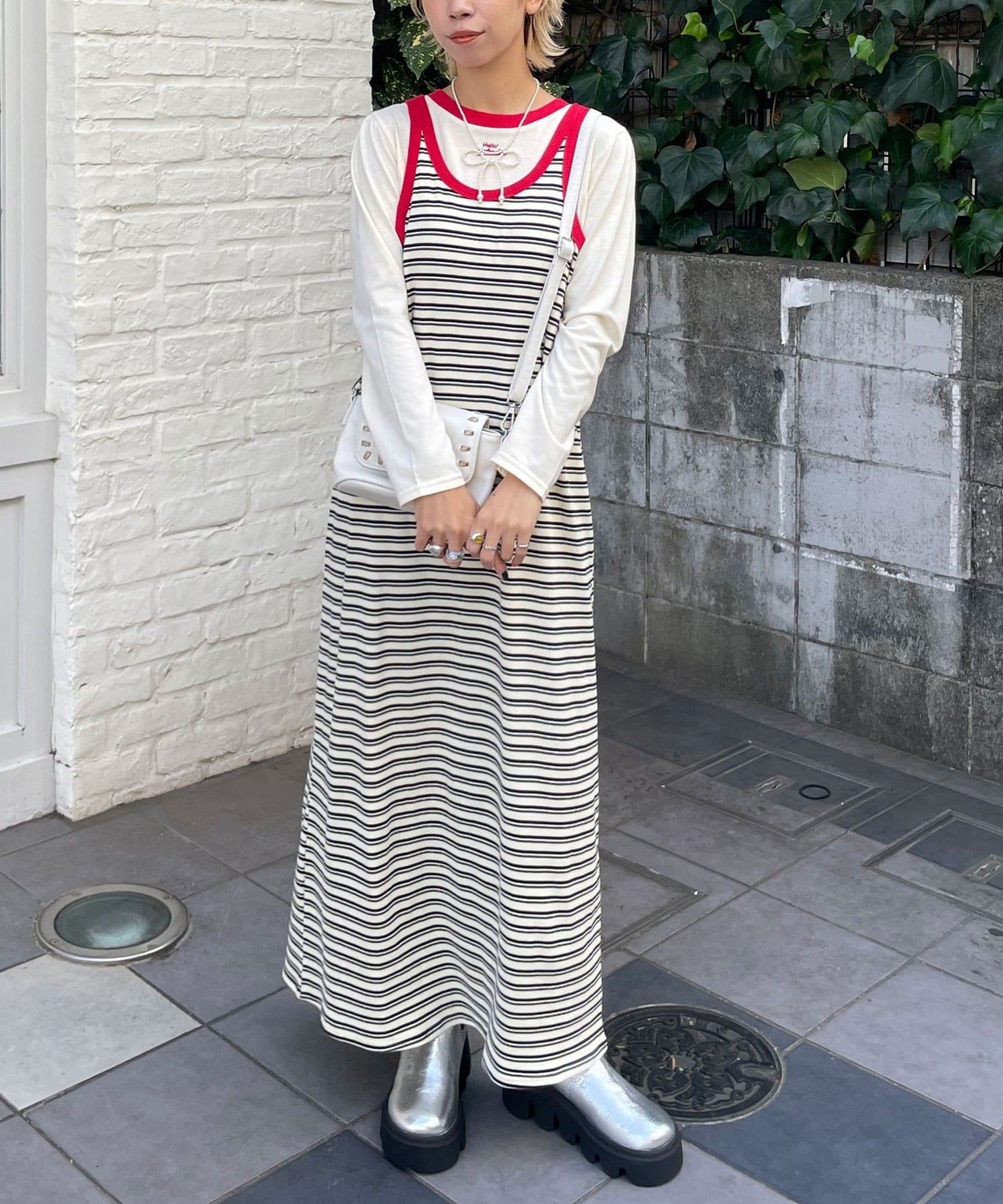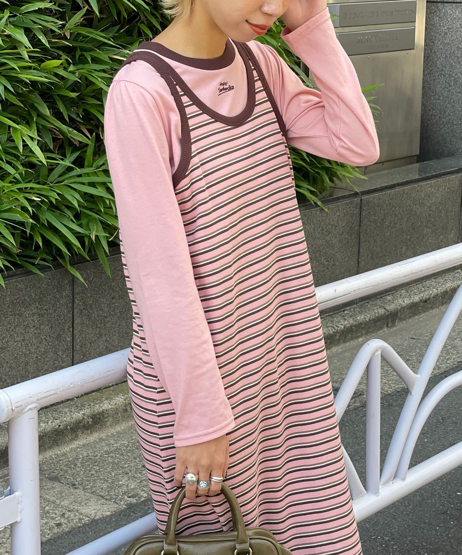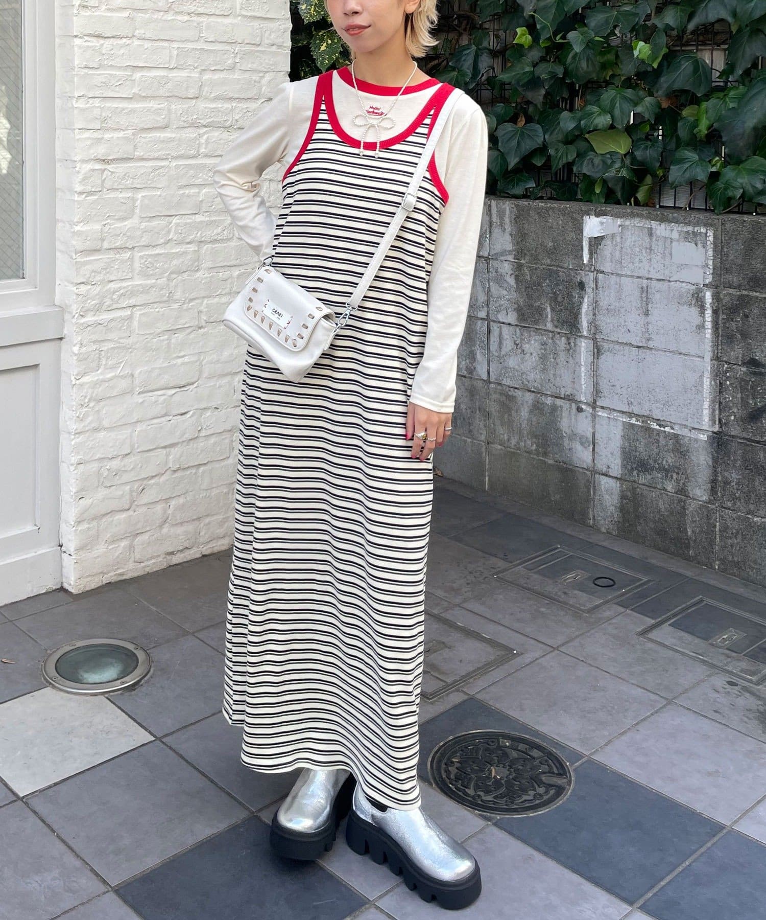 ボーダーキャミワンピ×ロンTのセットアイテム。