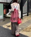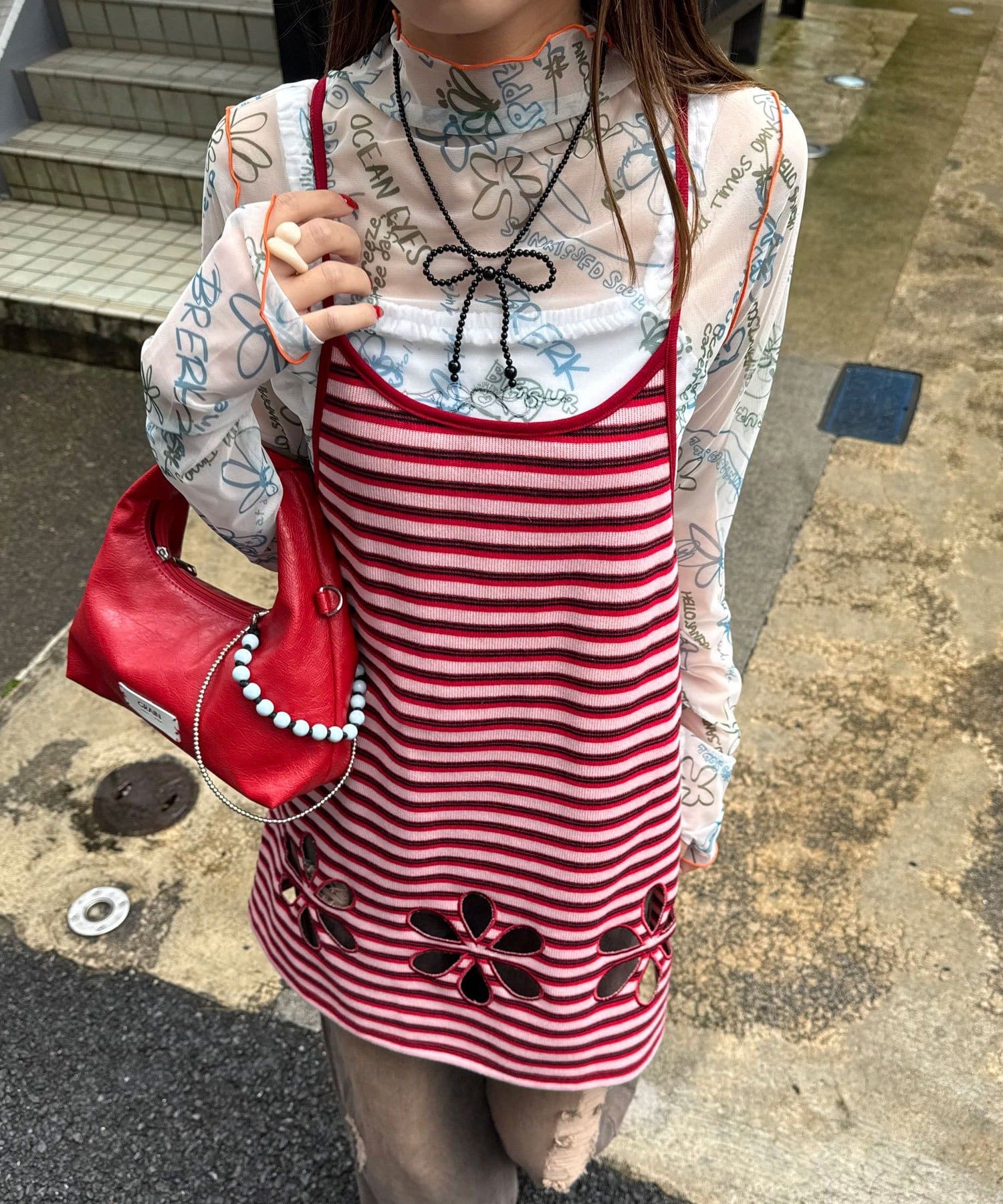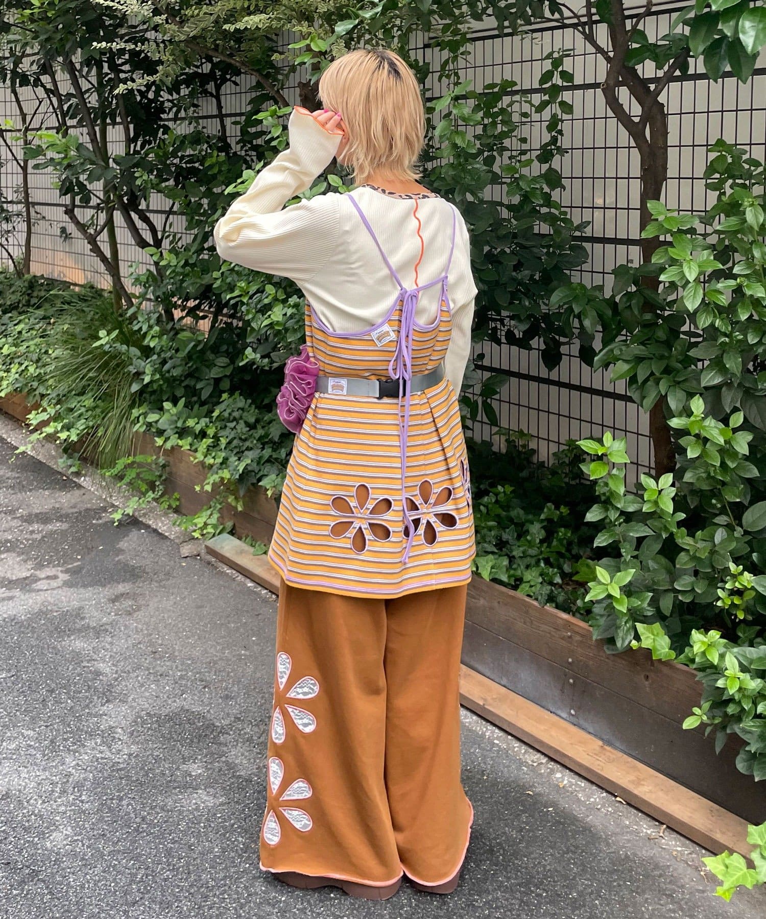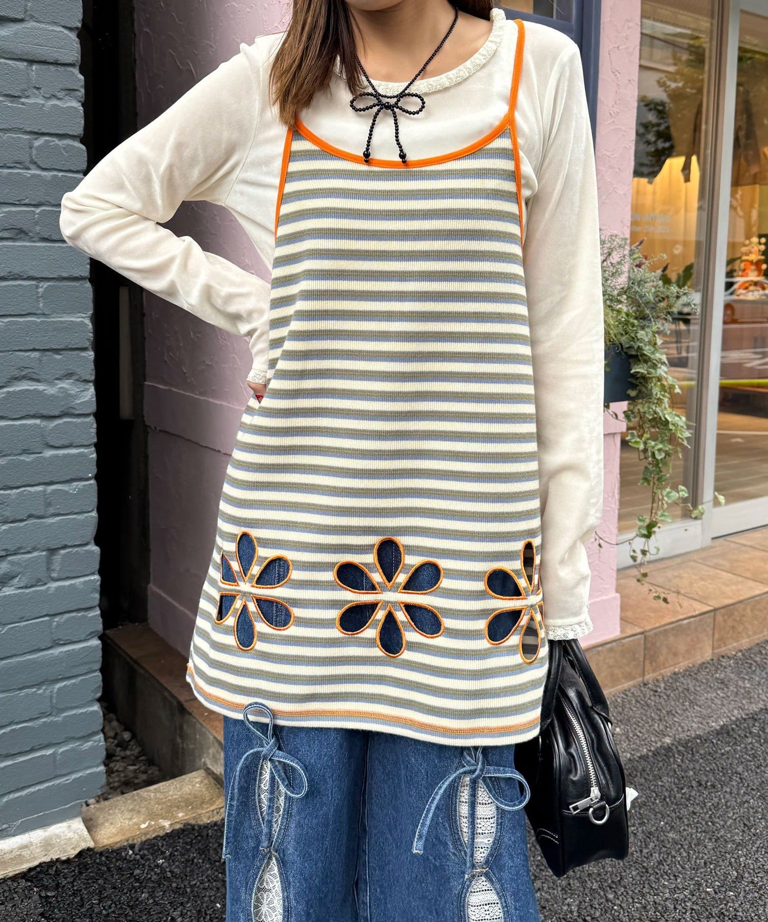 ボーダー柄キャミの裾にフラワーカットアウトをプラス。