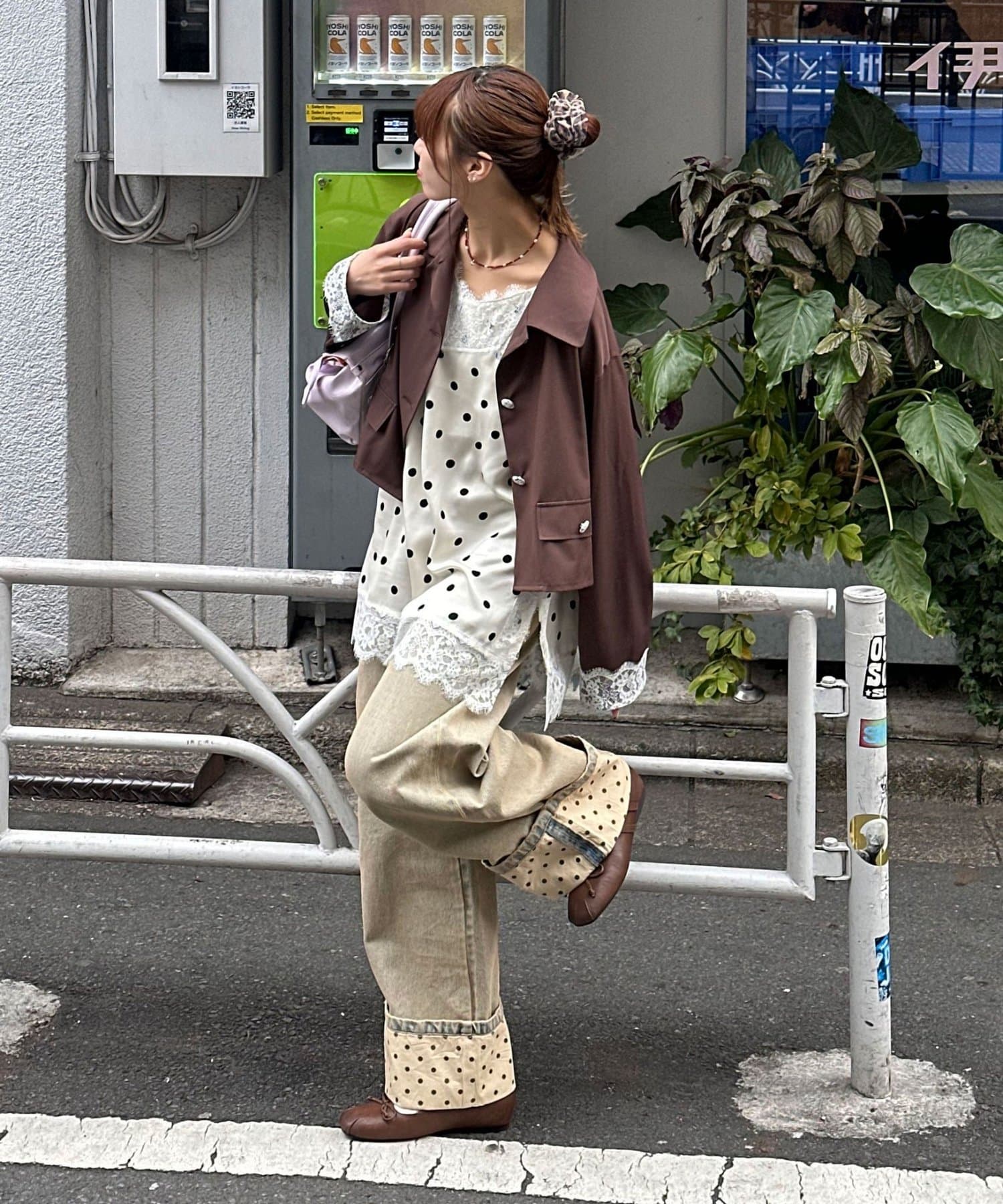 ロールアップされた裾から覗くドット柄が目を引く、主役級ワイドデニムパンツ。