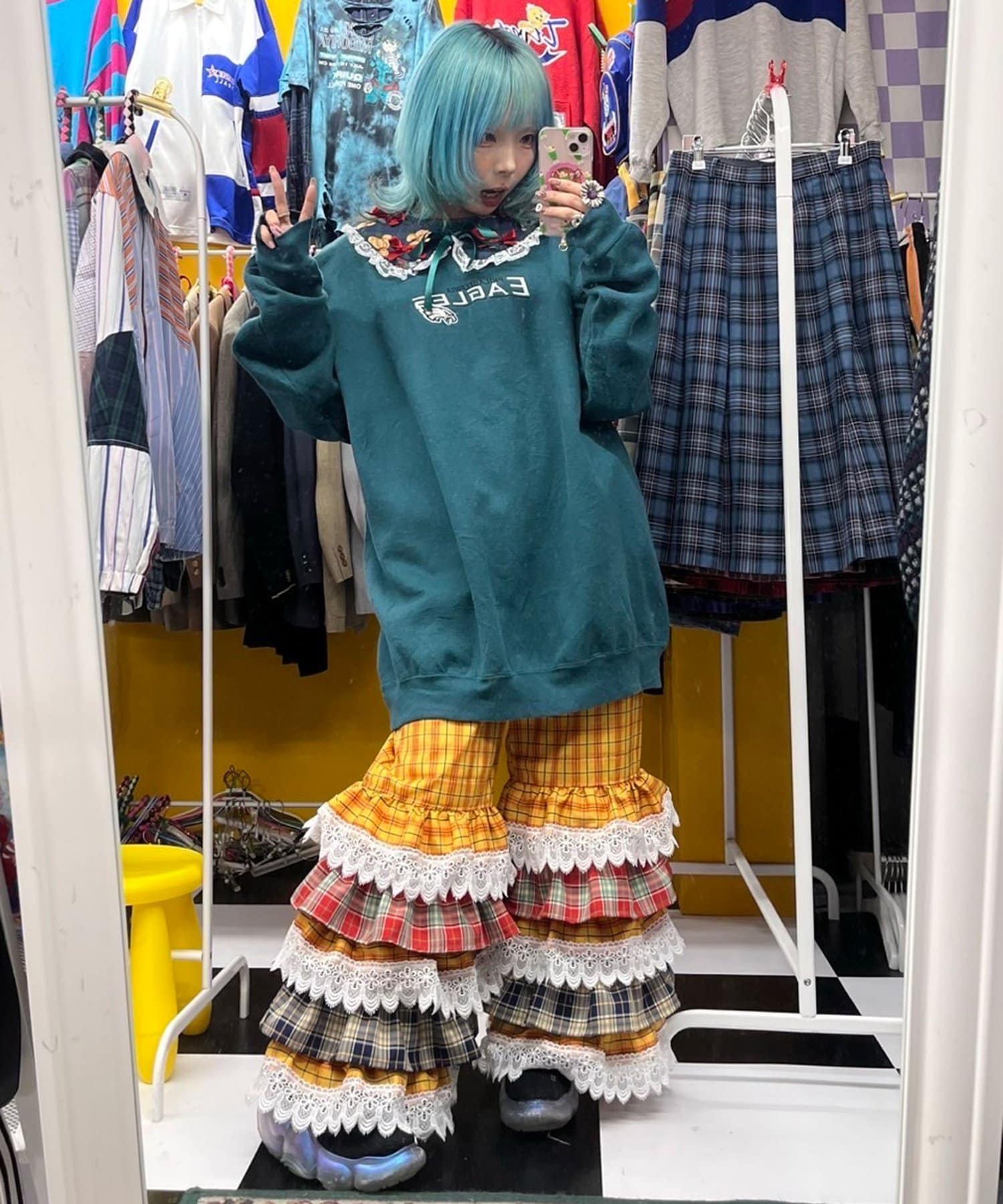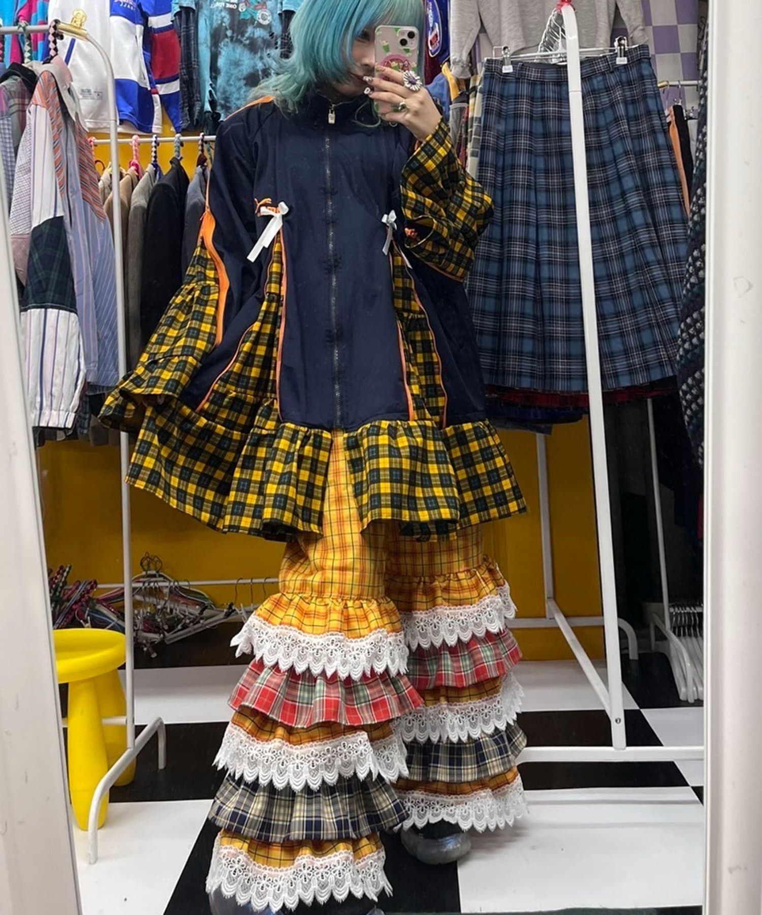 チェック柄×レースを大胆に組み合わせた、フリルデザインパンツ。