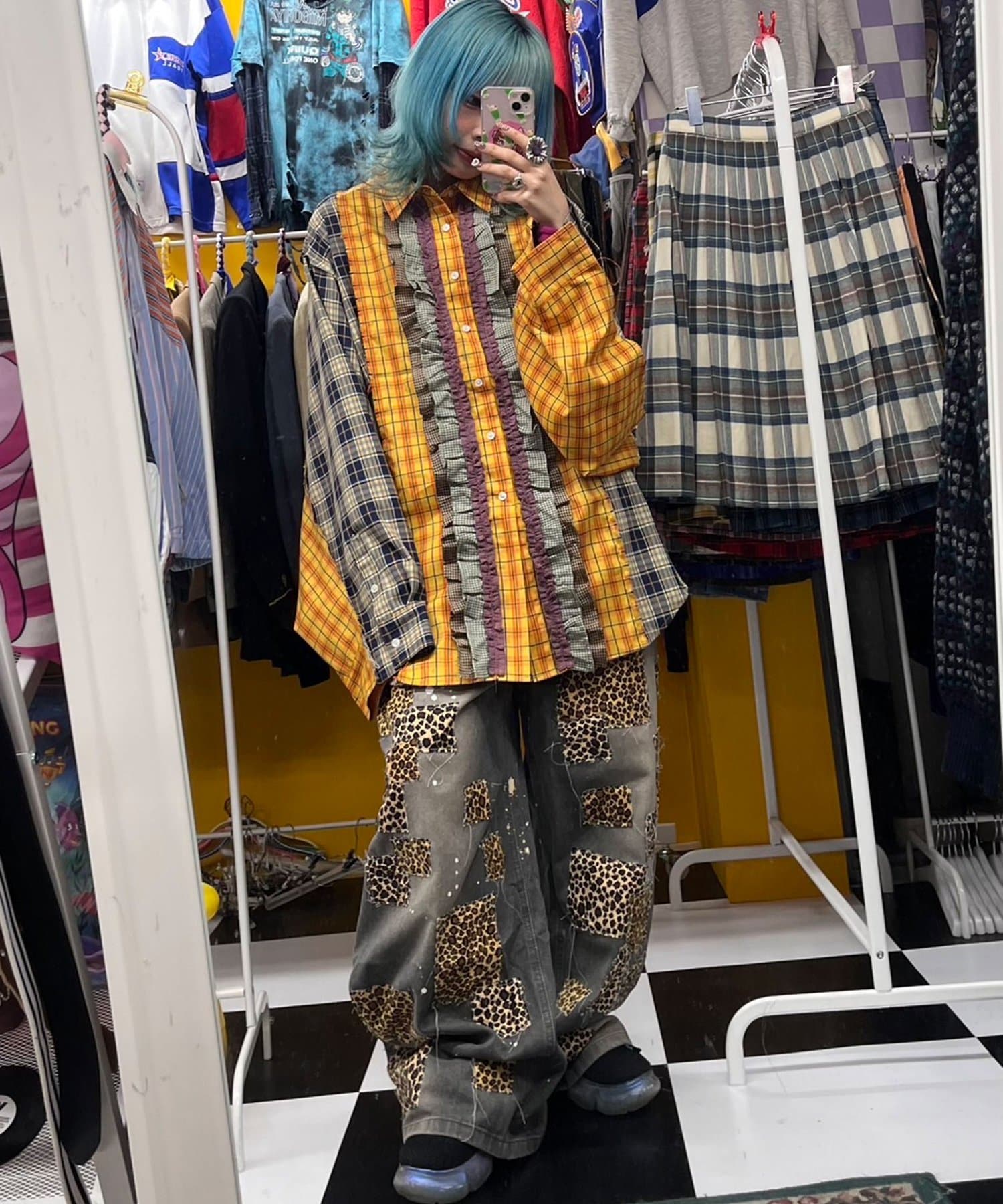 2着のシャツをドッキングして仕上げた、リメイクデザインフリルシャツ。