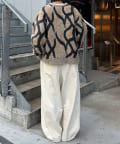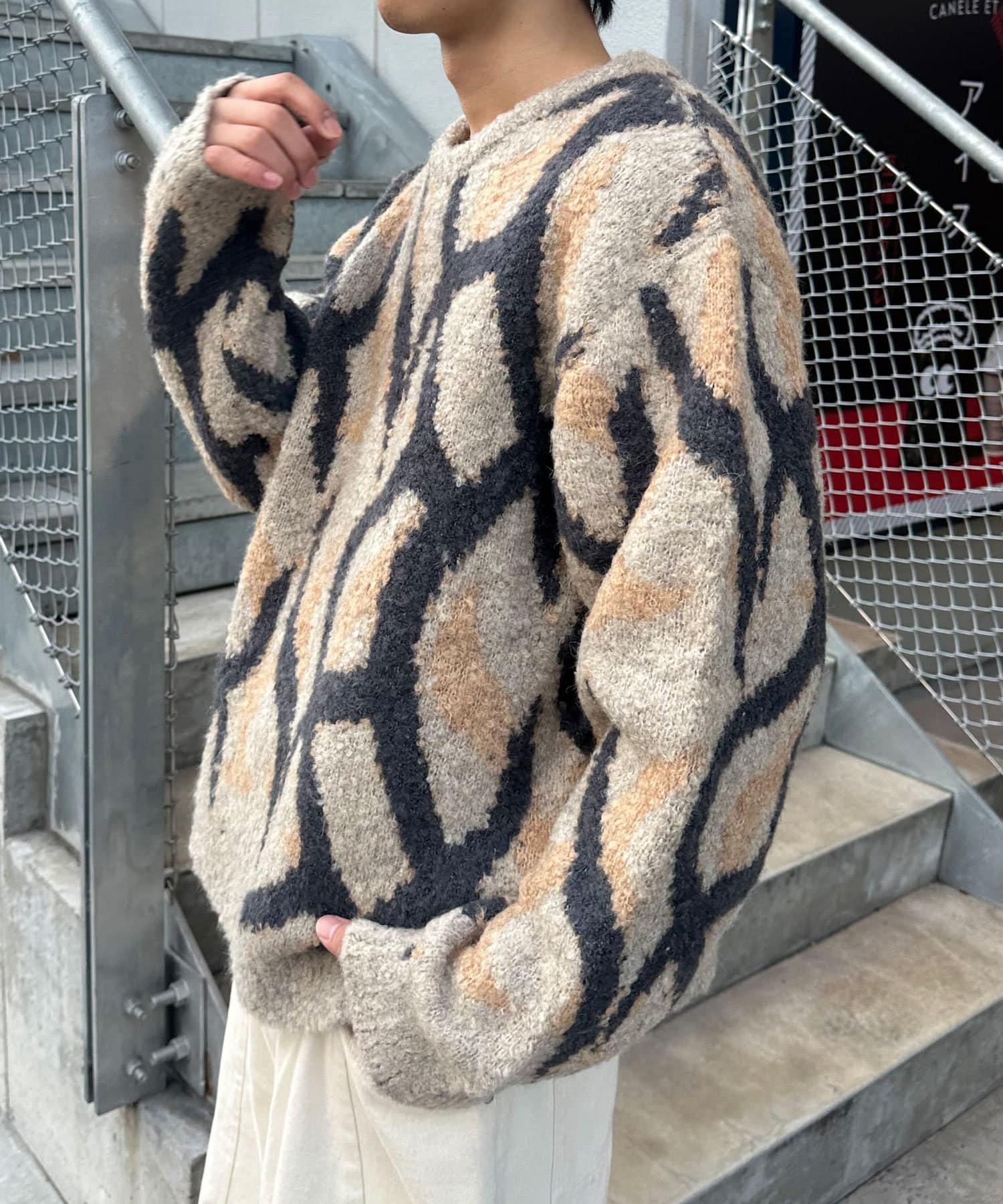 遊び心満載のカモフラージュ柄、トライバル柄を取り入れた、旬なデザインニット。