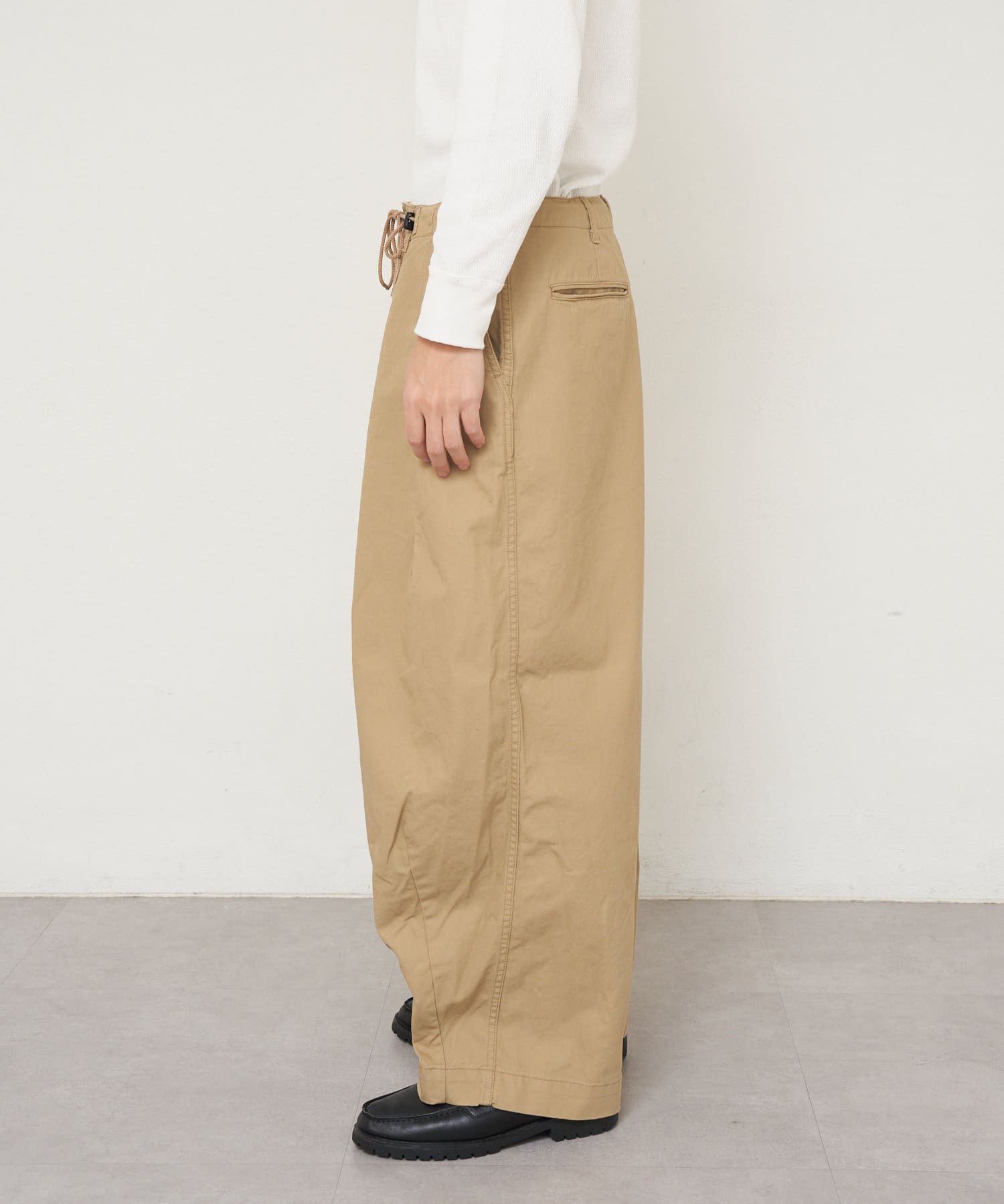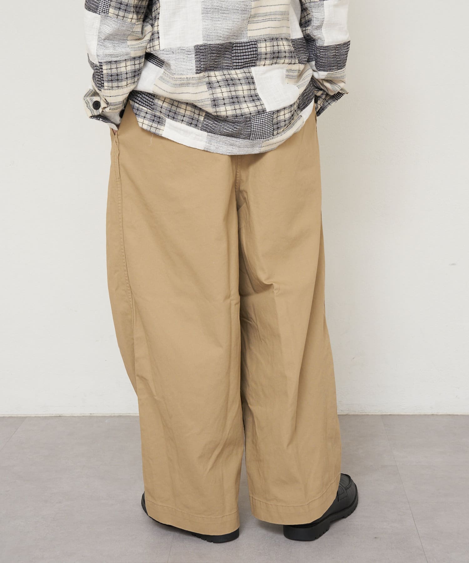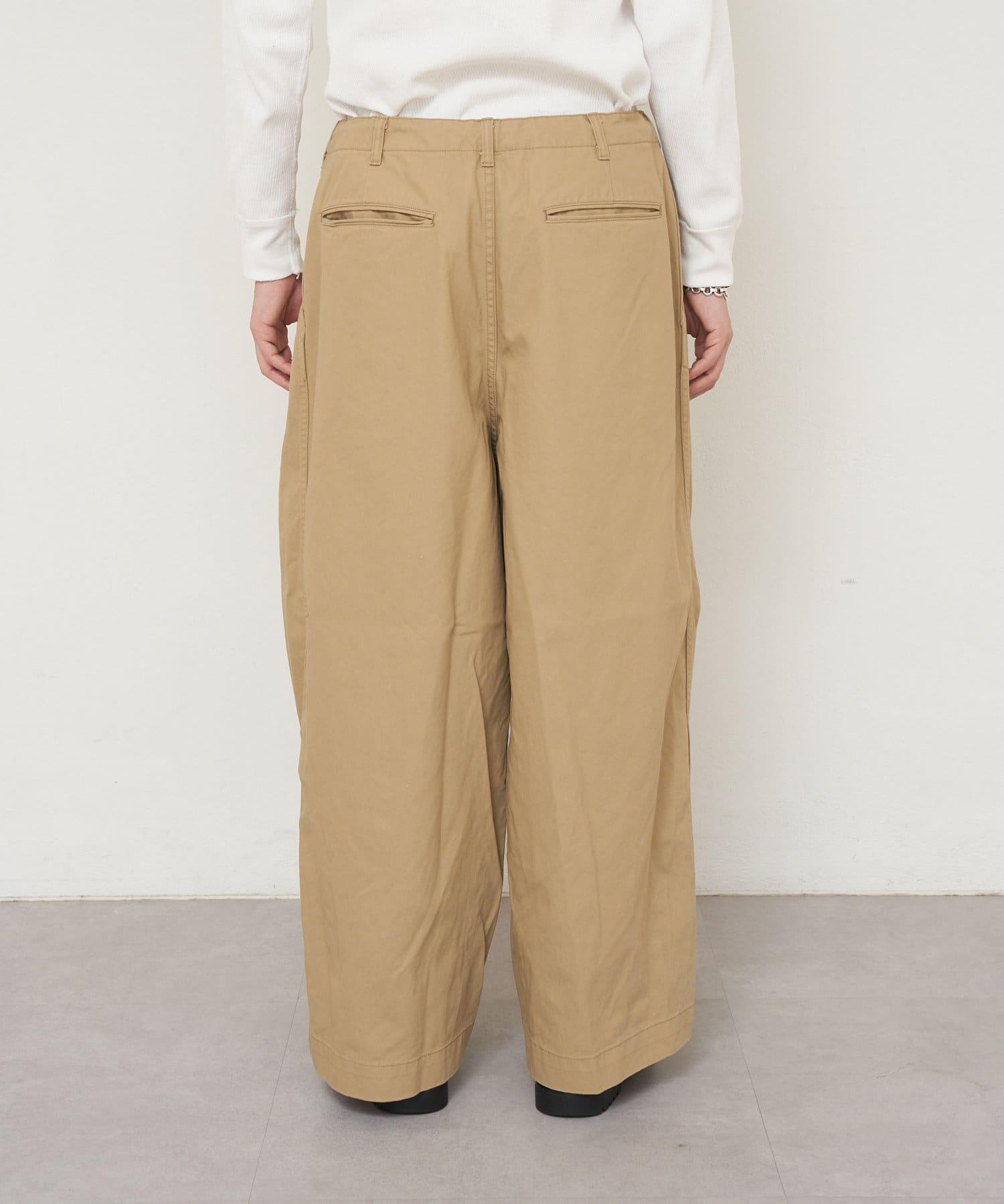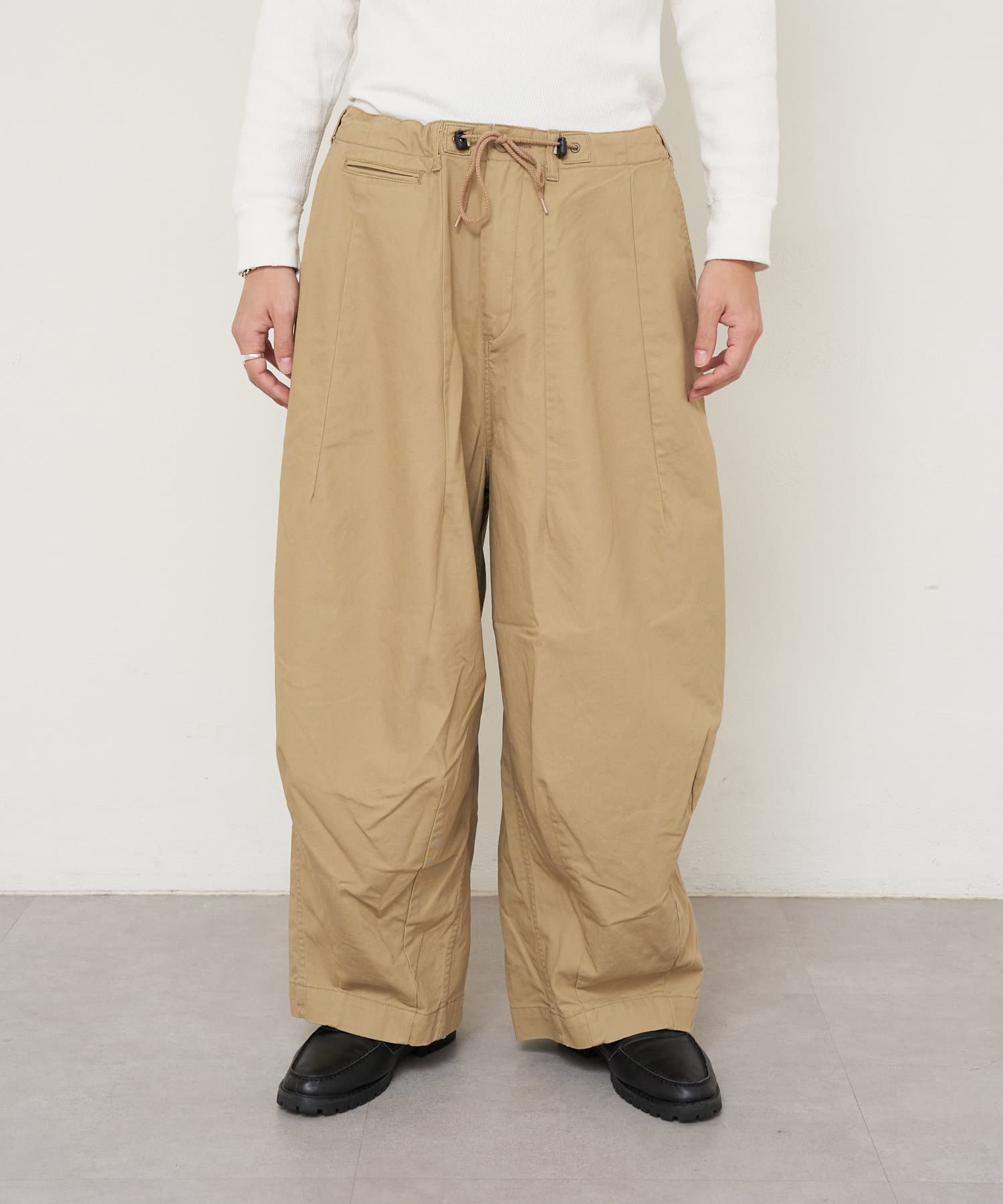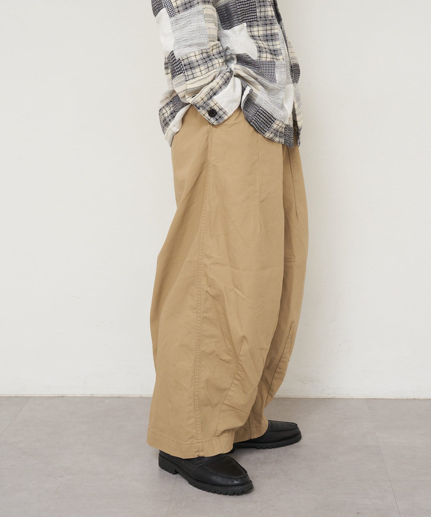 ウエストと裾のダーツ処理によりフロントが大きくふくらんだ独特のシルエットが魅力の人気アイテムH.D. パンツ。リラックス感のあるワイドなシルエットで、締め付けのない開放感のある履き心地も魅力的です。さまざまなデザイン・バリエーションで展開されていますが、シンプルなチノトラウザーズをベースにしたベーシックなデザインとなっています。