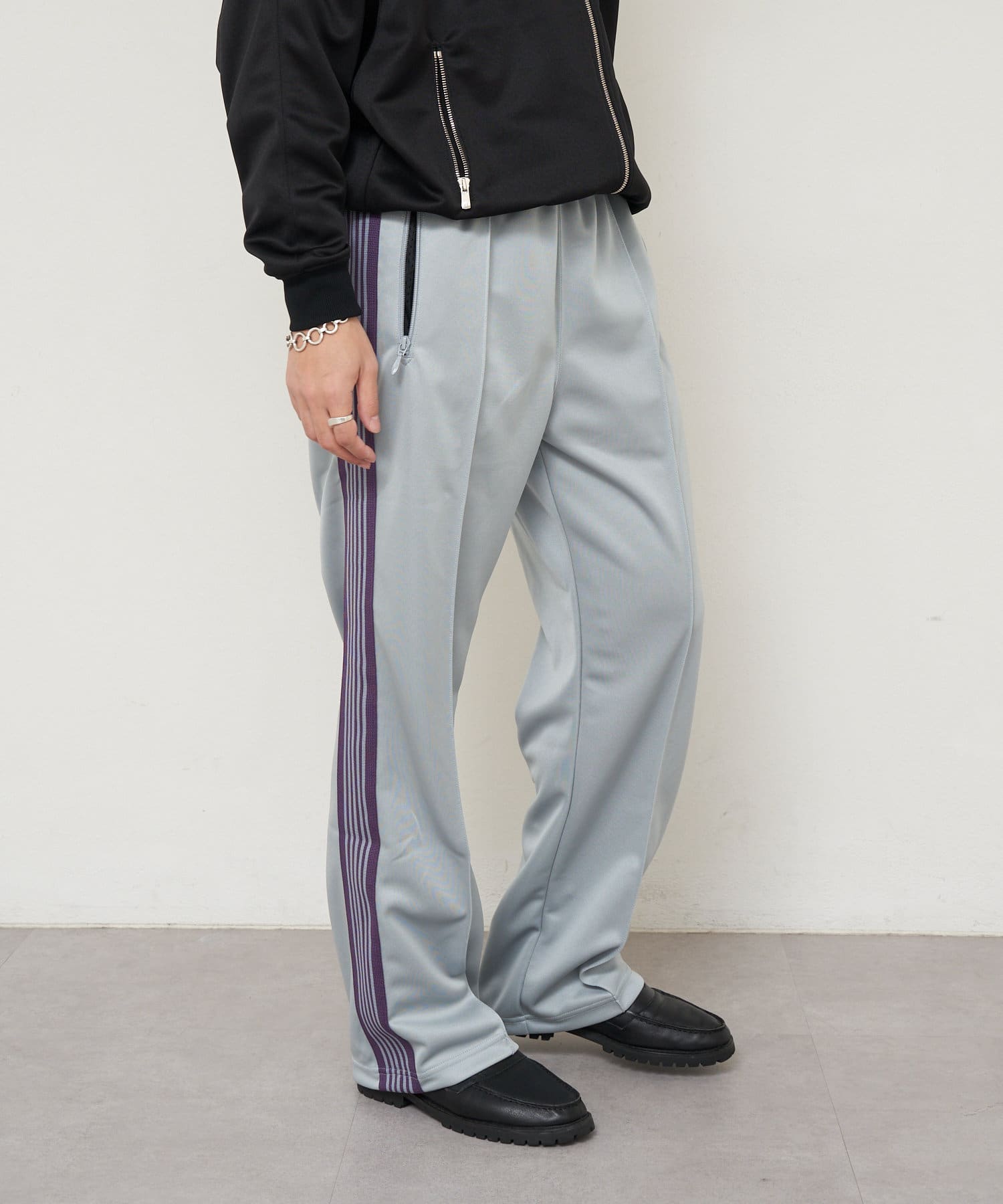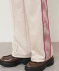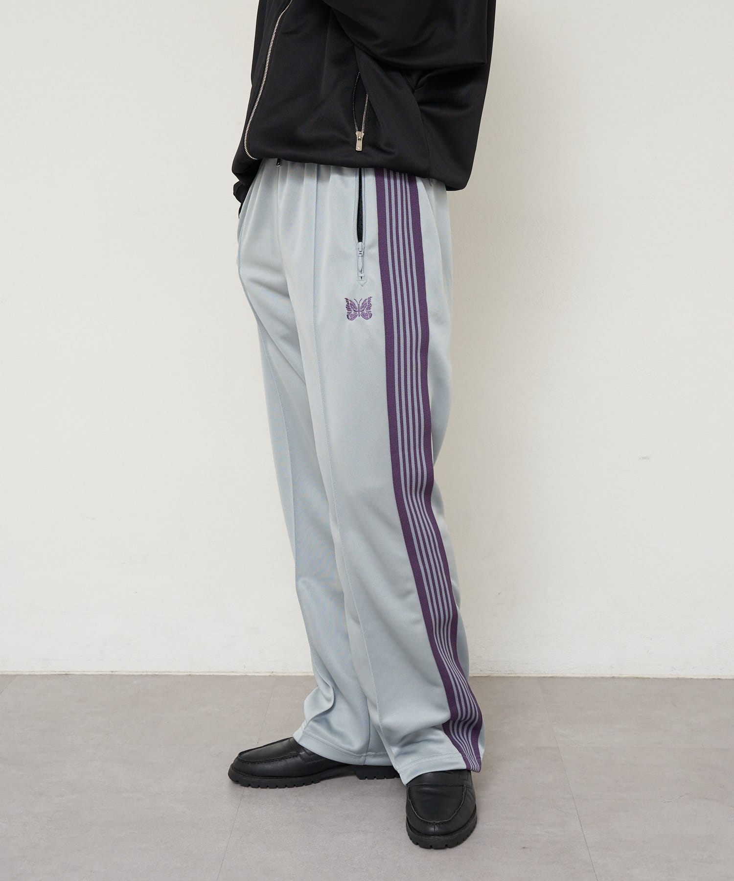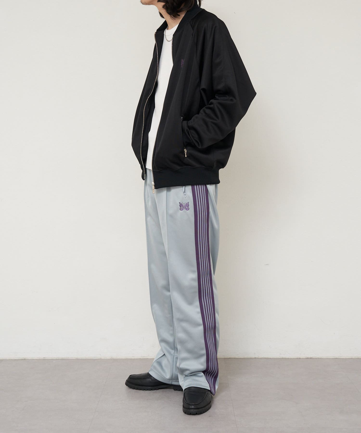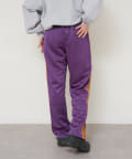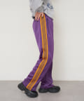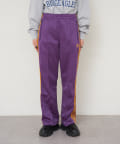 〈NEEDLES〉定番のトラックパンツが25年春夏シーズンの新色で登場。今シーズンはアイボリー、サックス、パープルの全3色です。伸縮性や通気性に富んだポリエステルジャージー素材を使用した快適性に優れたアイテム。独特の配色や刺繍デザインなど、一般的なスポーツウェアとは一線を画した華やかなファッション性が魅力となっています。豊富なシルエットのバリエーションで展開されておりますが、最もオーソドックスなややワイドなストレートシルエットです。