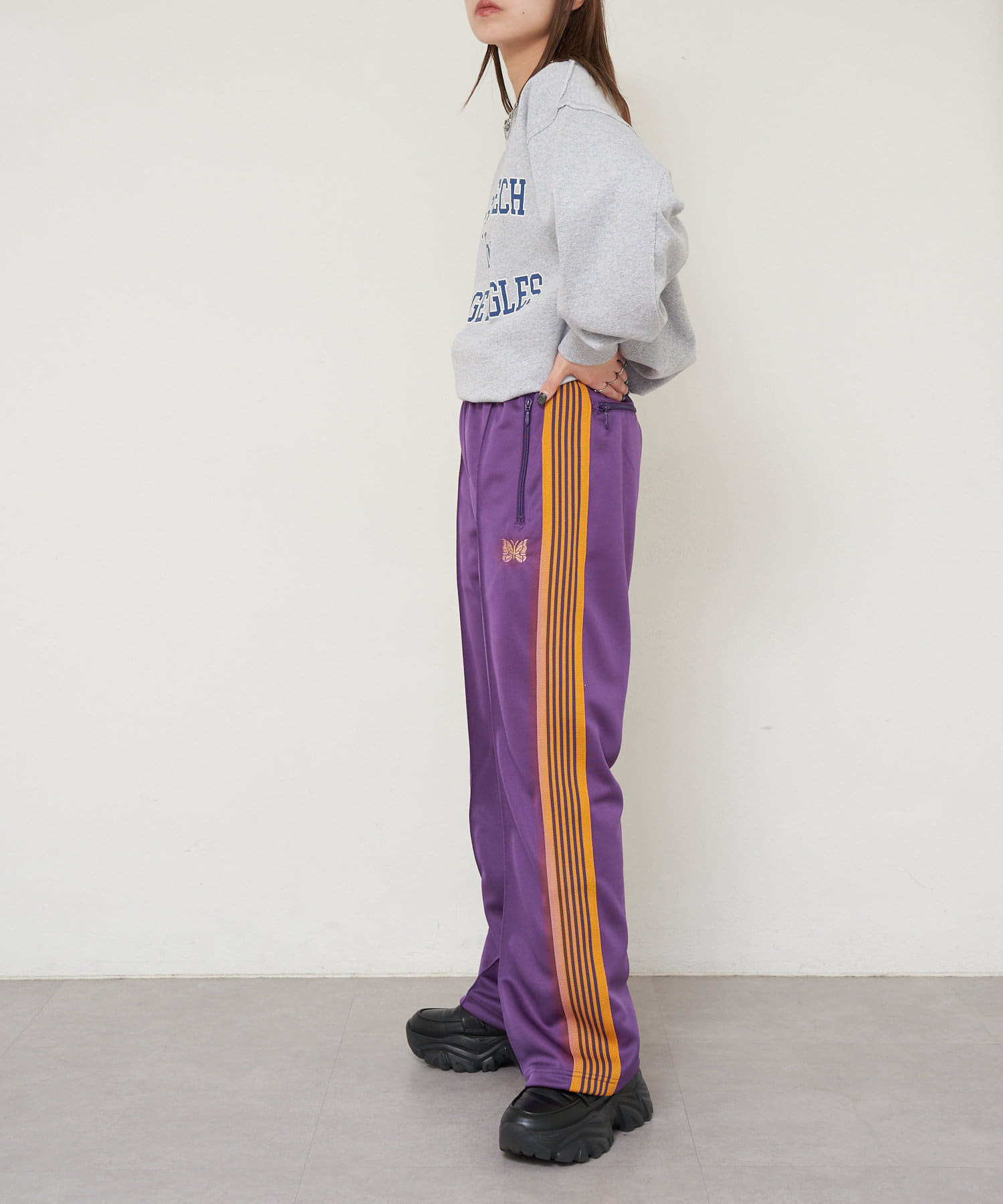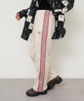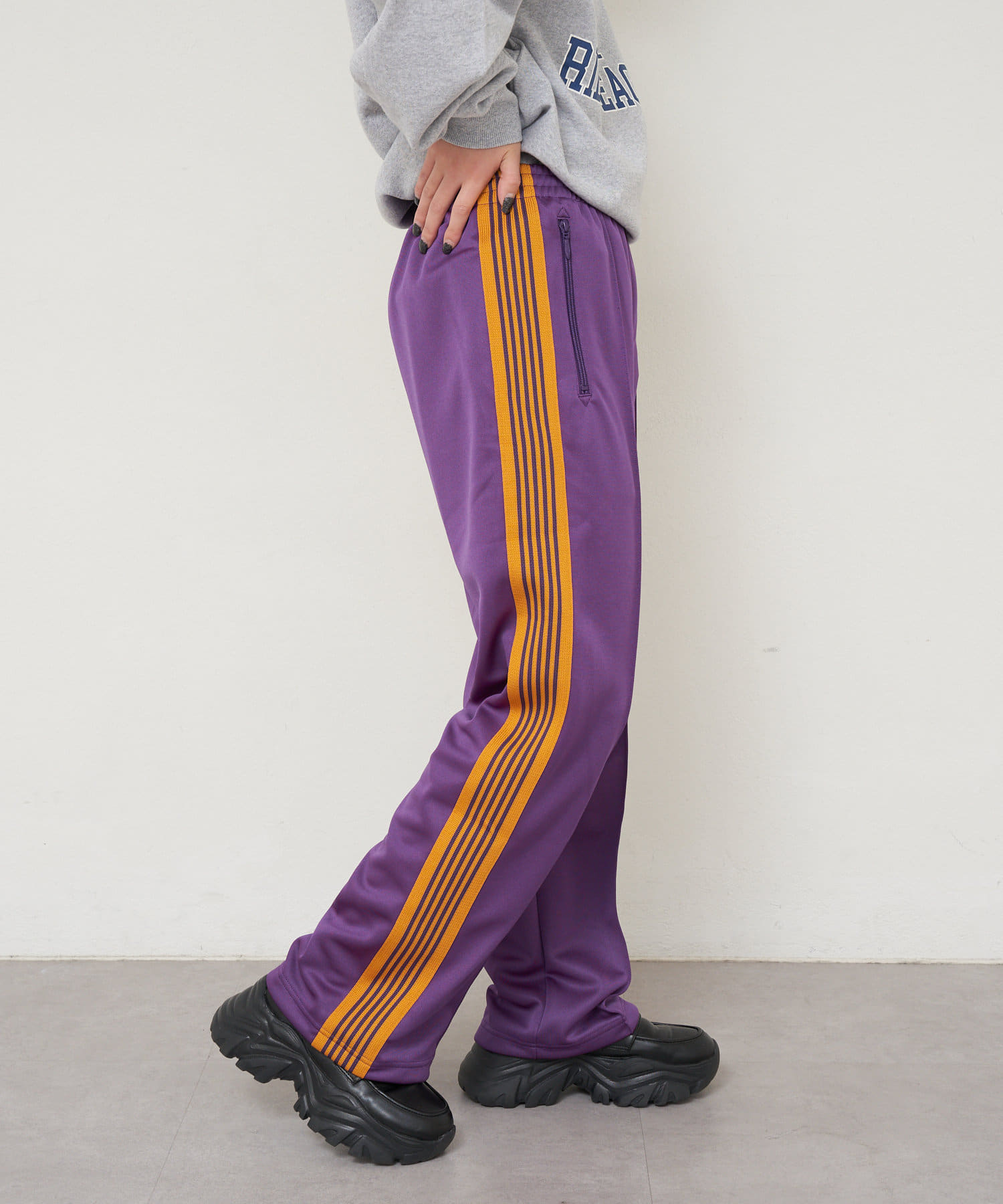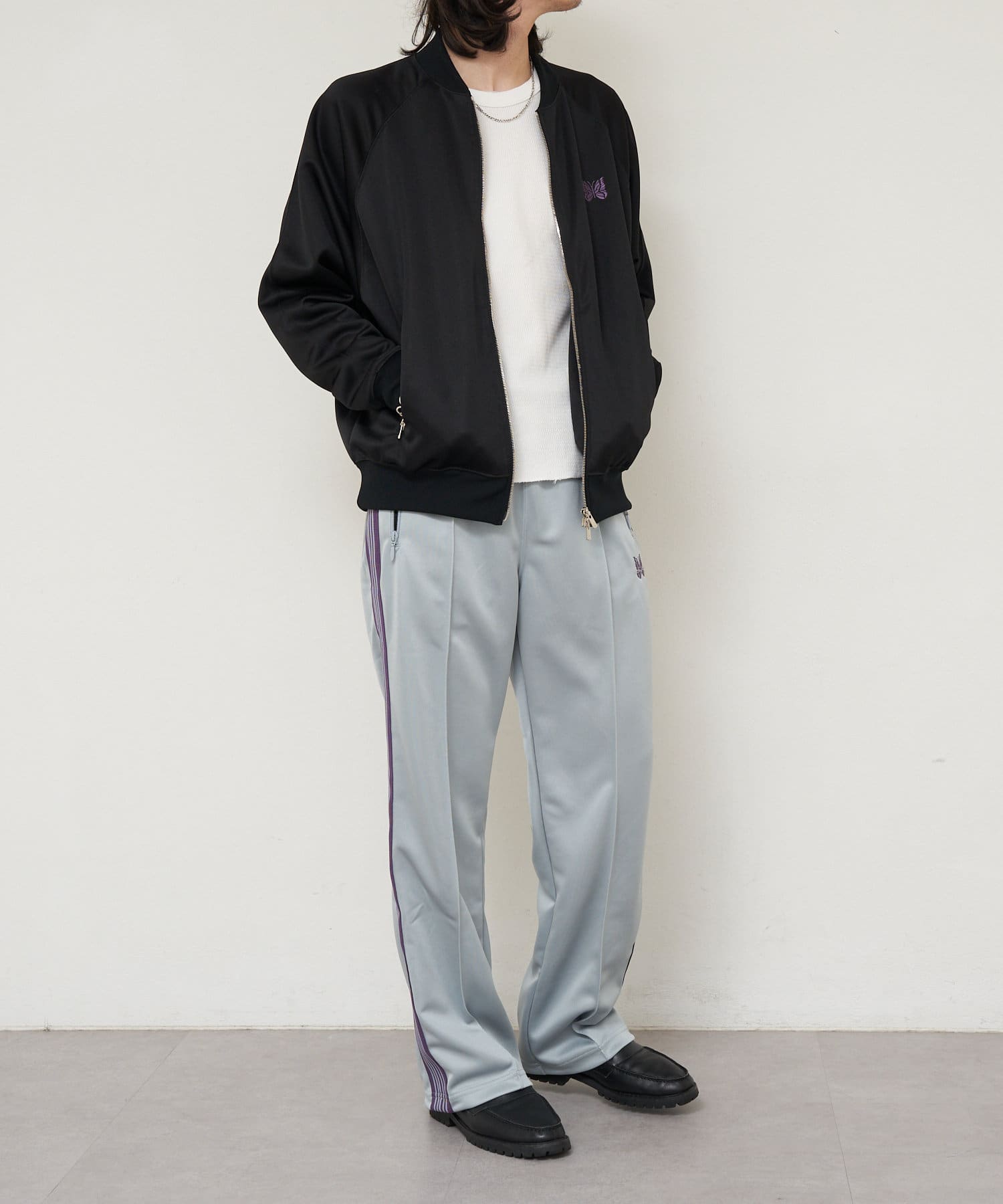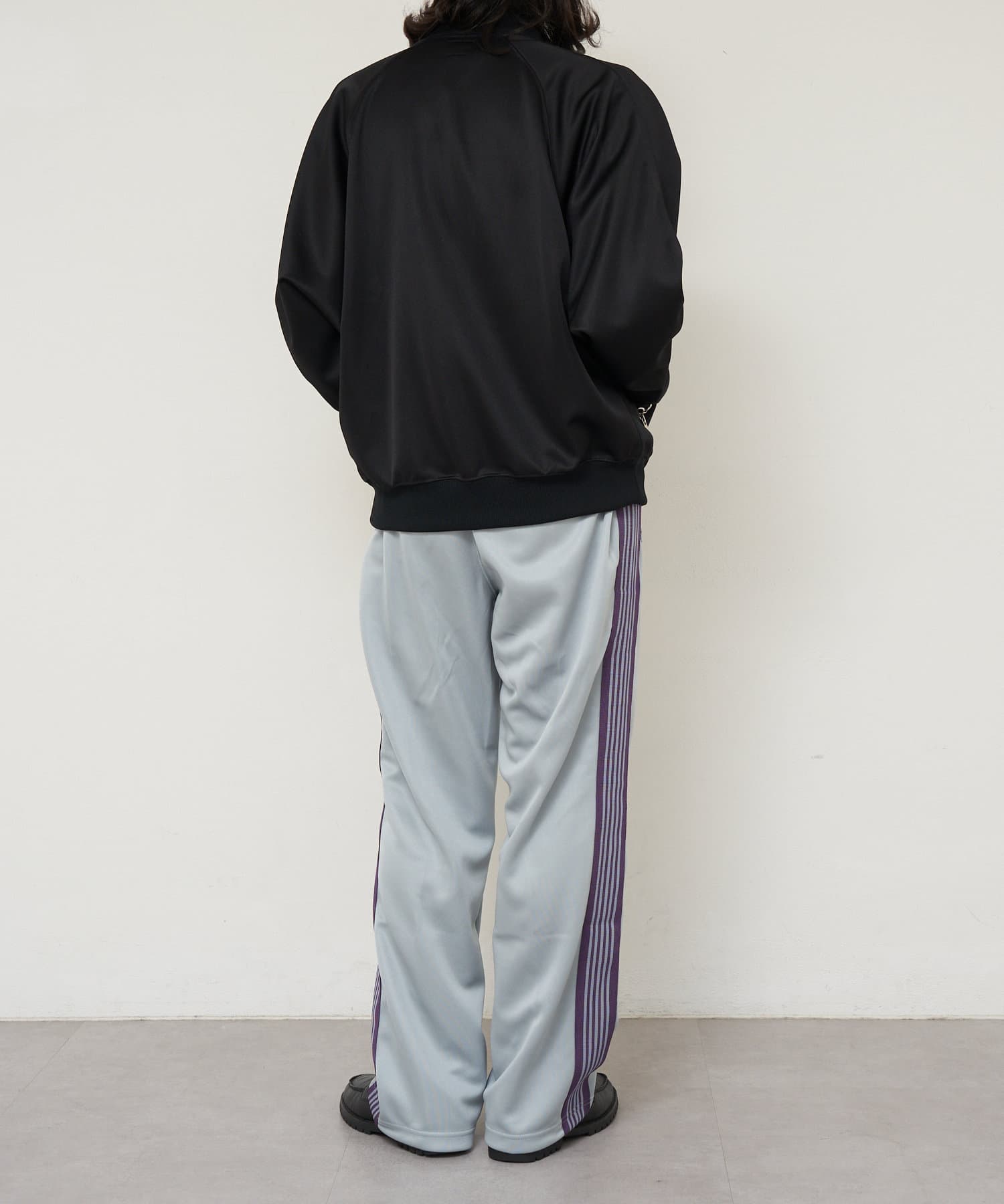 〈NEEDLES〉定番のトラックパンツが25年春夏シーズンの新色で登場。今シーズンはアイボリー、サックス、パープルの全3色です。伸縮性や通気性に富んだポリエステルジャージー素材を使用した快適性に優れたアイテム。独特の配色や刺繍デザインなど、一般的なスポーツウェアとは一線を画した華やかなファッション性が魅力となっています。豊富なシルエットのバリエーションで展開されておりますが、最もオーソドックスなややワイドなストレートシルエットです。