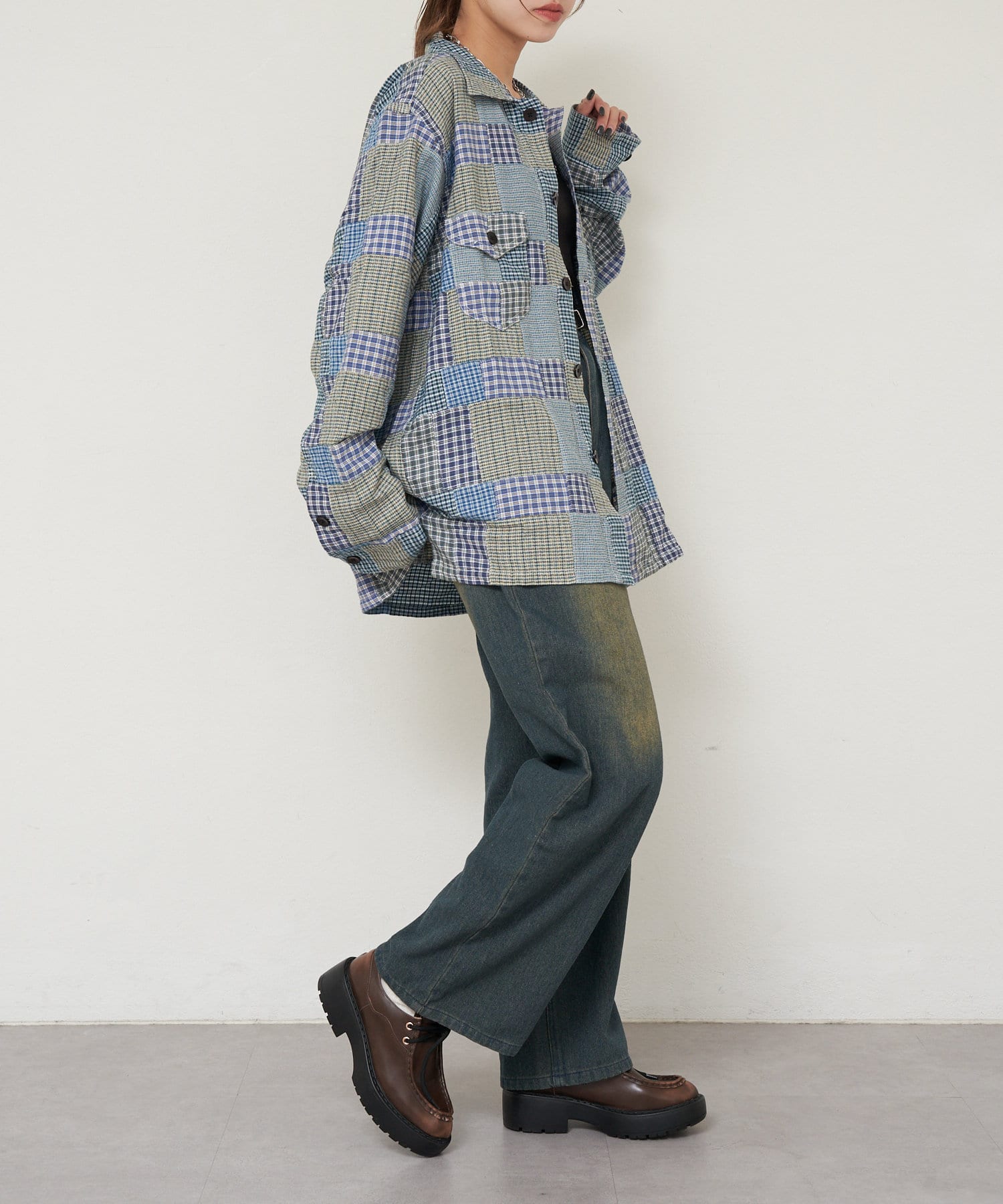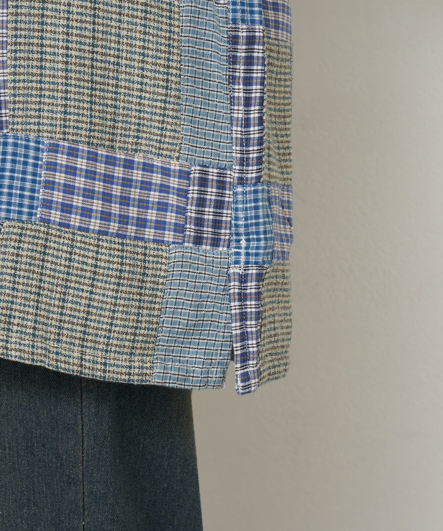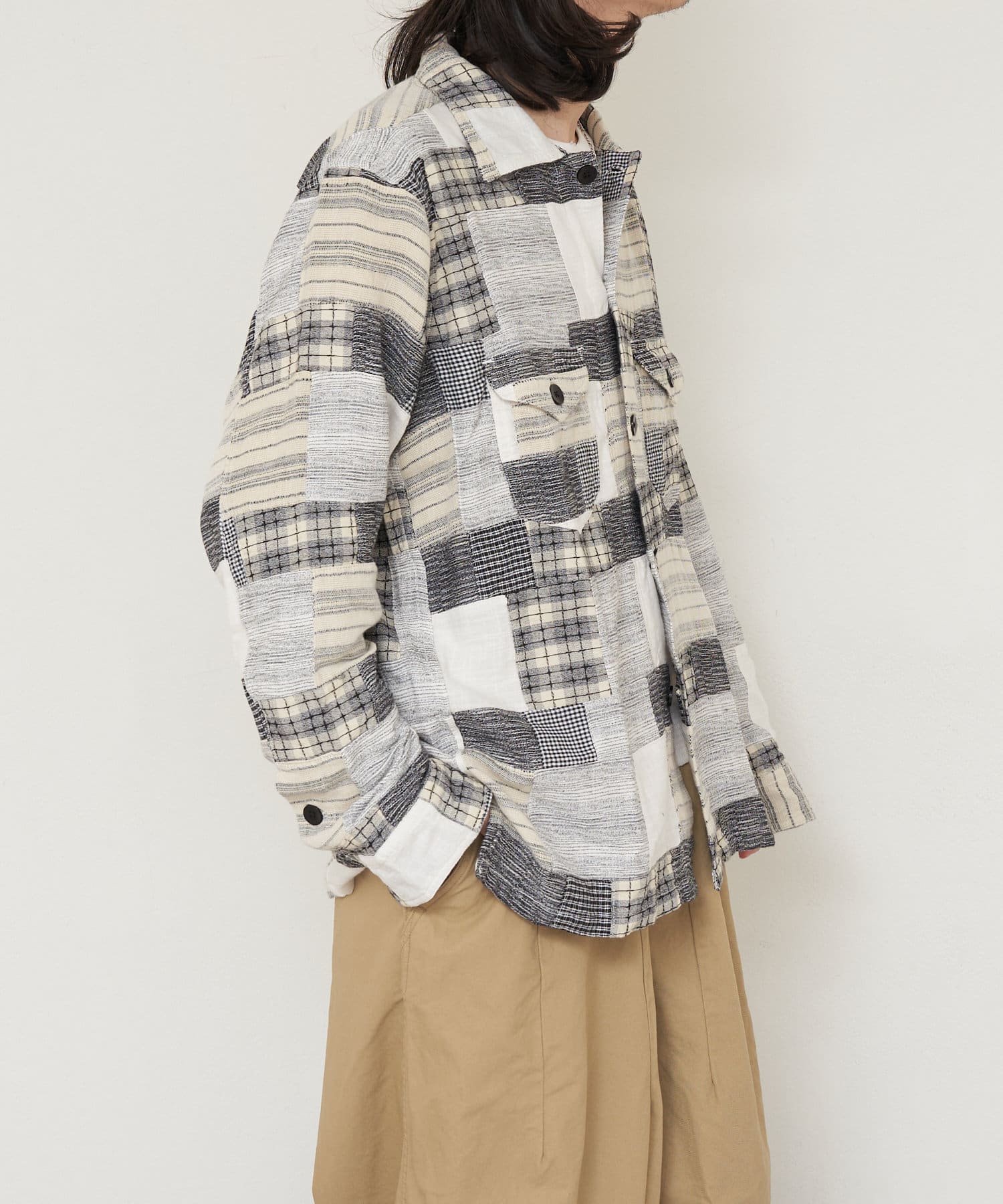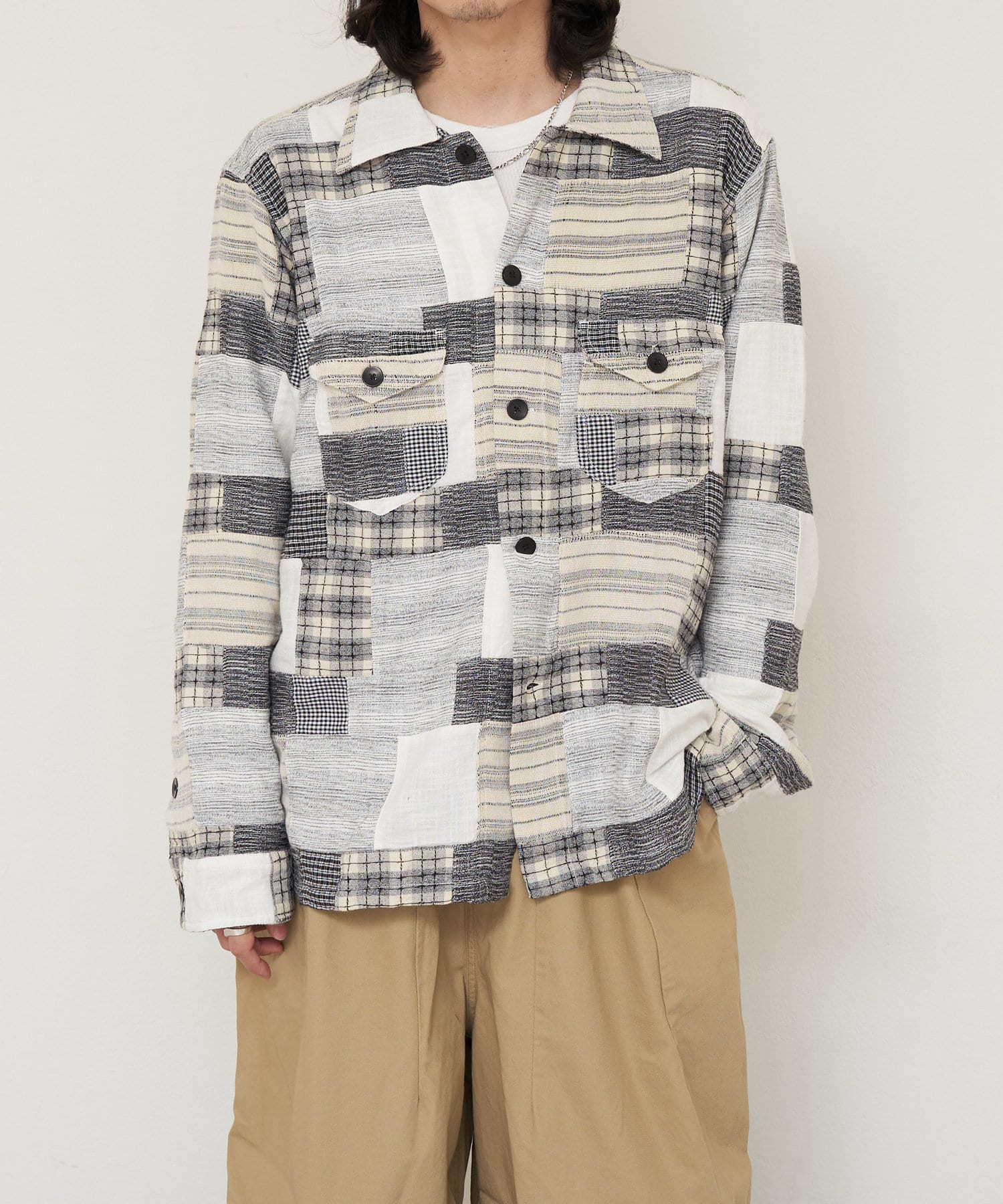 スモーキーな雰囲気が漂う小さなチェックパッチワークが特徴的な「Smokey Shirt - Small Plaid Patchwork」。異なるチェック柄を組み合わせたパッチワークデザインが独特の個性を引き立て、シンプルながらも目を引く一着です。柔らかいコットン素材を使用し、肌触りが良く、軽やかな着心地。オープンカラーのデザインが程よいリラックス感を与え、カジュアルなスタイルにぴったり。日常のコーディネートにアクセントを加える、使いやすくも印象的なアイテムです。