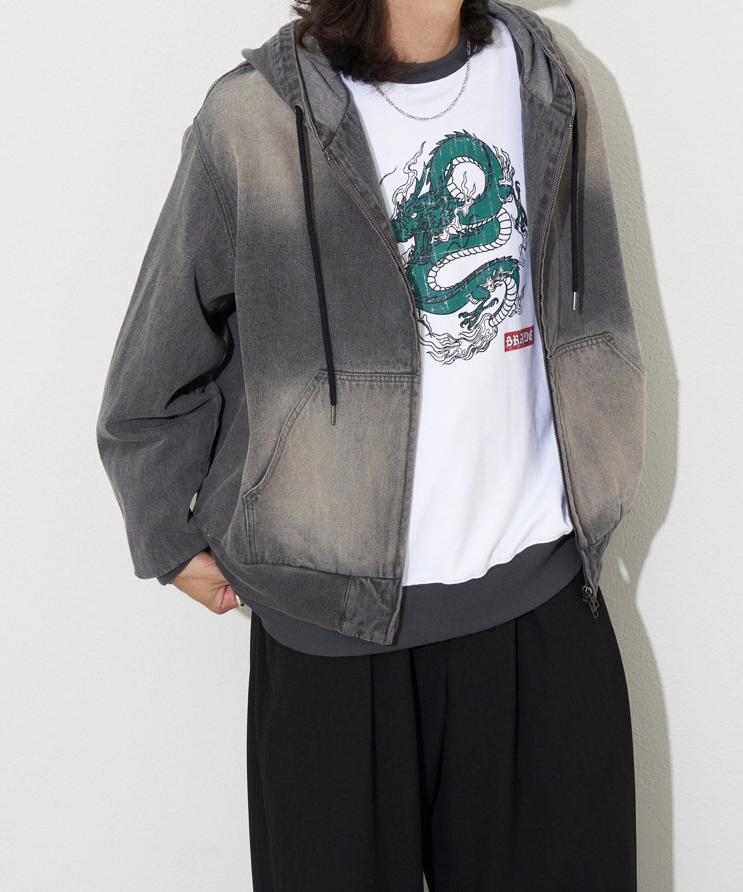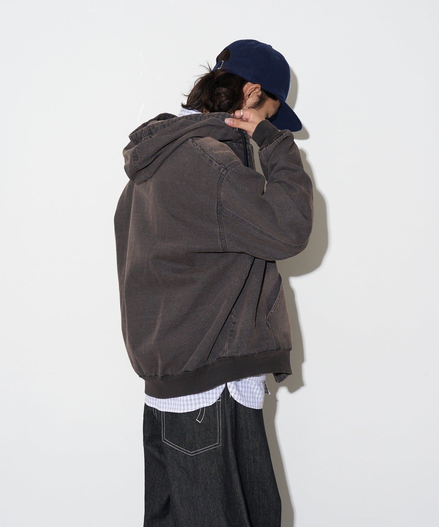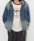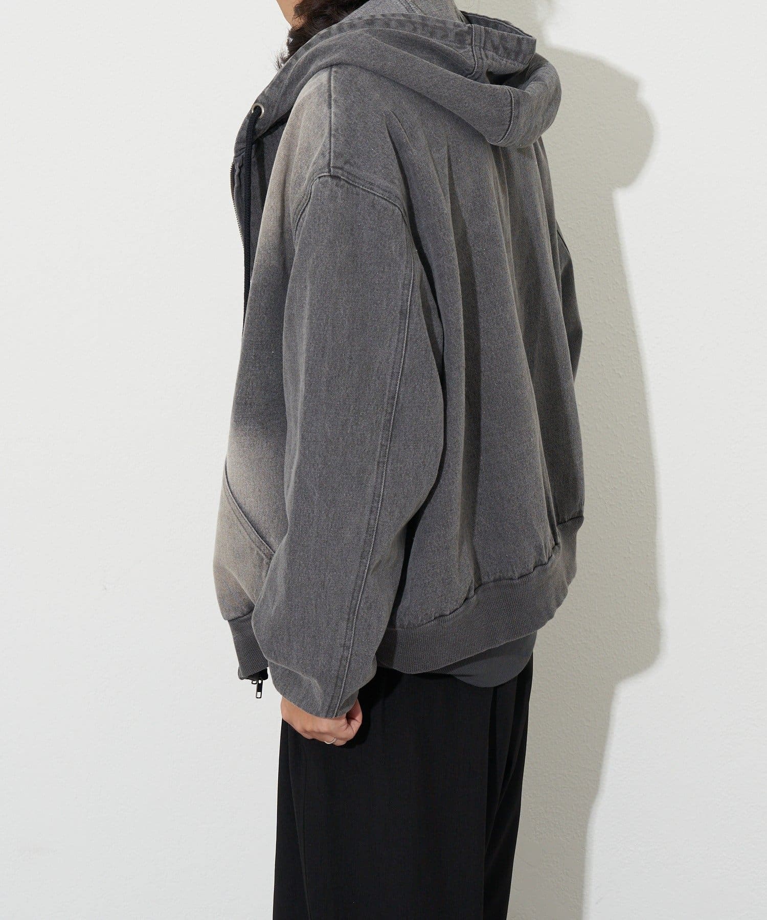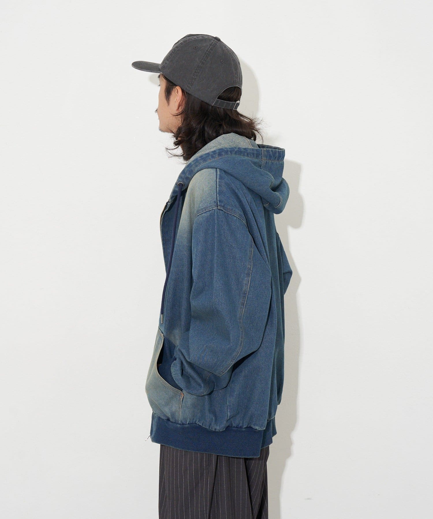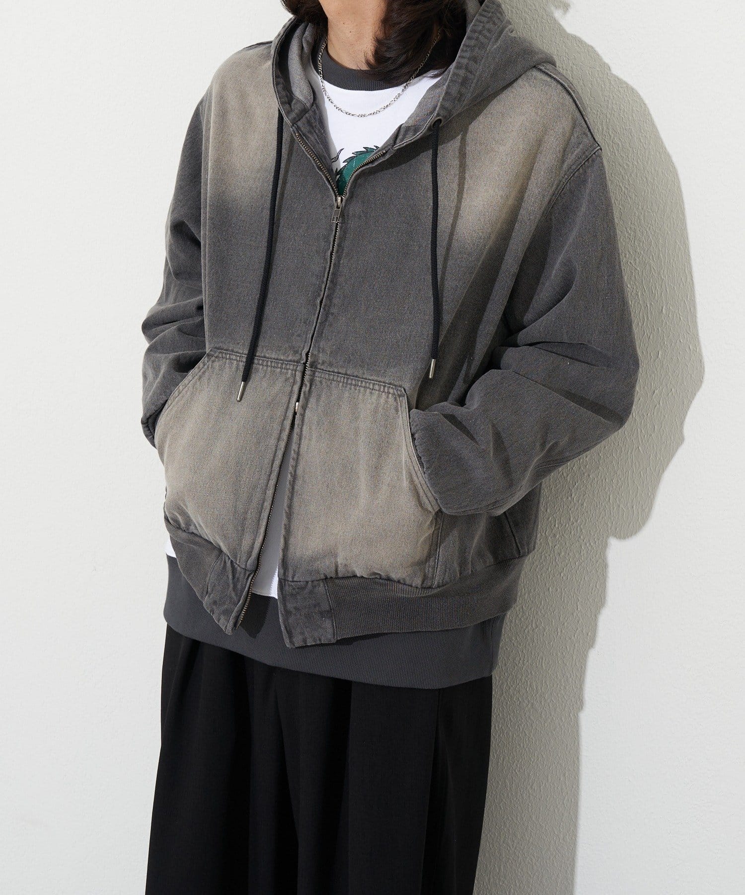 味わい深いオーバーダイ加工を施したデニムジップパーカー。