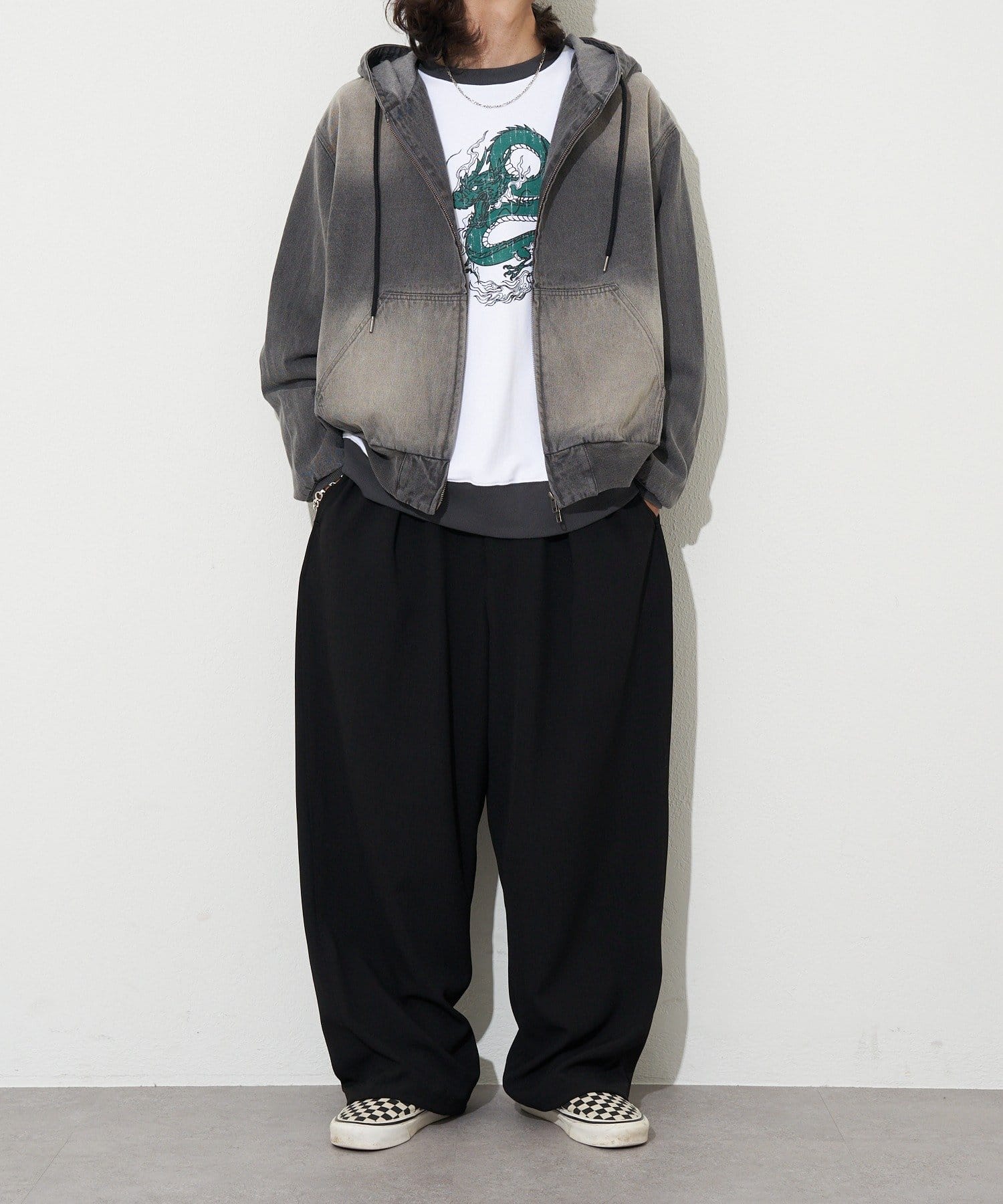 ワイドパンツと合わせてルーズにまとめれば、ストリート感のある旬なスタイルに。