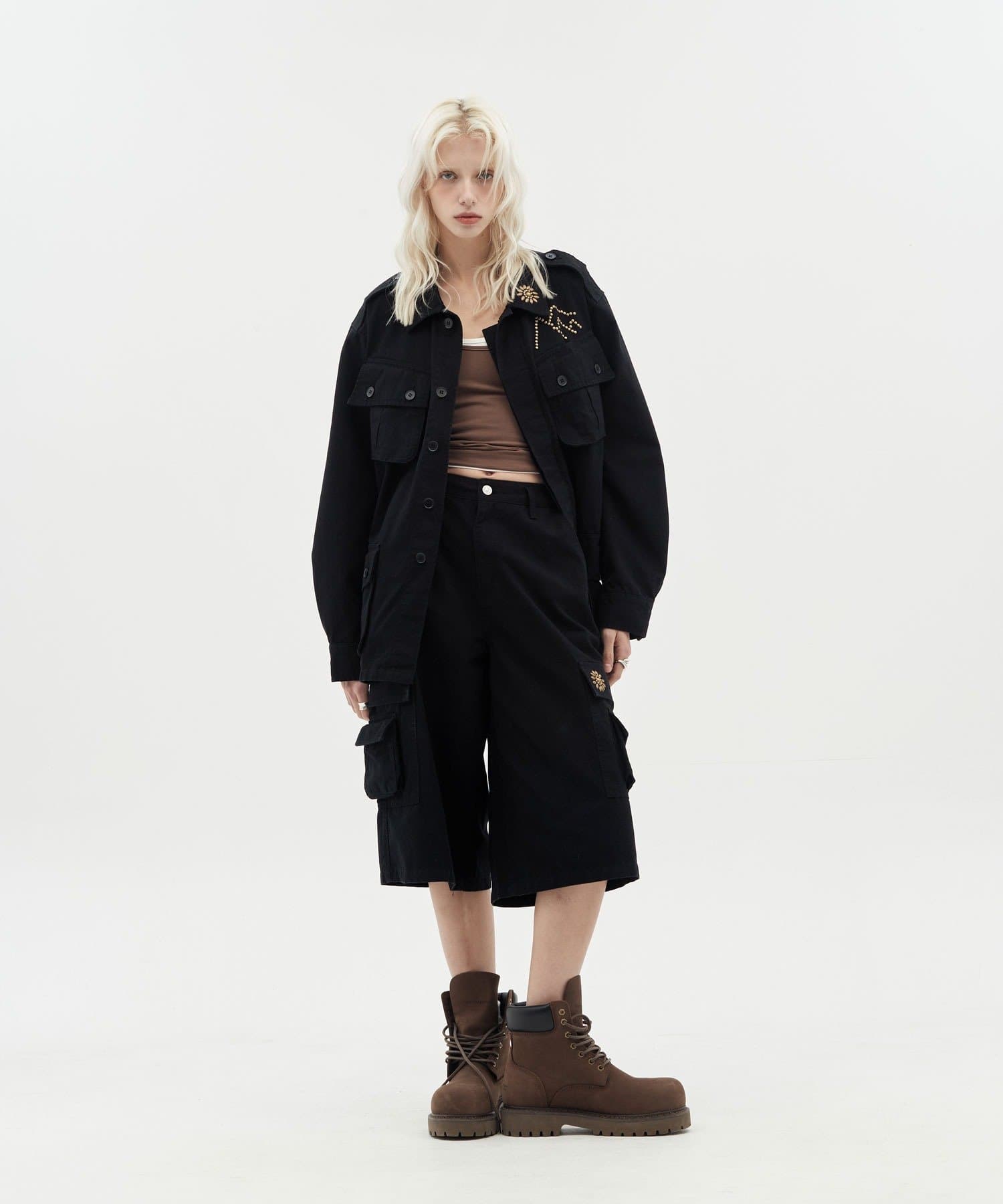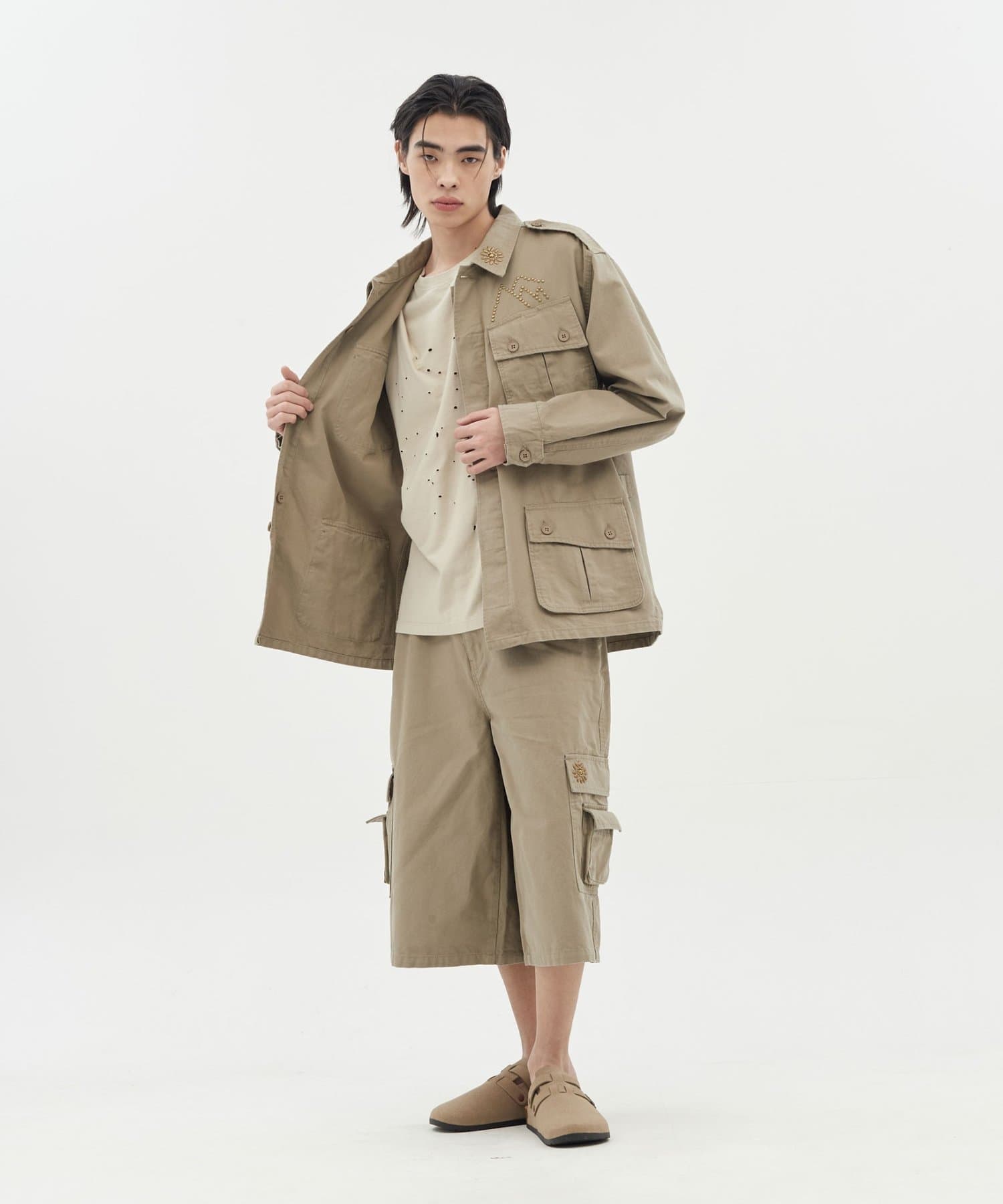 サイドのフラップポケットに配された、星のように輝くアンティーク調のスタッズが、無骨なカーゴスタイルに洗練されたスパイスを添えています。
