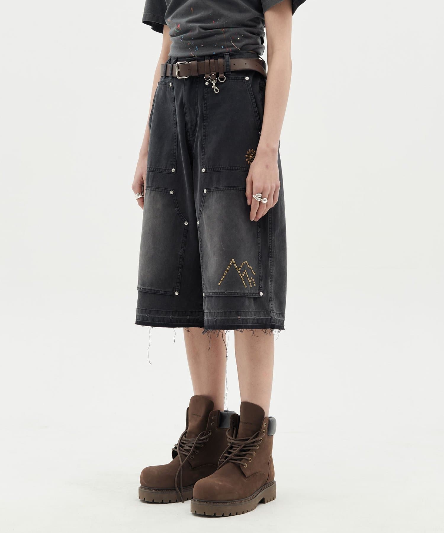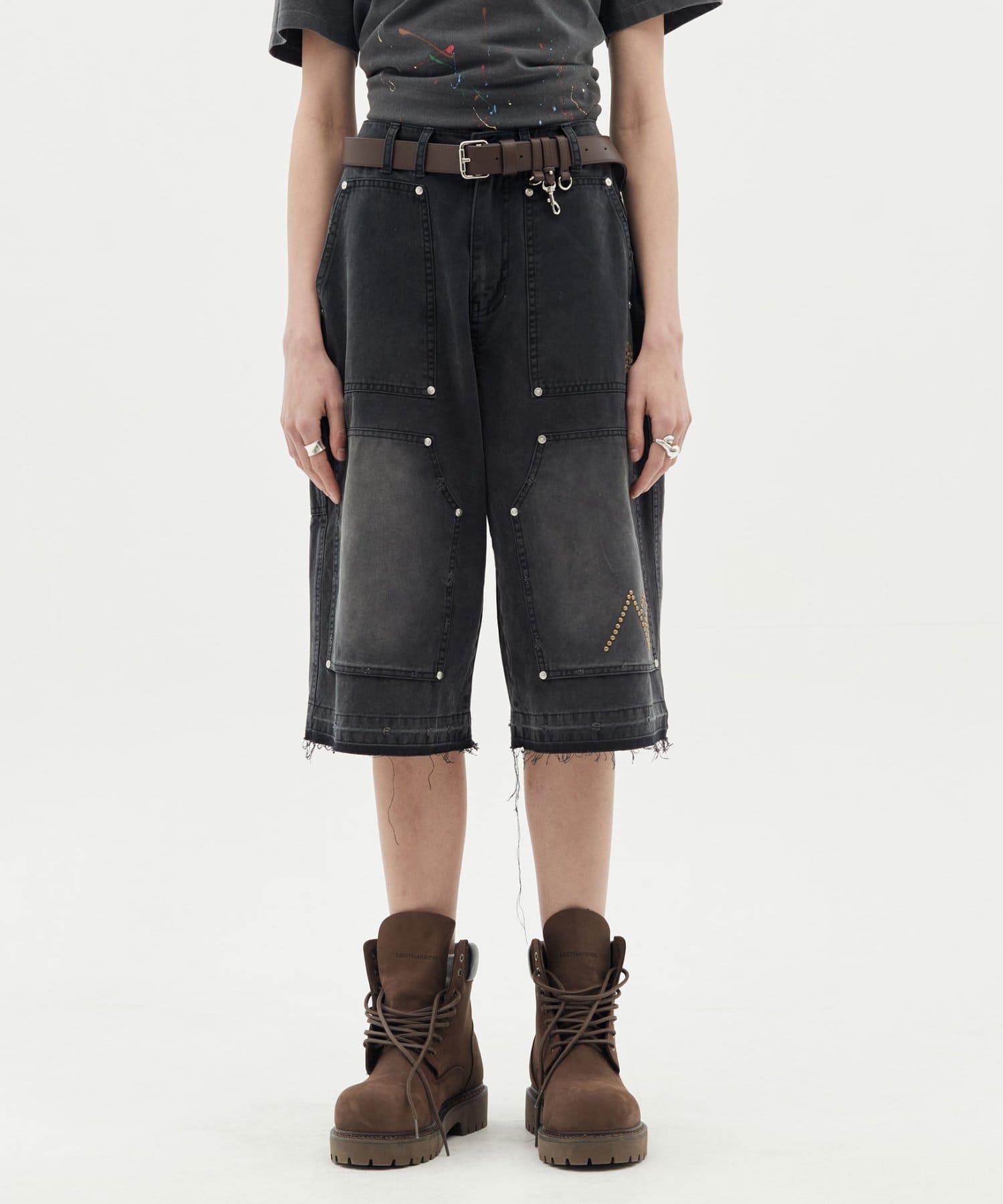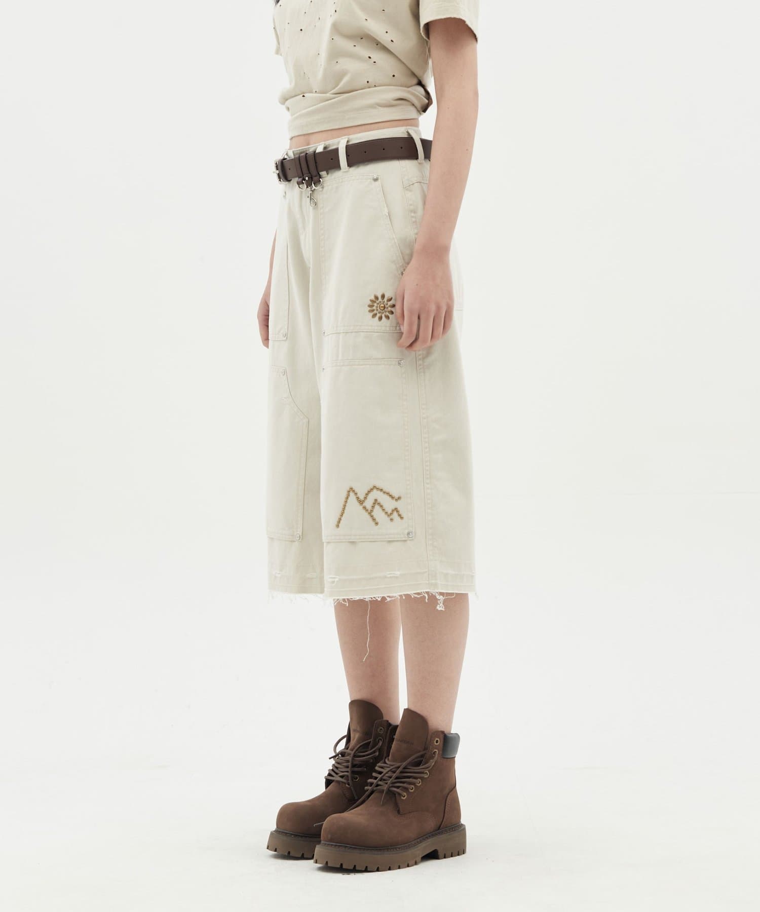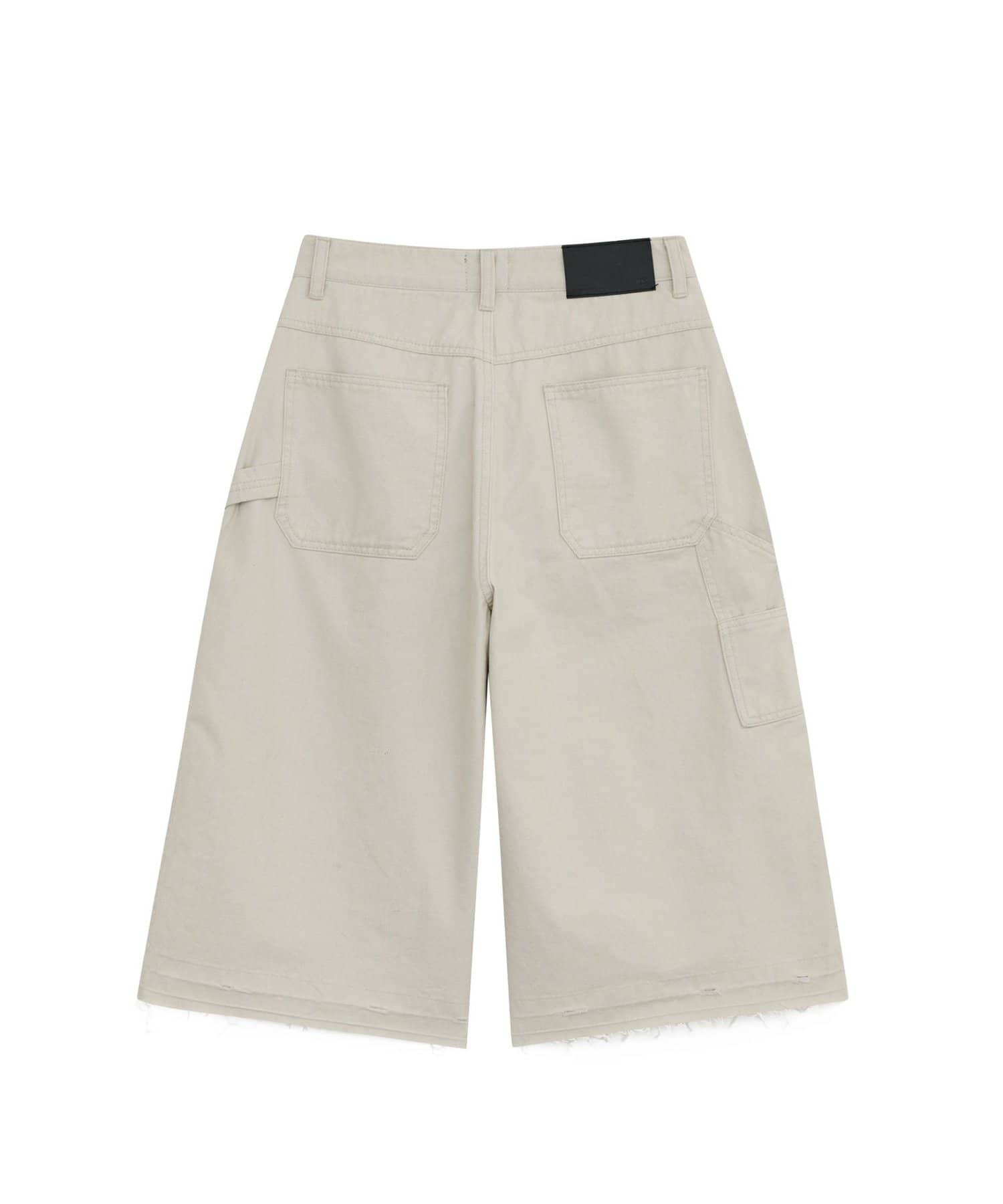 裾の切りっぱなし(ディストロイ加工)とダブルニーのタフなディテールを、ストリートに昇華させたバミューダワークパンツ。