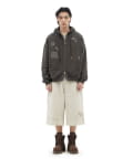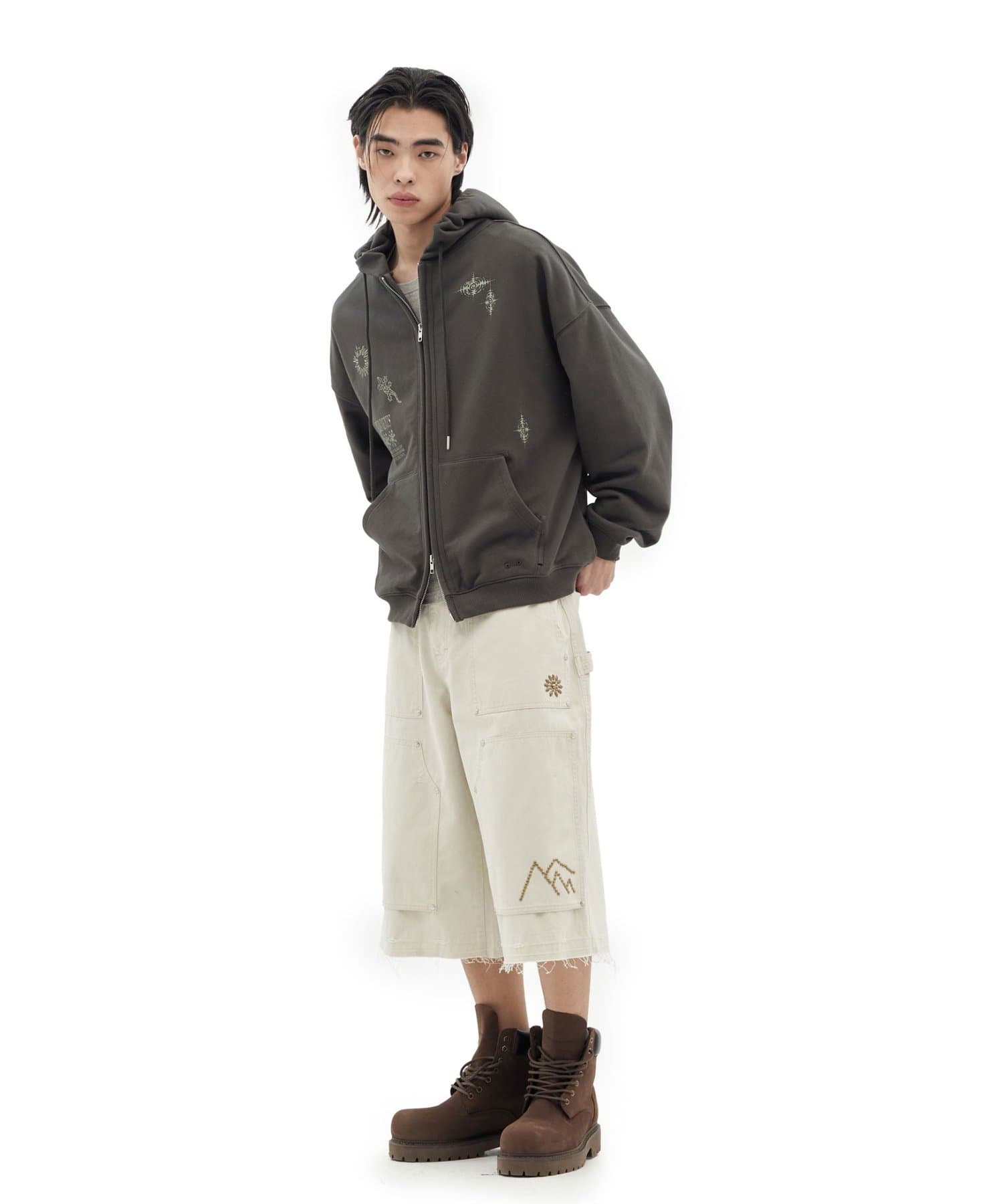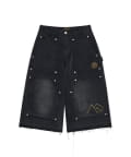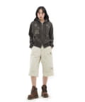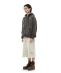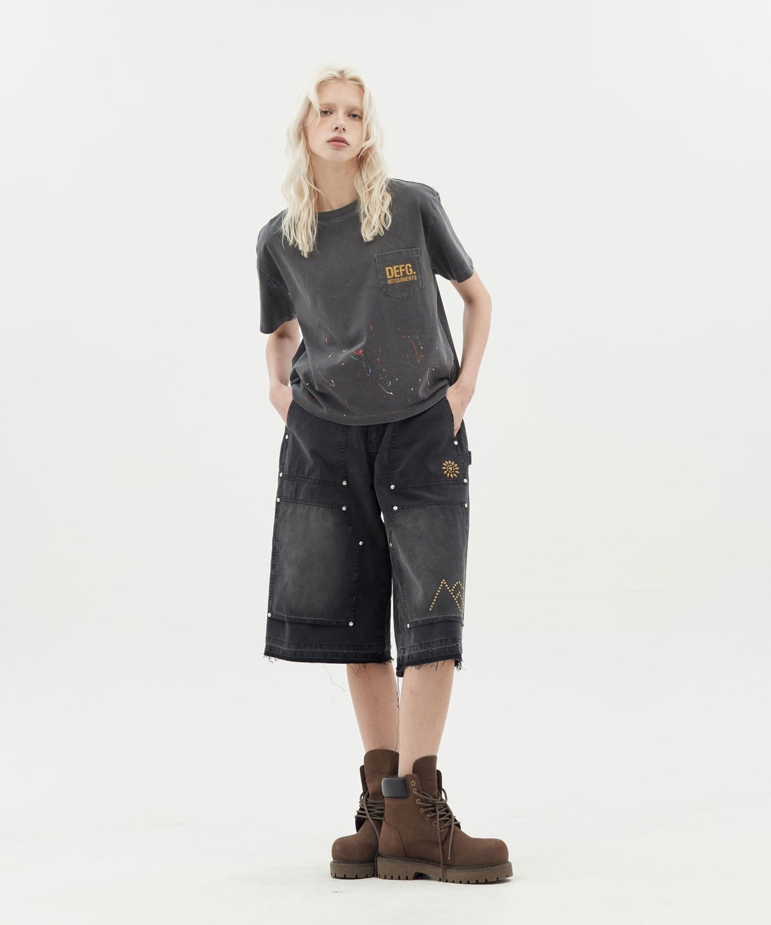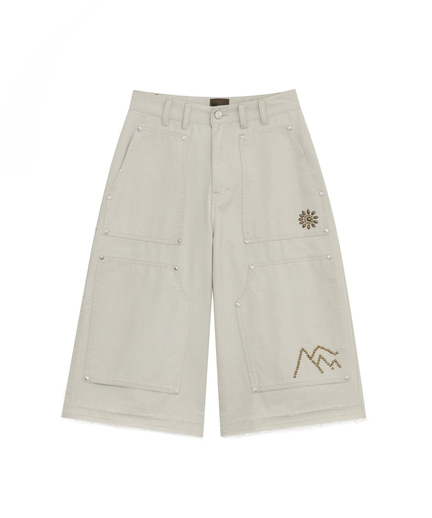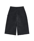裾の切りっぱなし(ディストロイ加工)とダブルニーのタフなディテールを、ストリートに昇華させたバミューダワークパンツ。