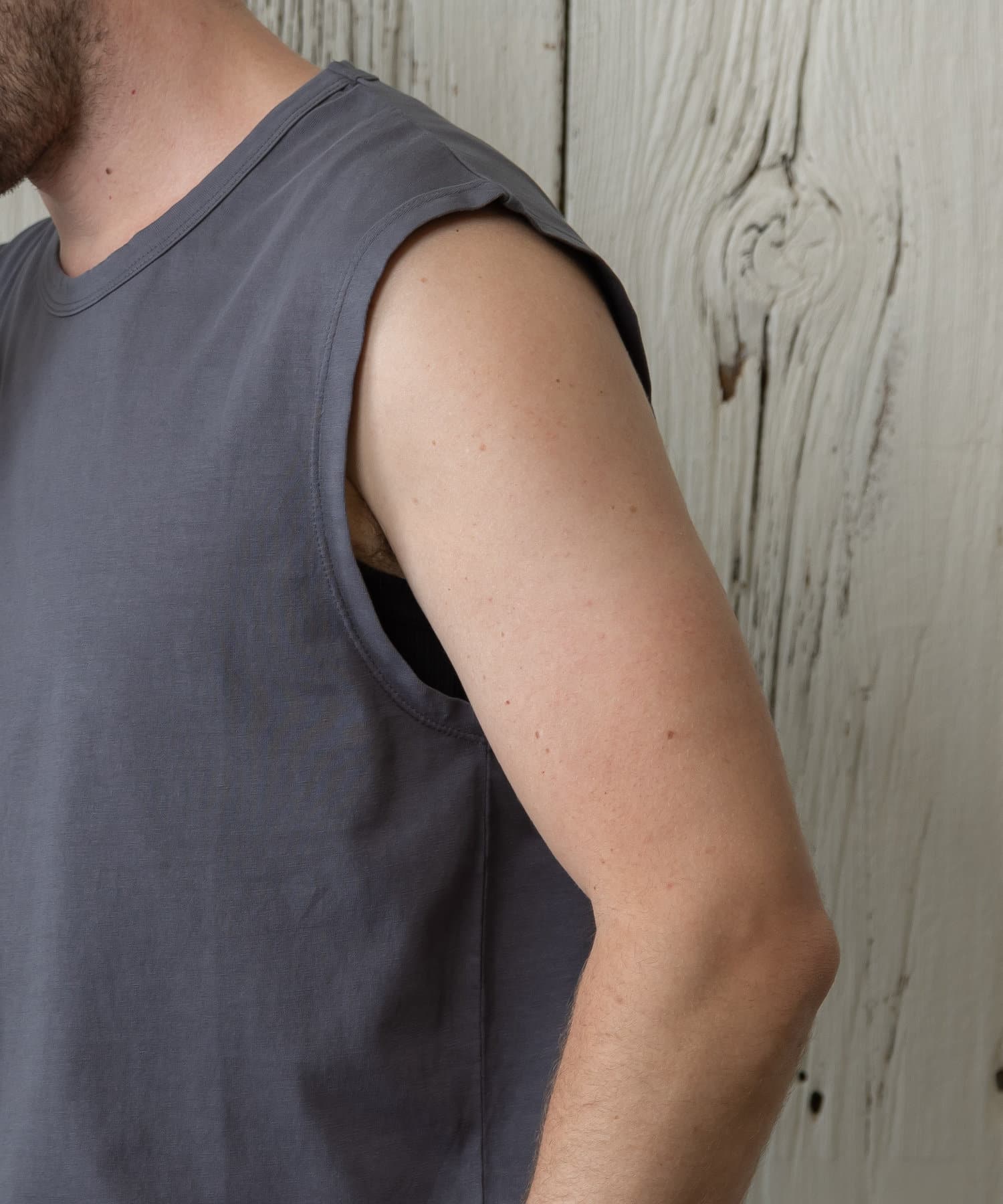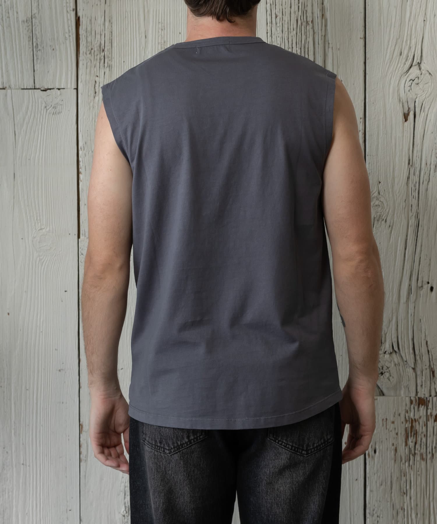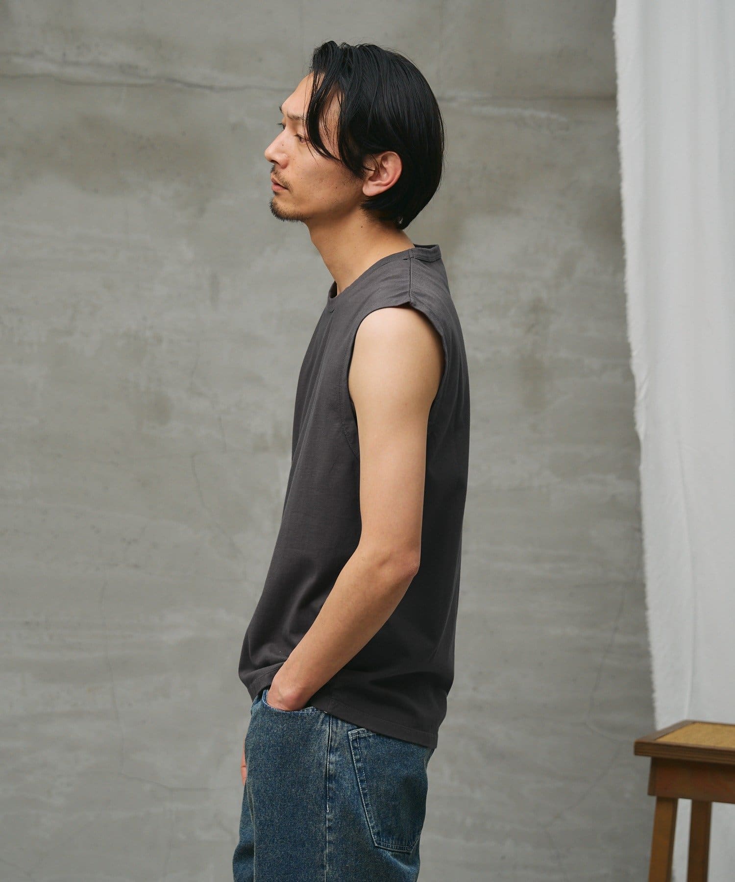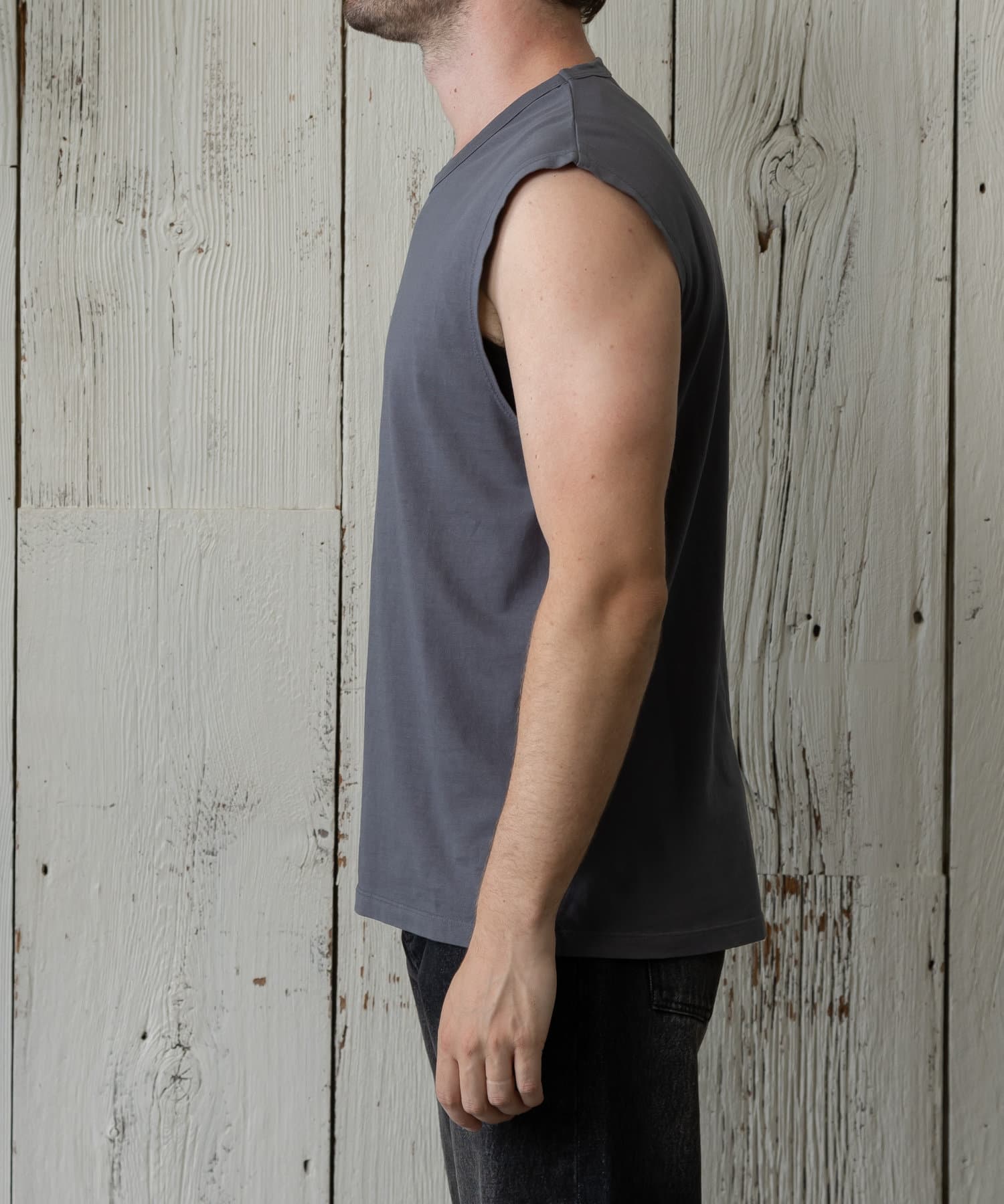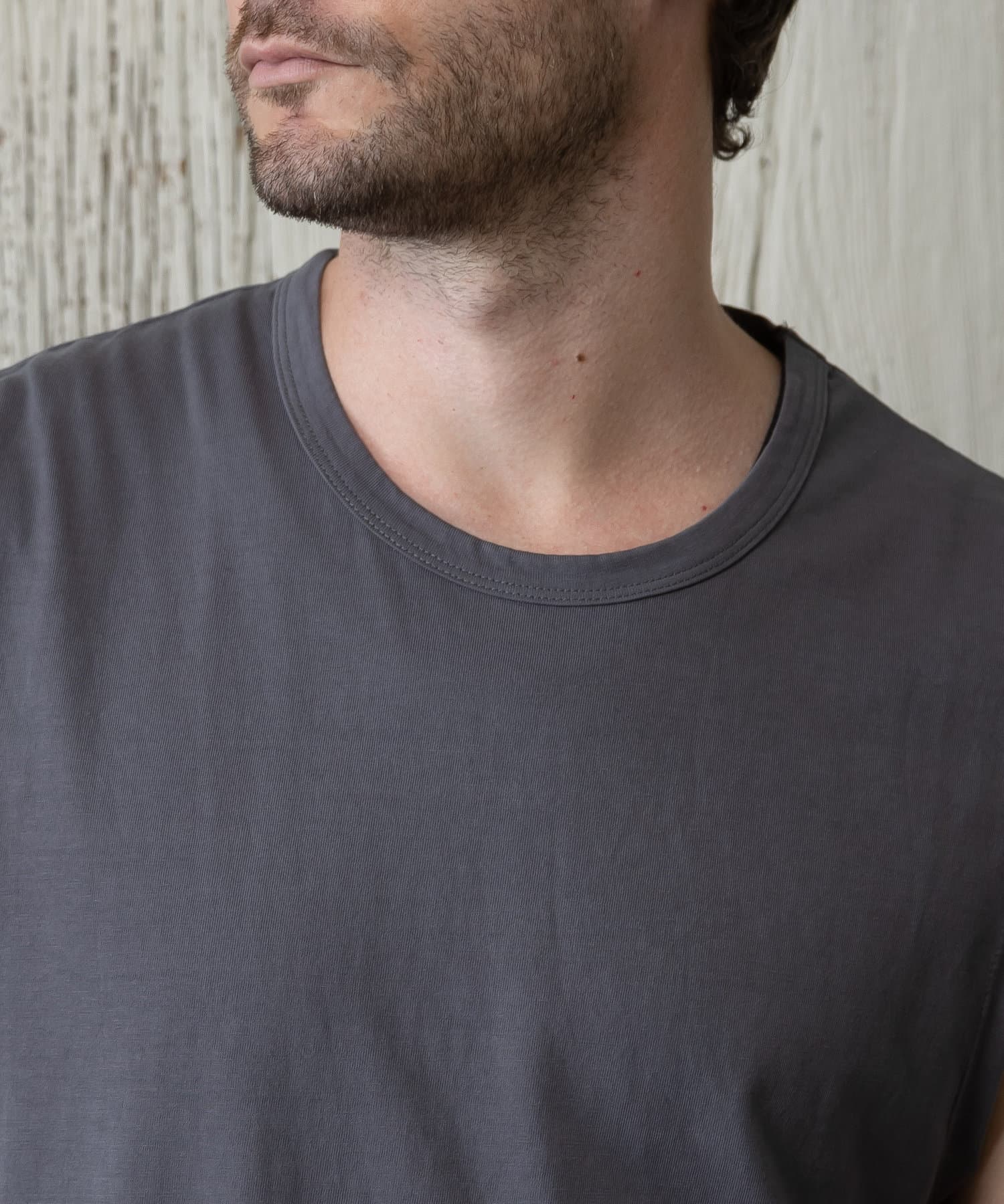 コットン100%で毛羽立ちが少なく、クリーンな表面が特徴のノースリーブです。