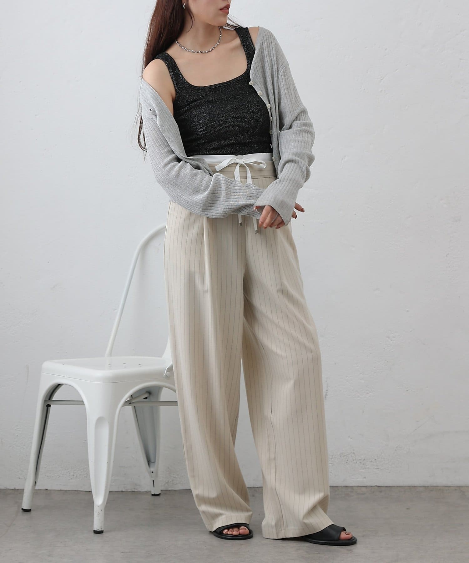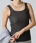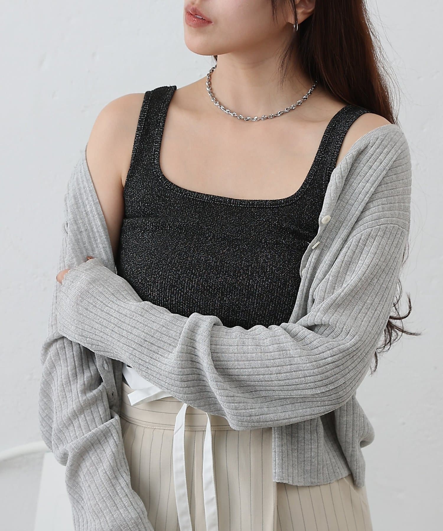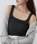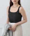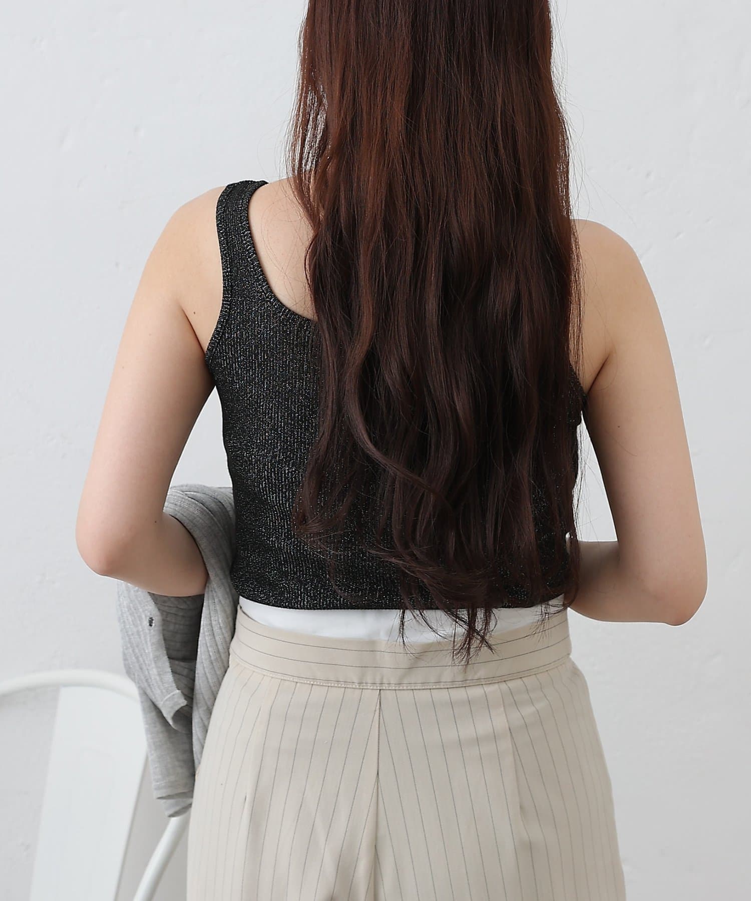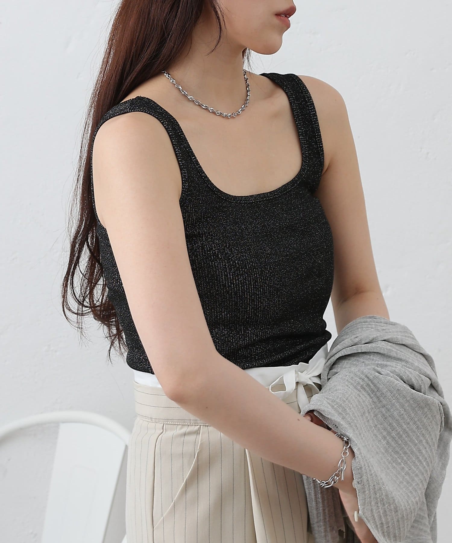 上品な雰囲気のあるスクエアネックタイプのラメタンクトップ。