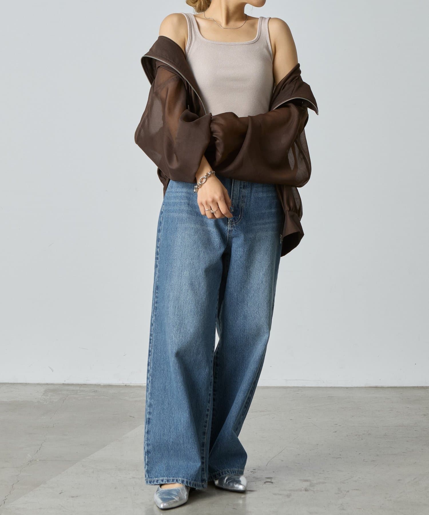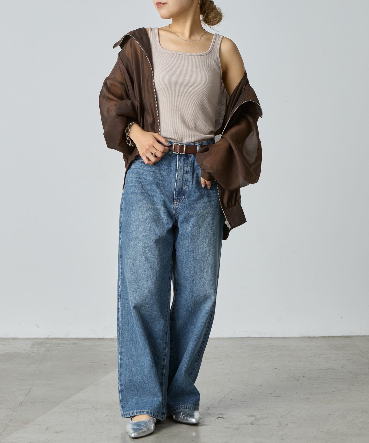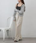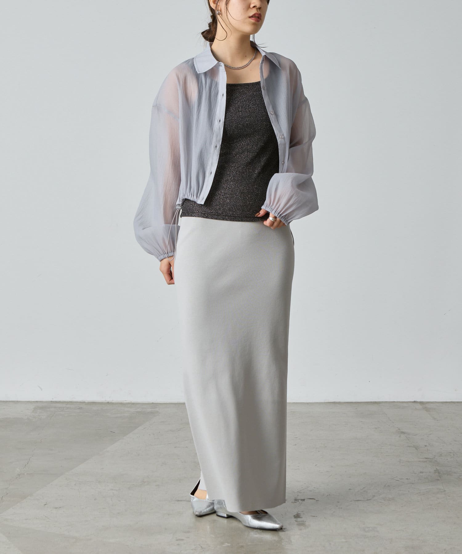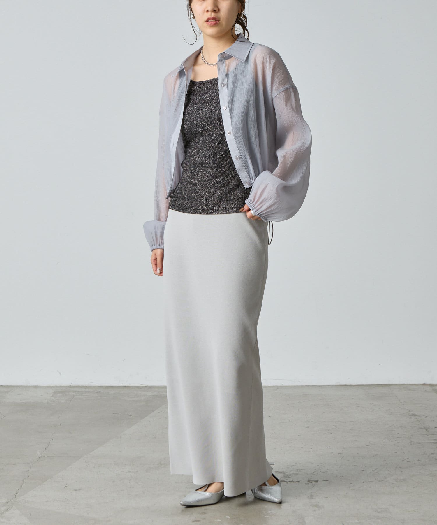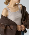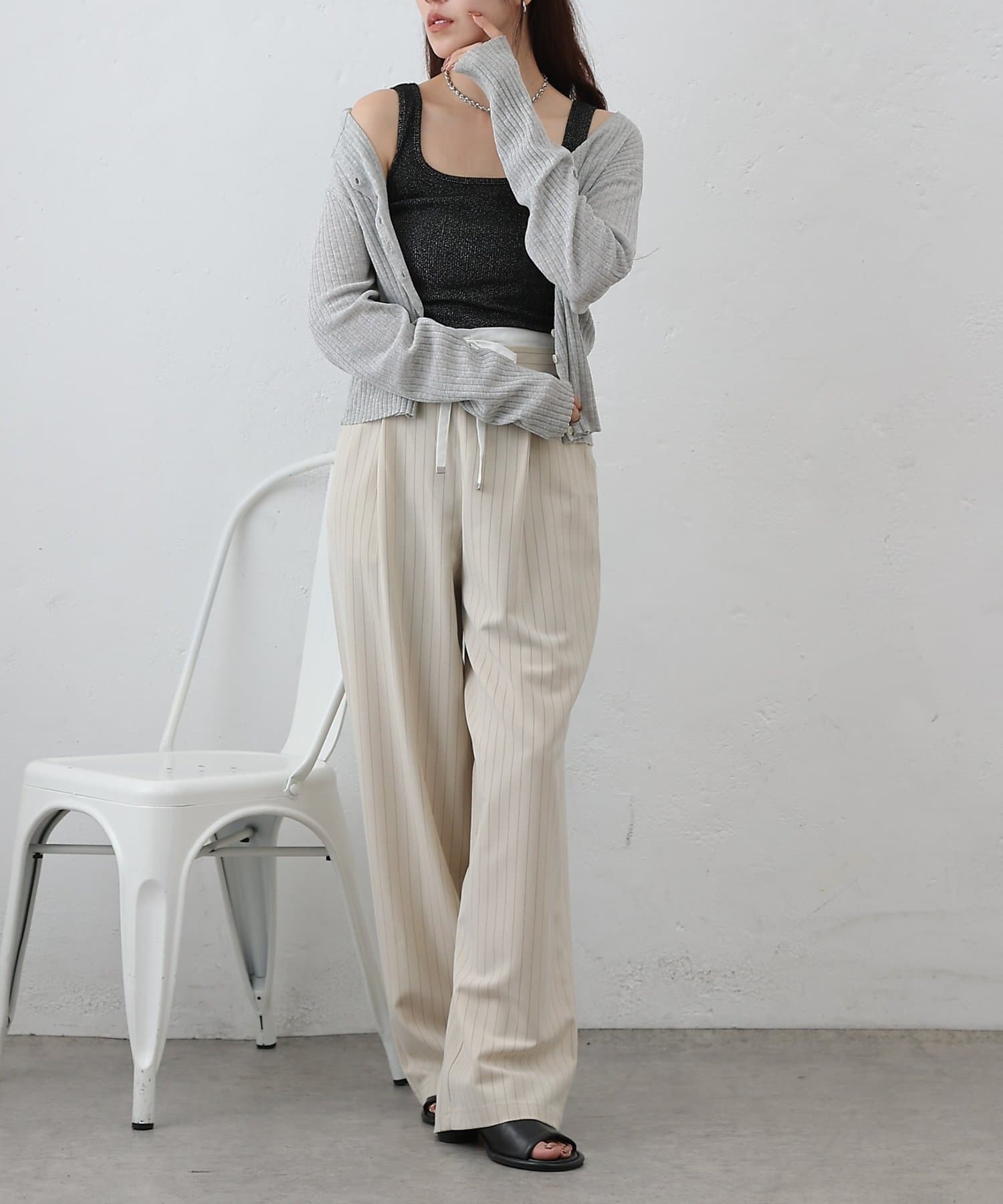 上品な雰囲気のあるスクエアネックタイプのラメタンクトップ。