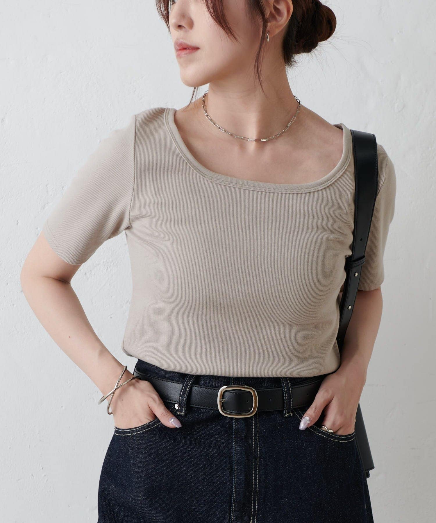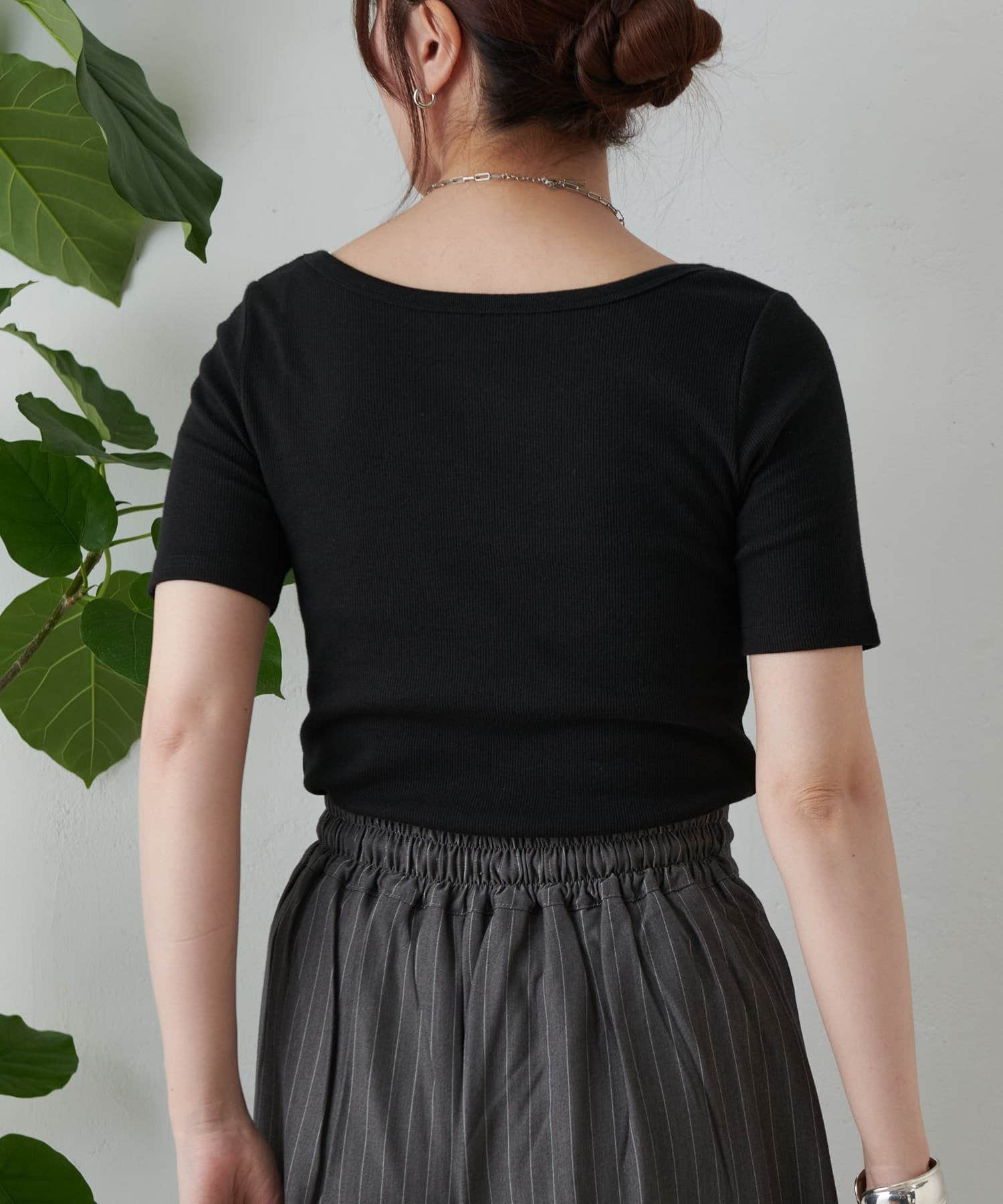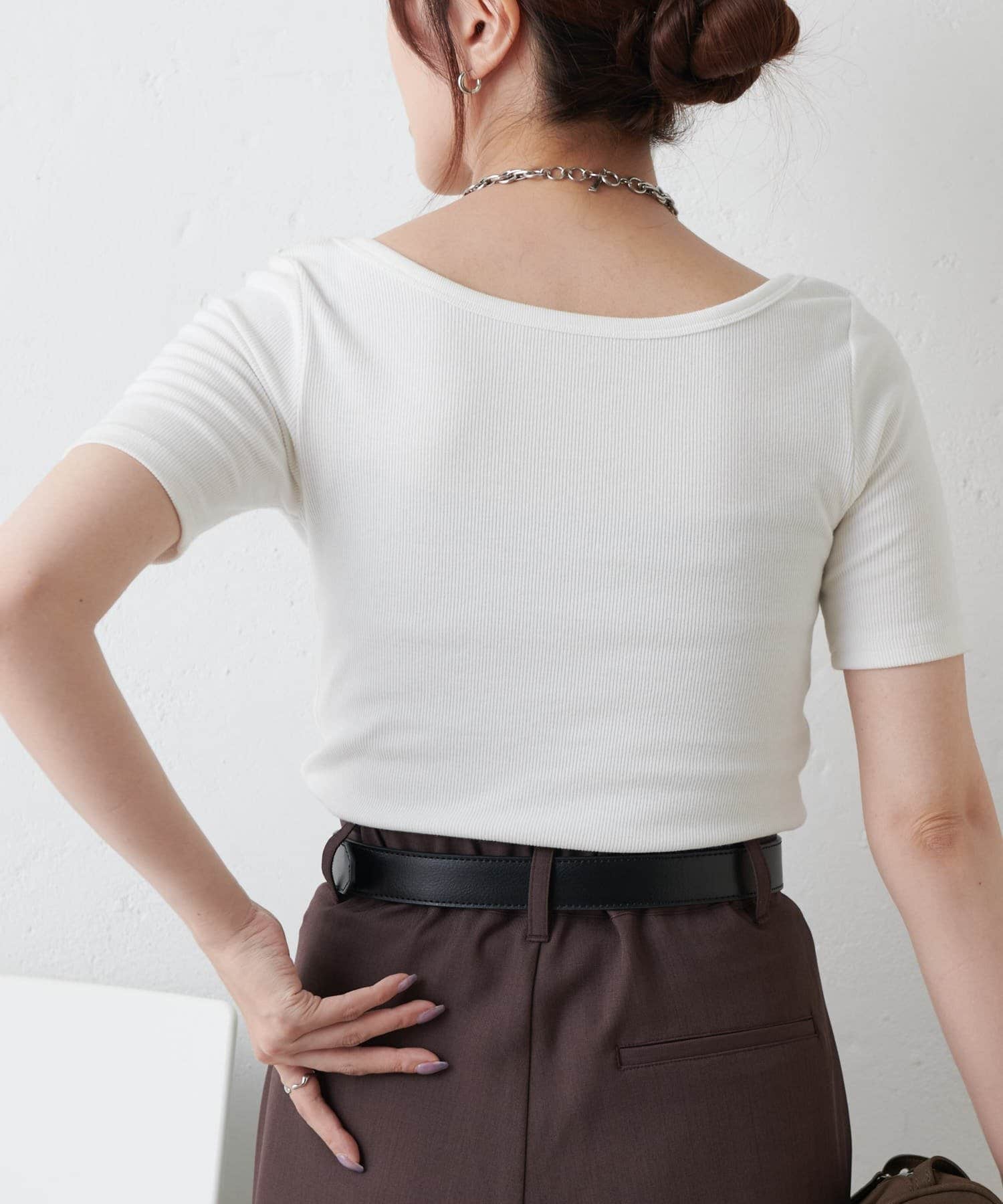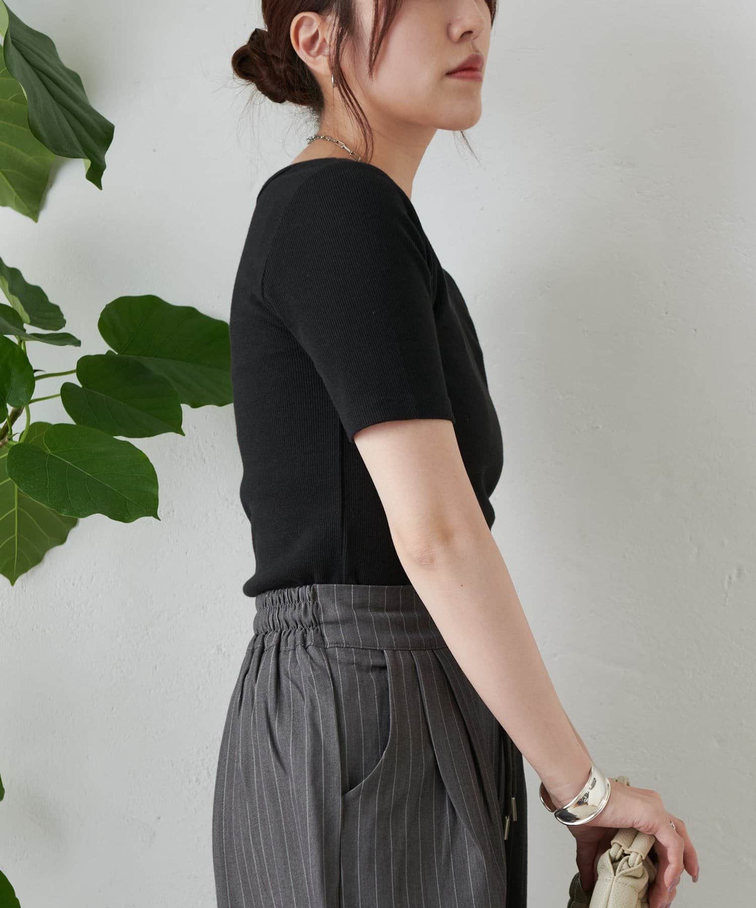 【デコルテが美しく見えるシンプルリブ半袖T】