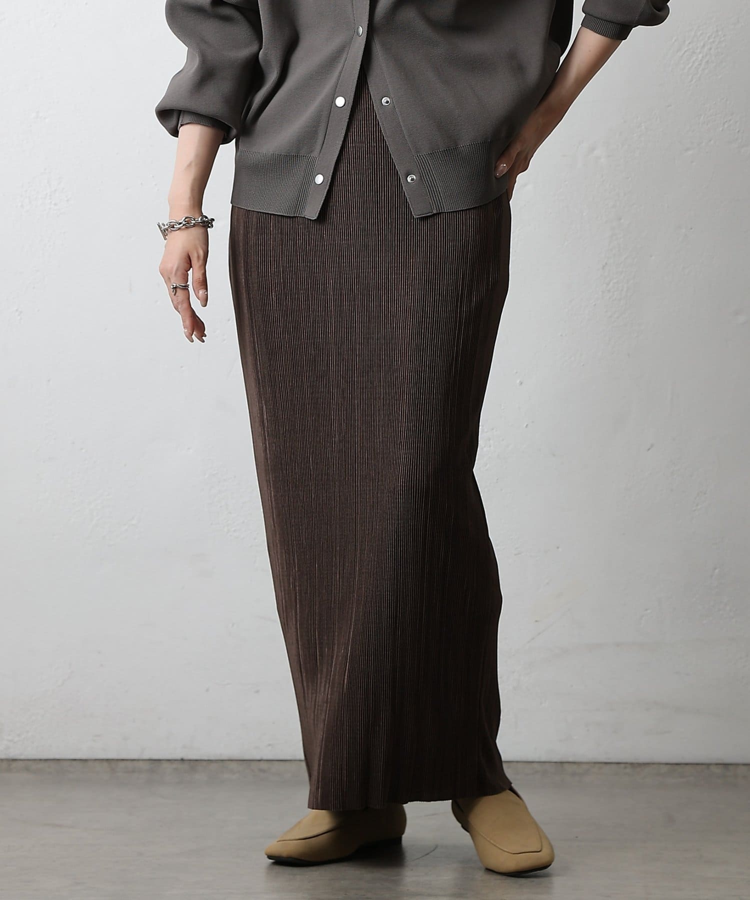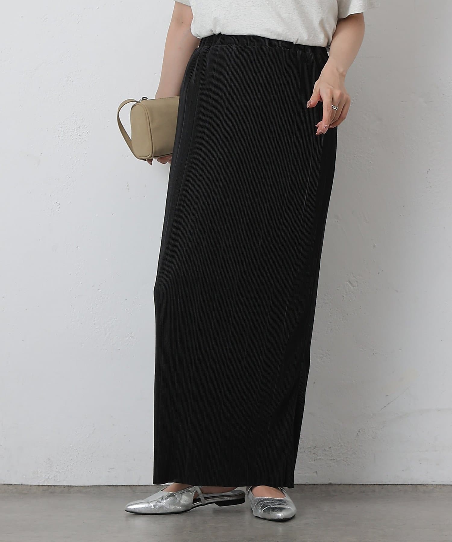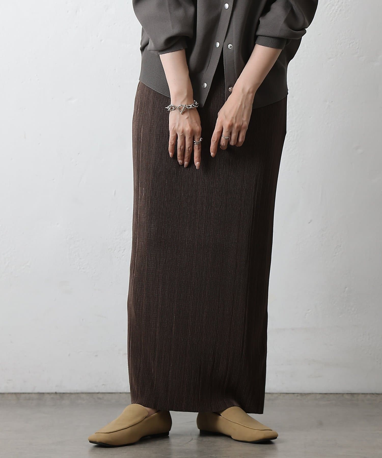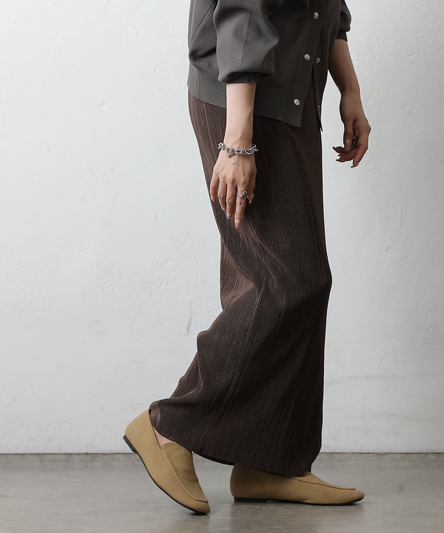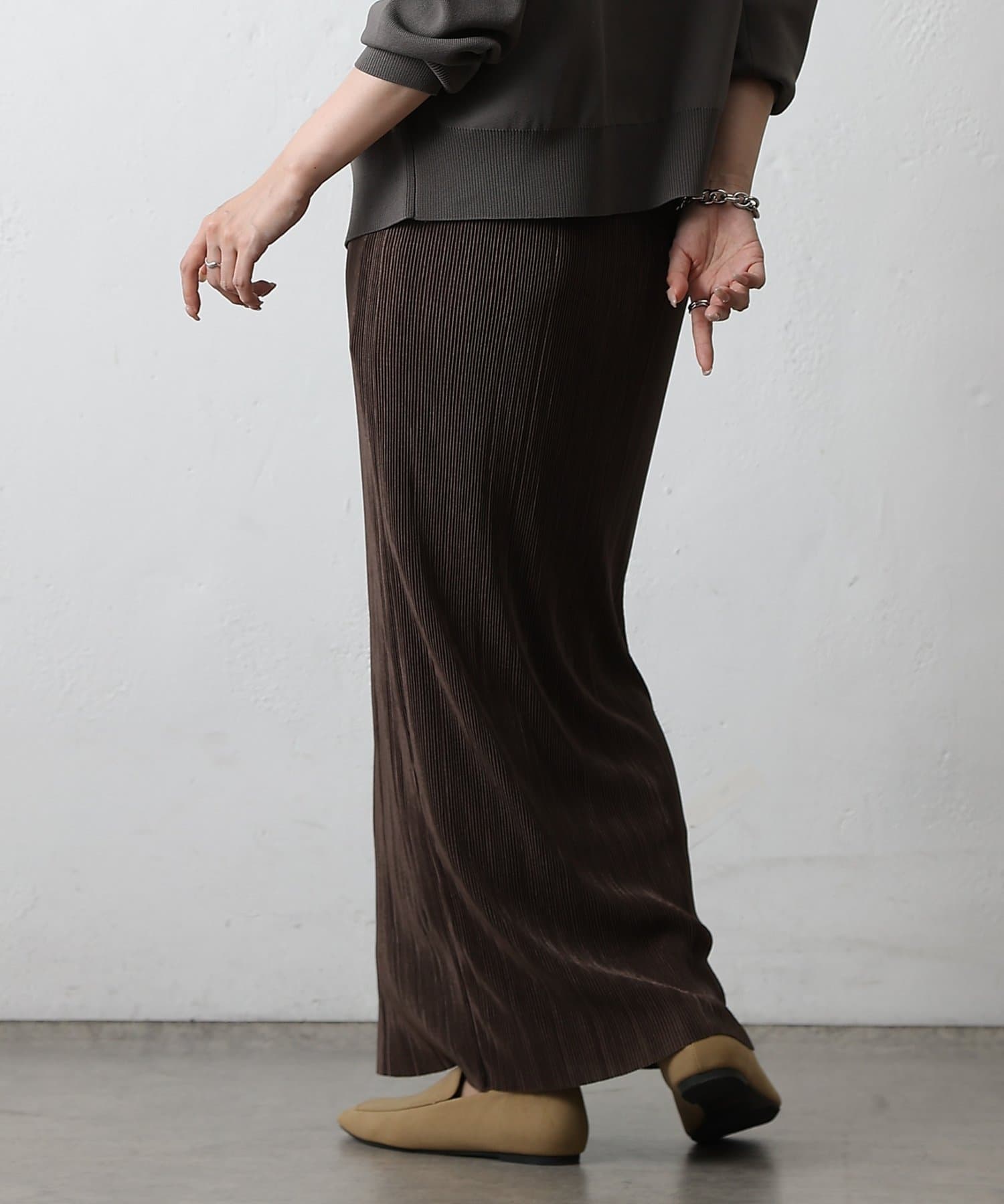歩くたびに上品な光沢を放ち、繊細なプリーツが優雅に揺れるロングスカート。