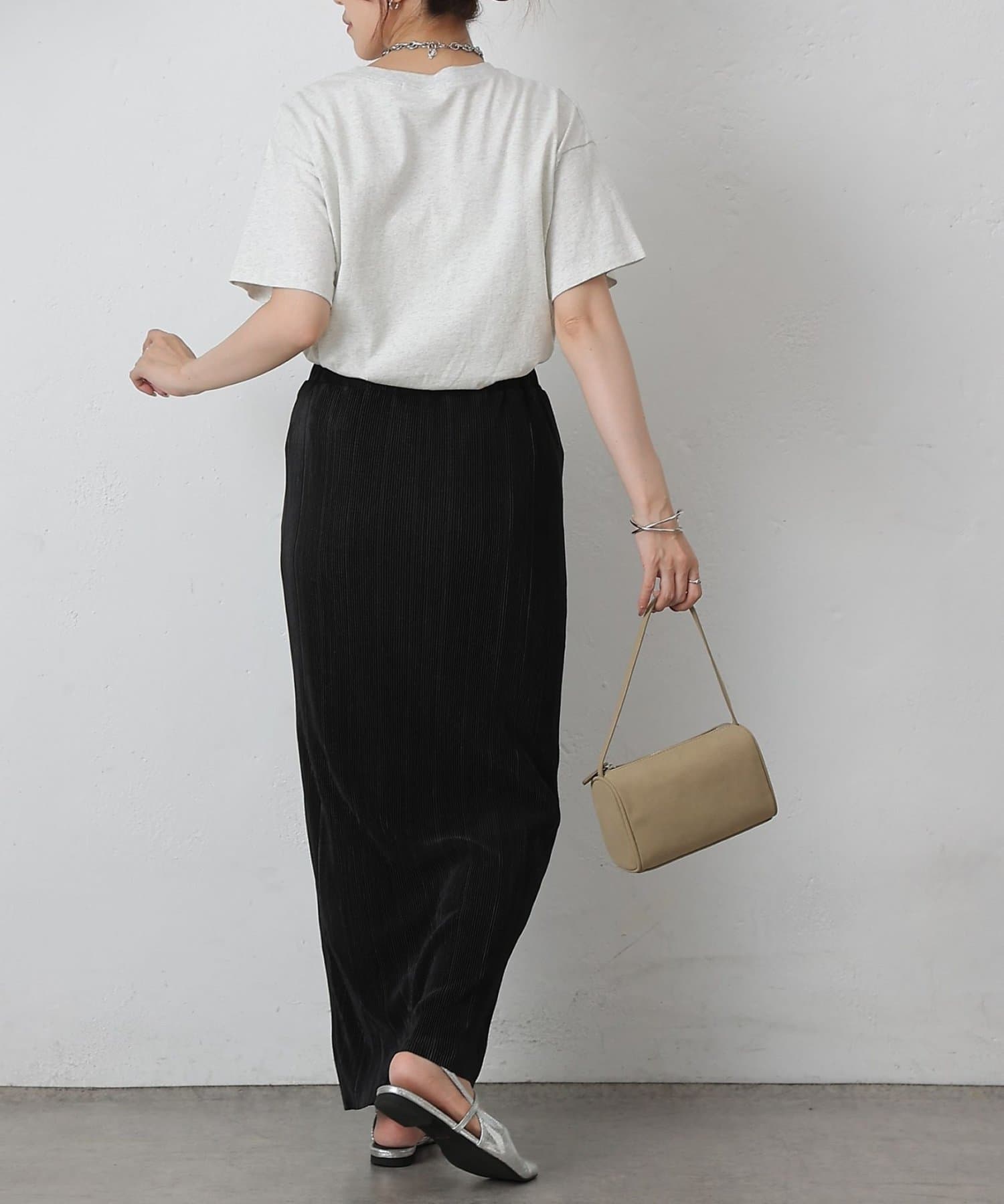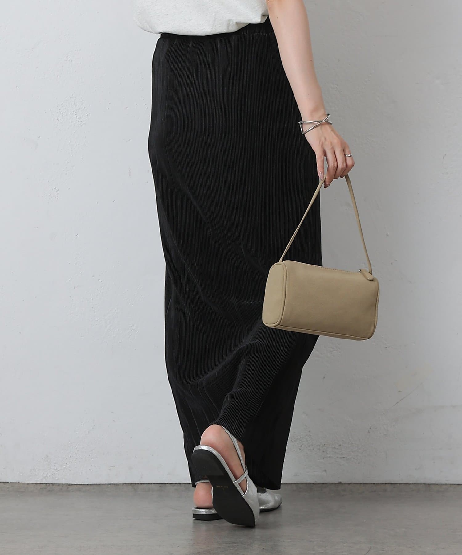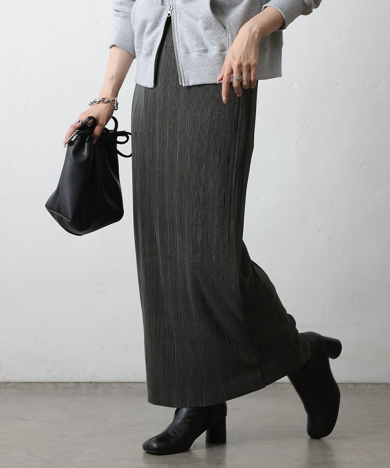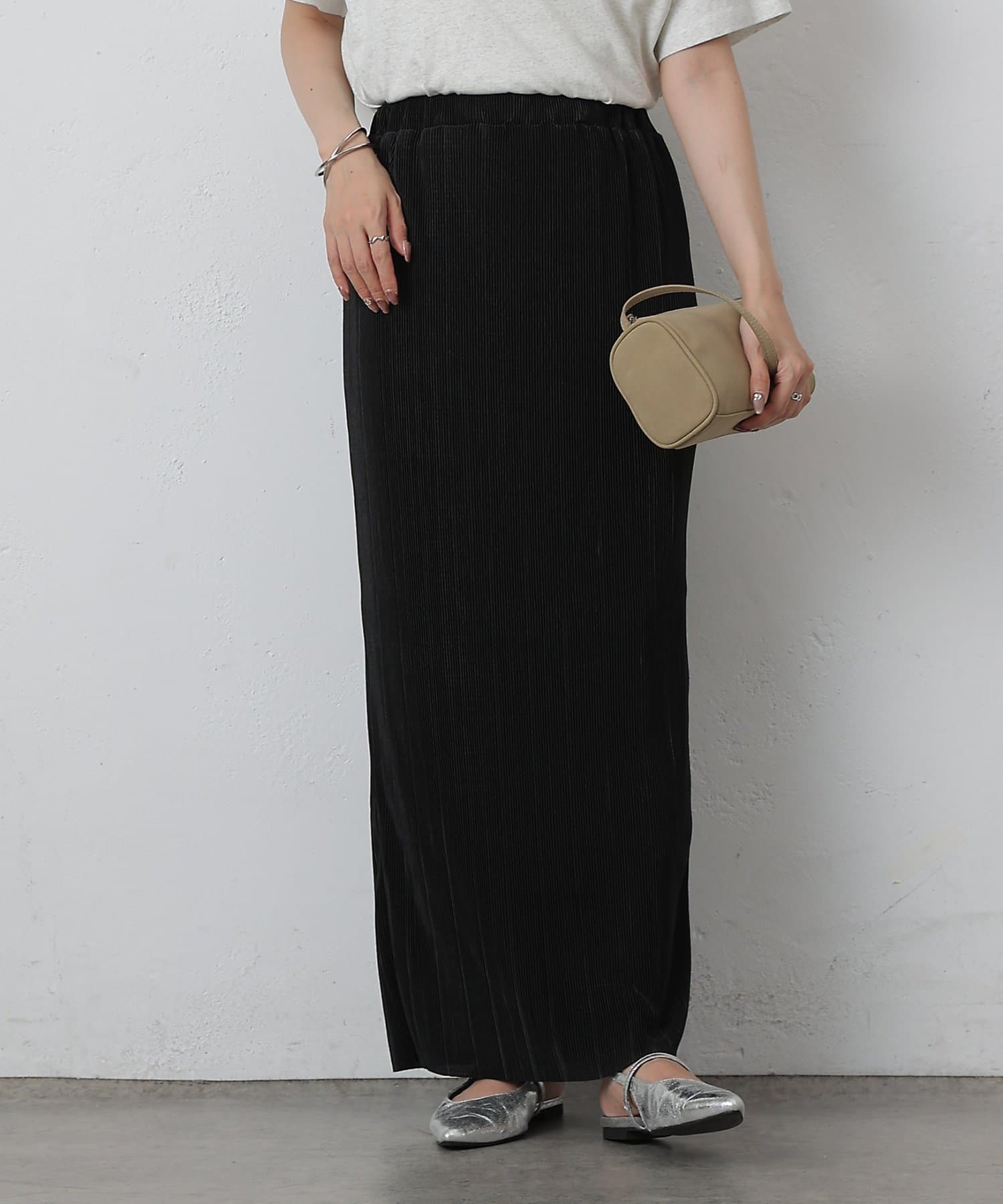 歩くたびに上品な光沢を放ち、繊細なプリーツが優雅に揺れるロングスカート。