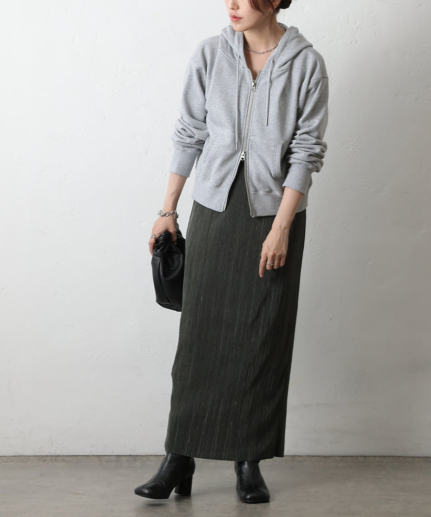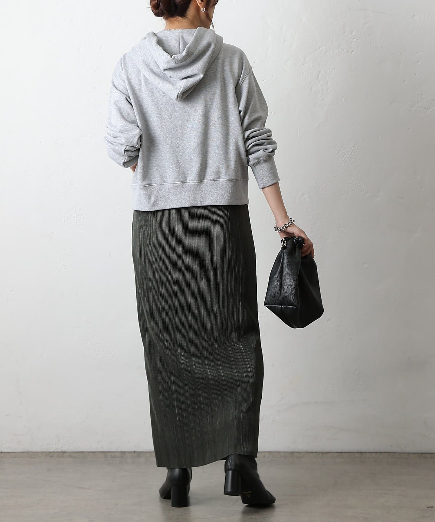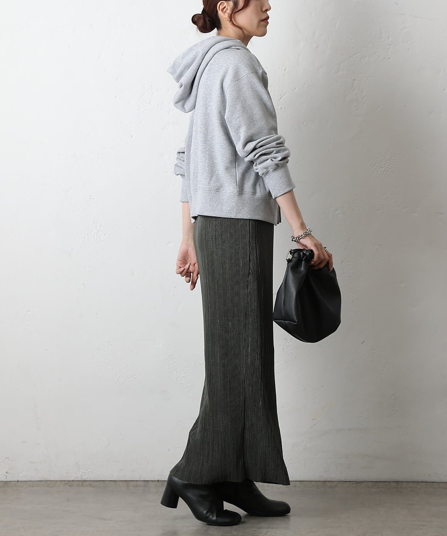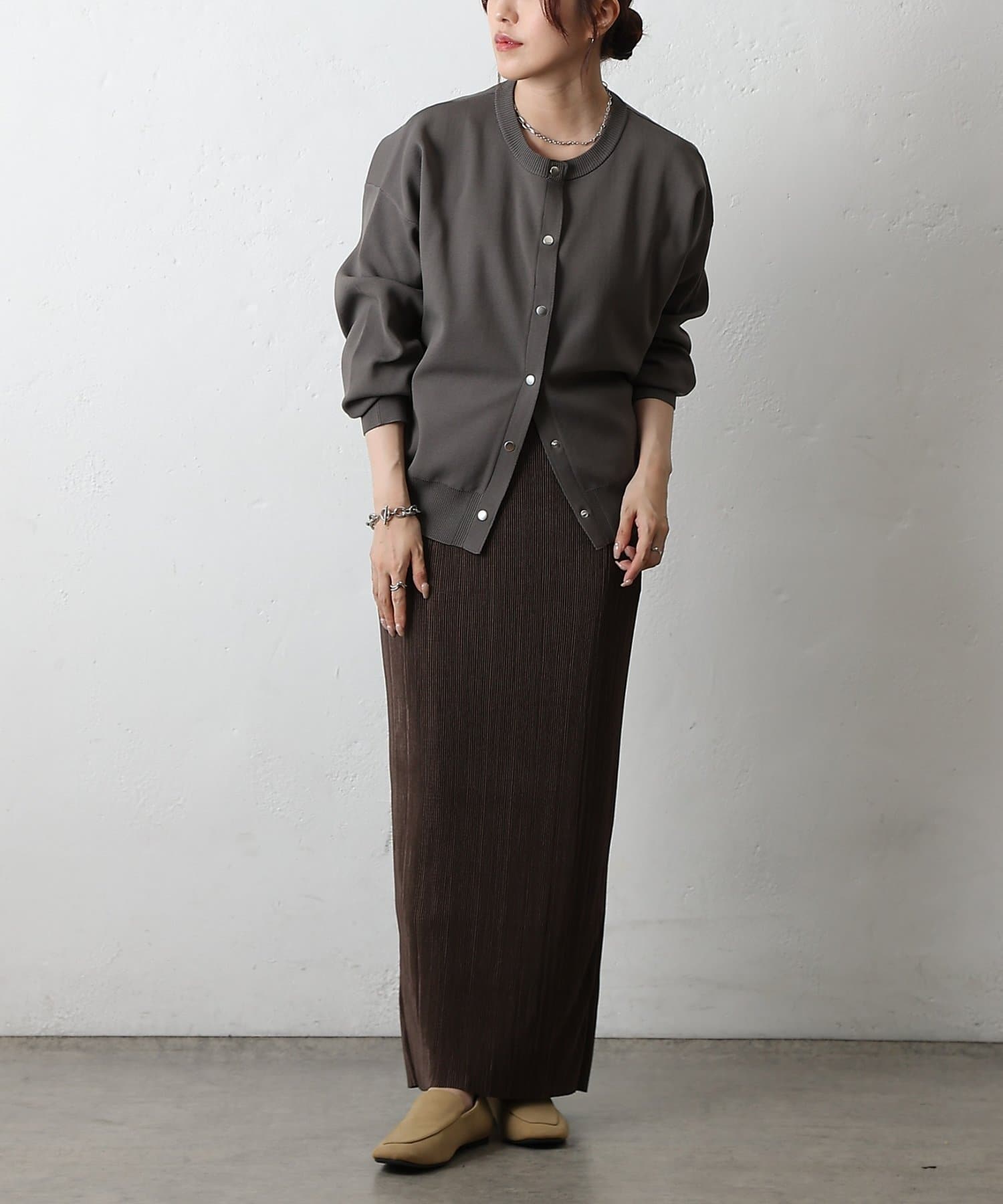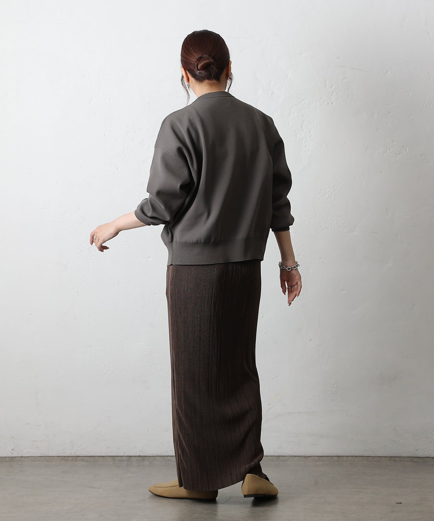 歩くたびに上品な光沢を放ち、繊細なプリーツが優雅に揺れるロングスカート。