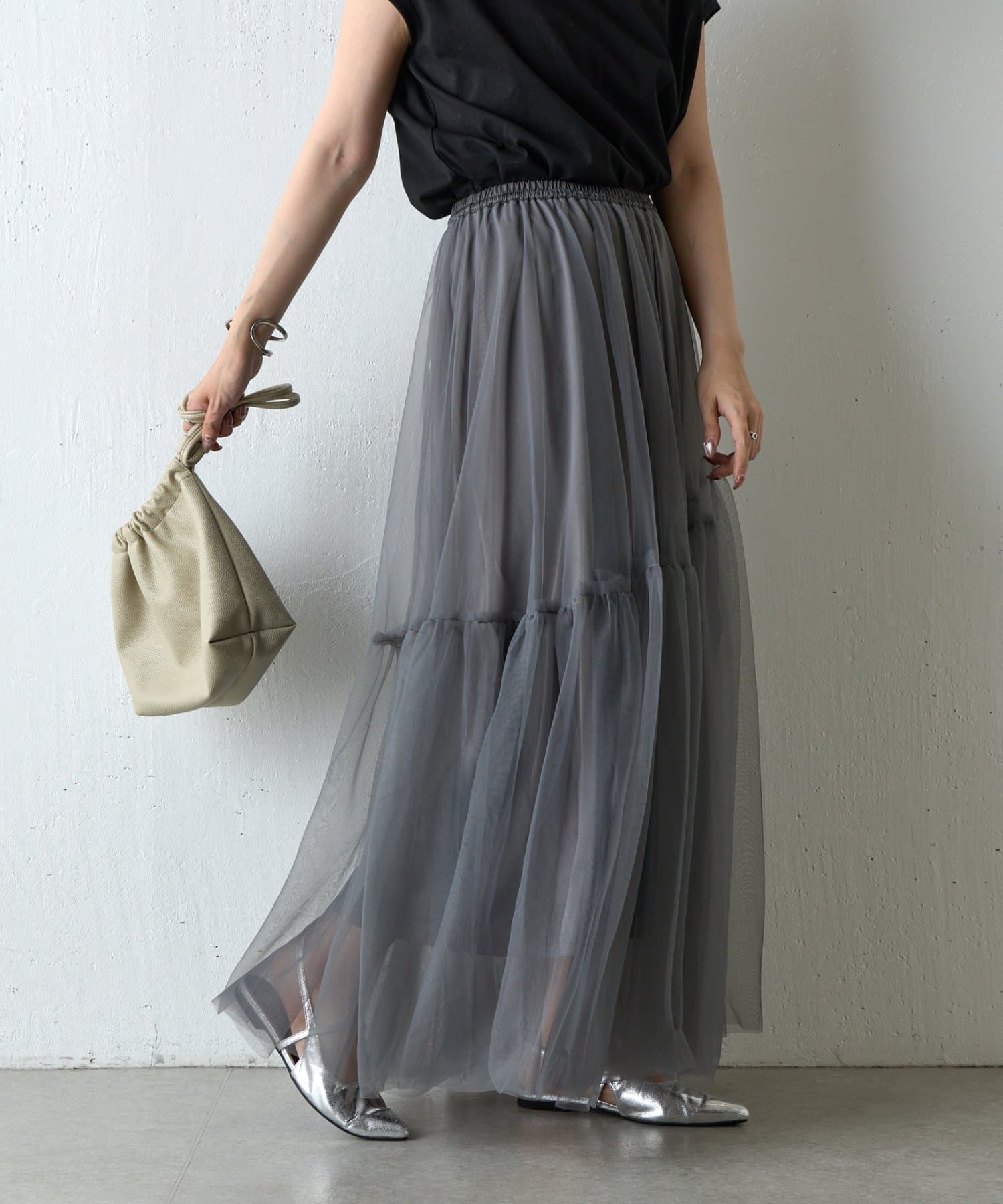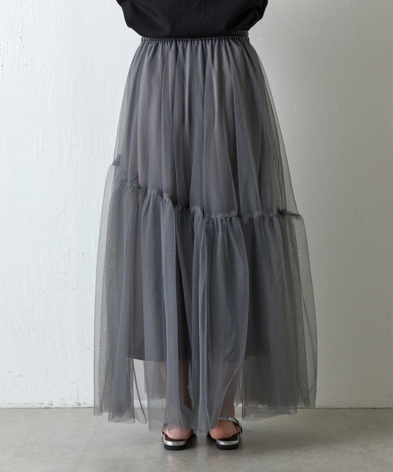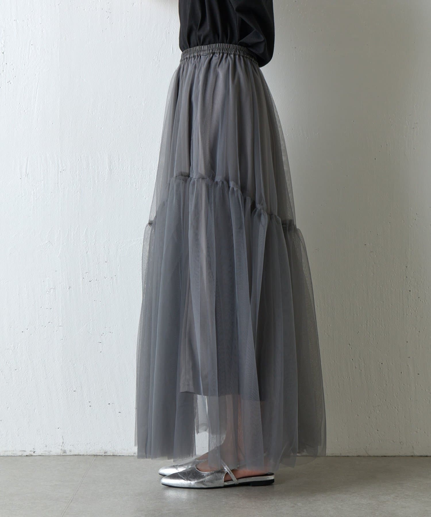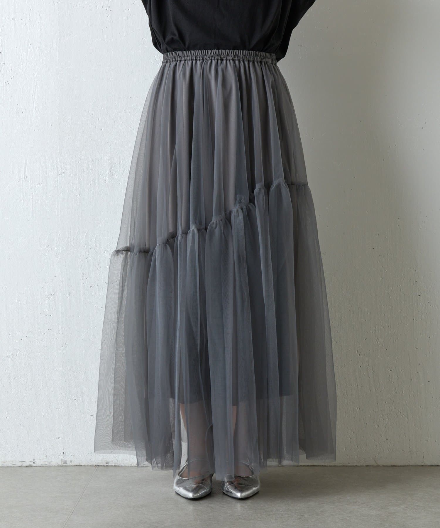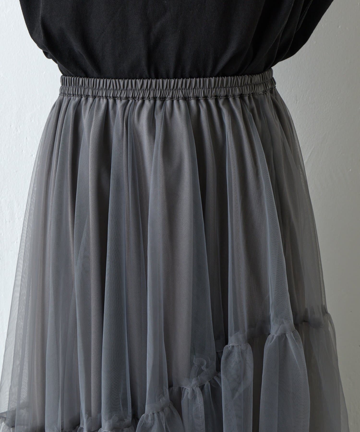 動きのある表情を楽しめる変形ティアードデザインが魅力のチュールスカート。