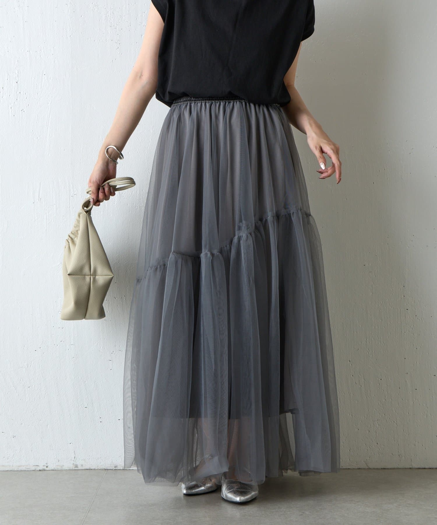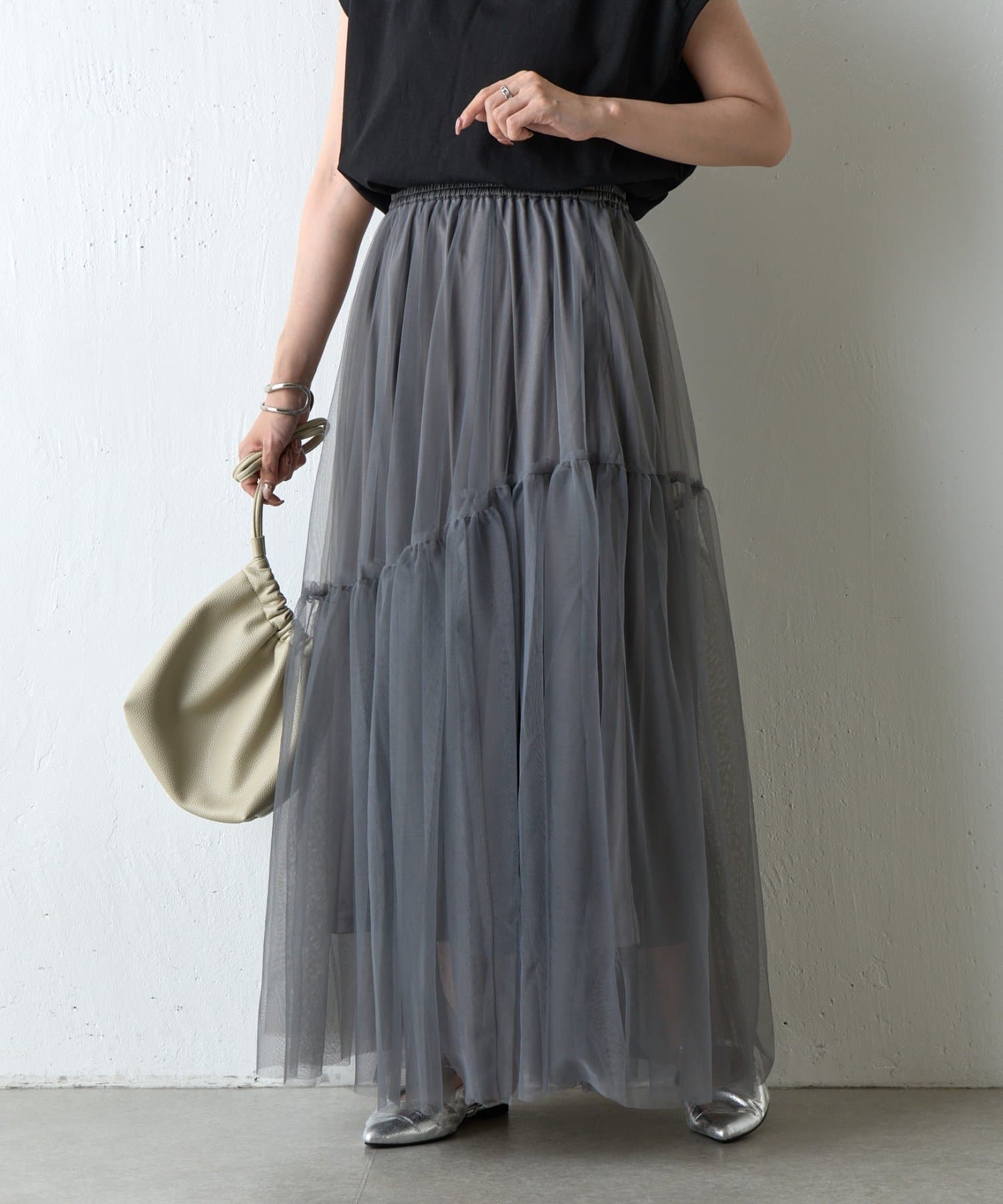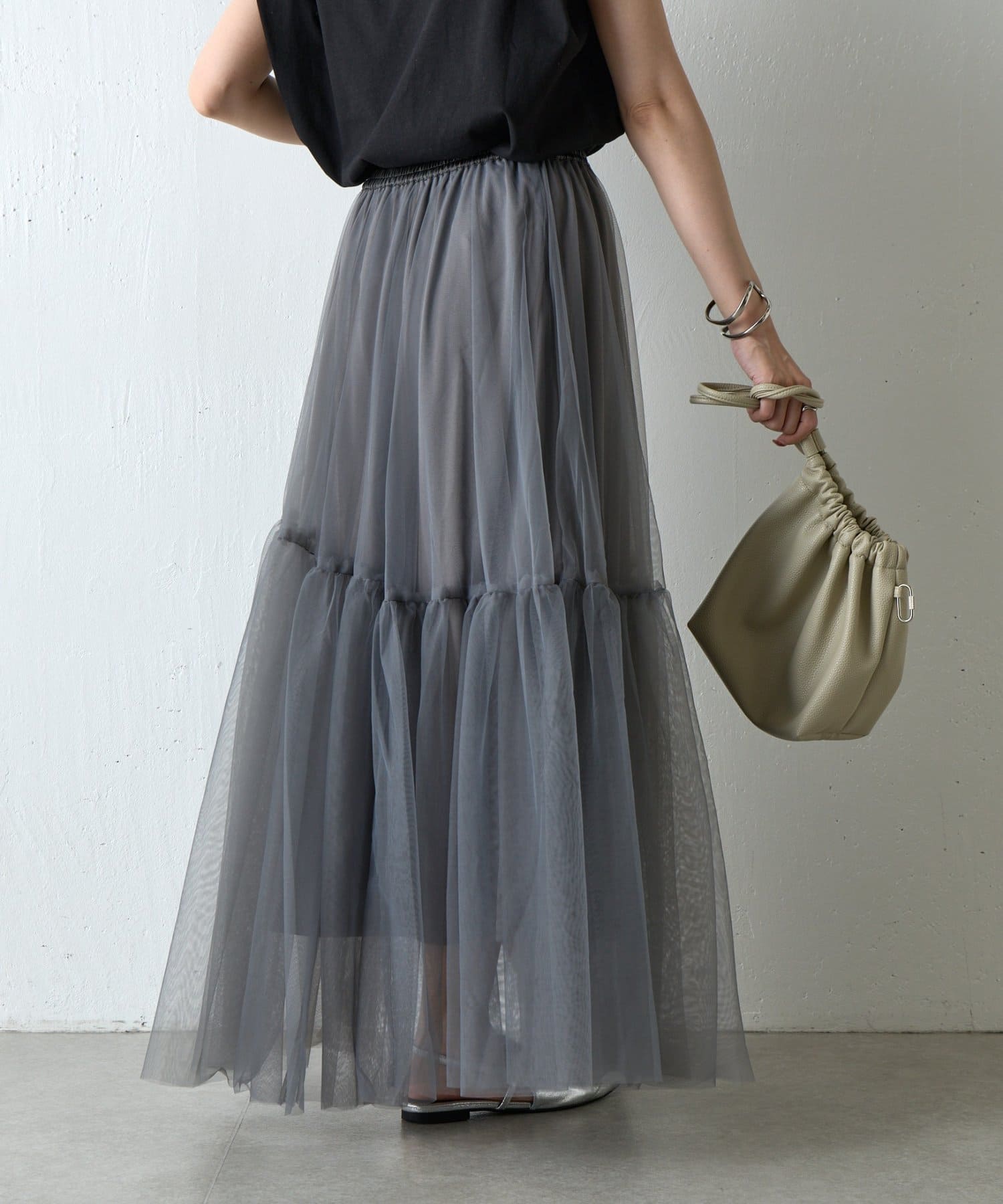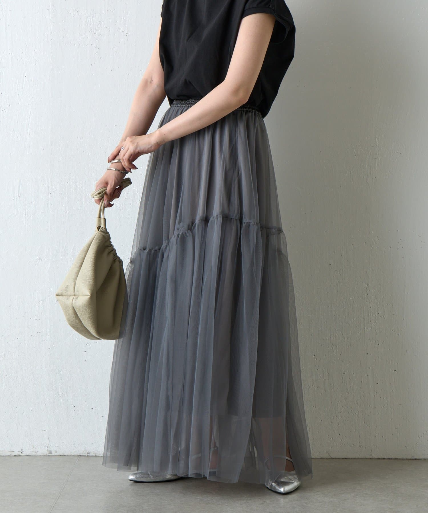 動きのある表情を楽しめる変形ティアードデザインが魅力のチュールスカート。