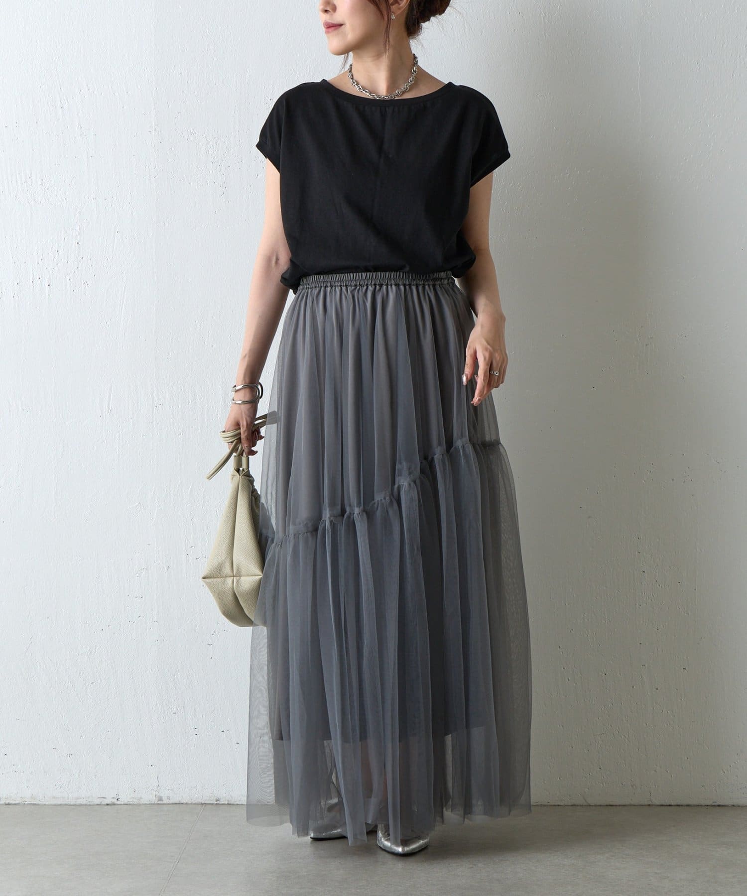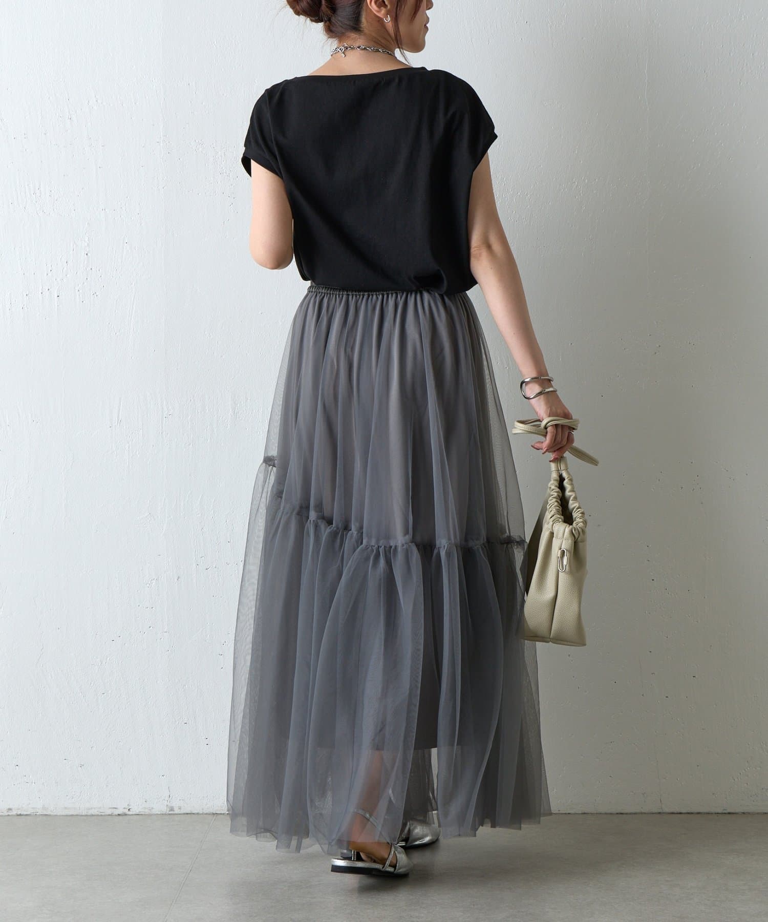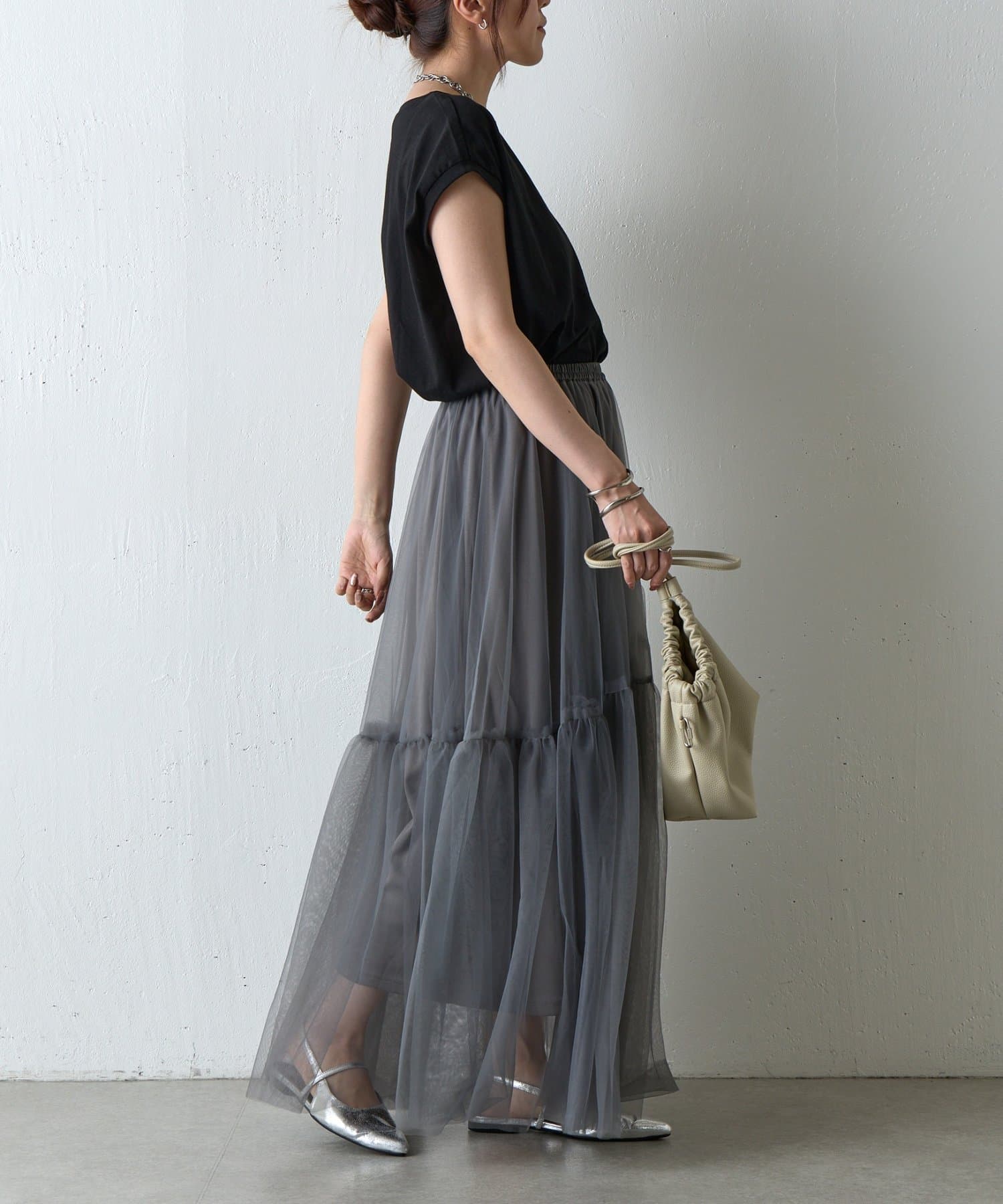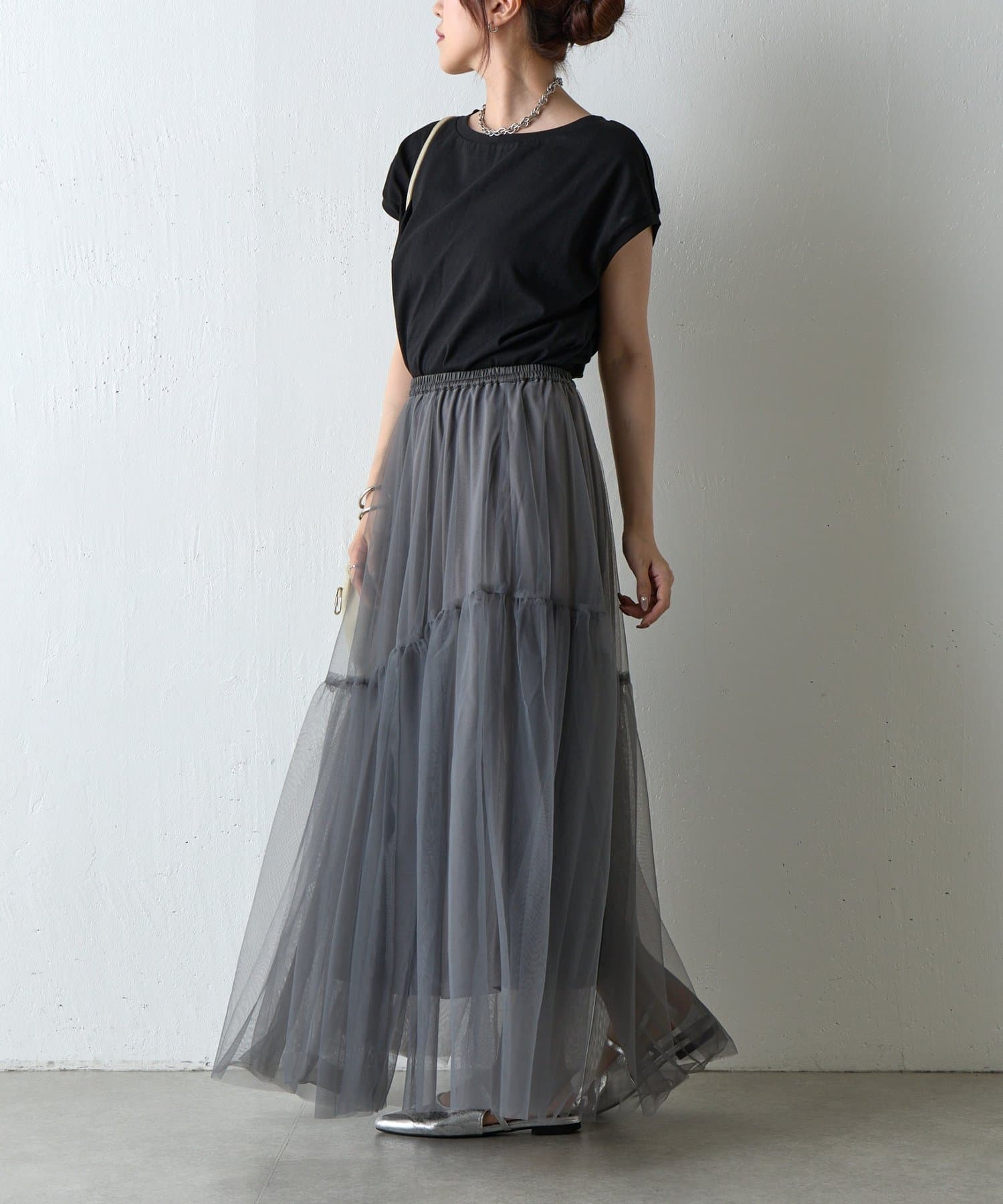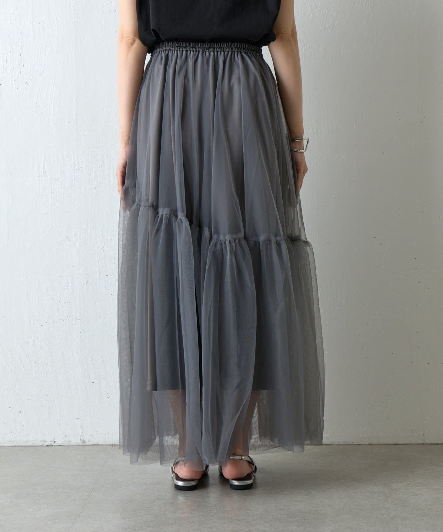 動きのある表情を楽しめる変形ティアードデザインが魅力のチュールスカート。
