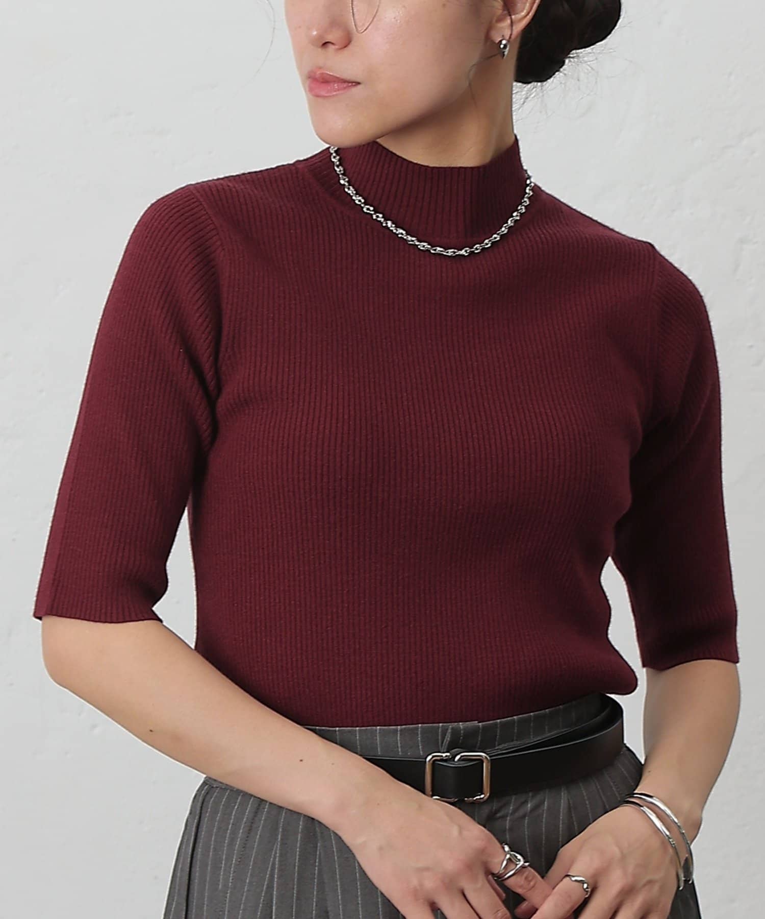 首元をきちんと見せるハイネックと、二の腕をしっかりカバーする5分袖で、シンプルながらも上品な印象に仕上がる1枚です。