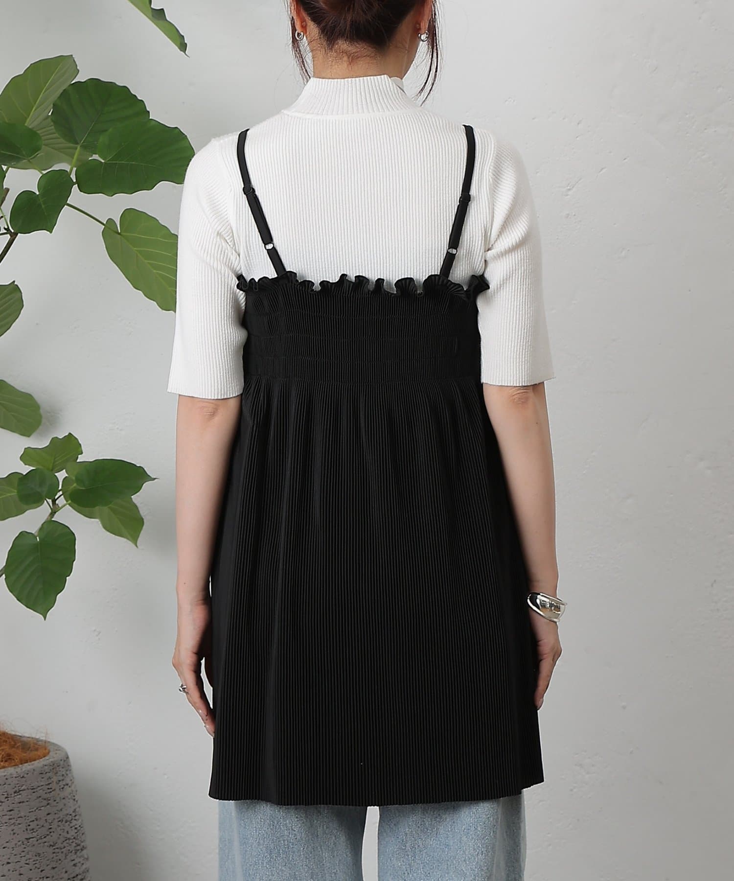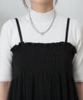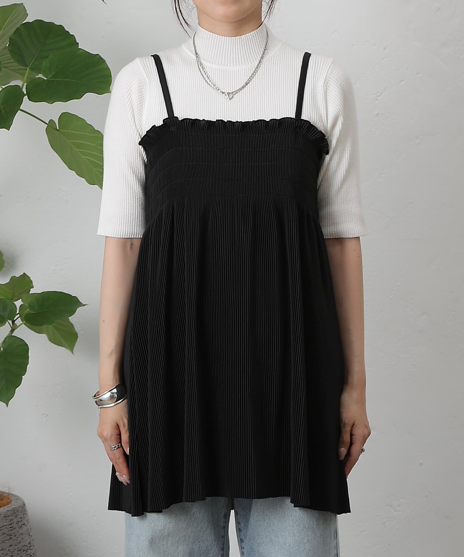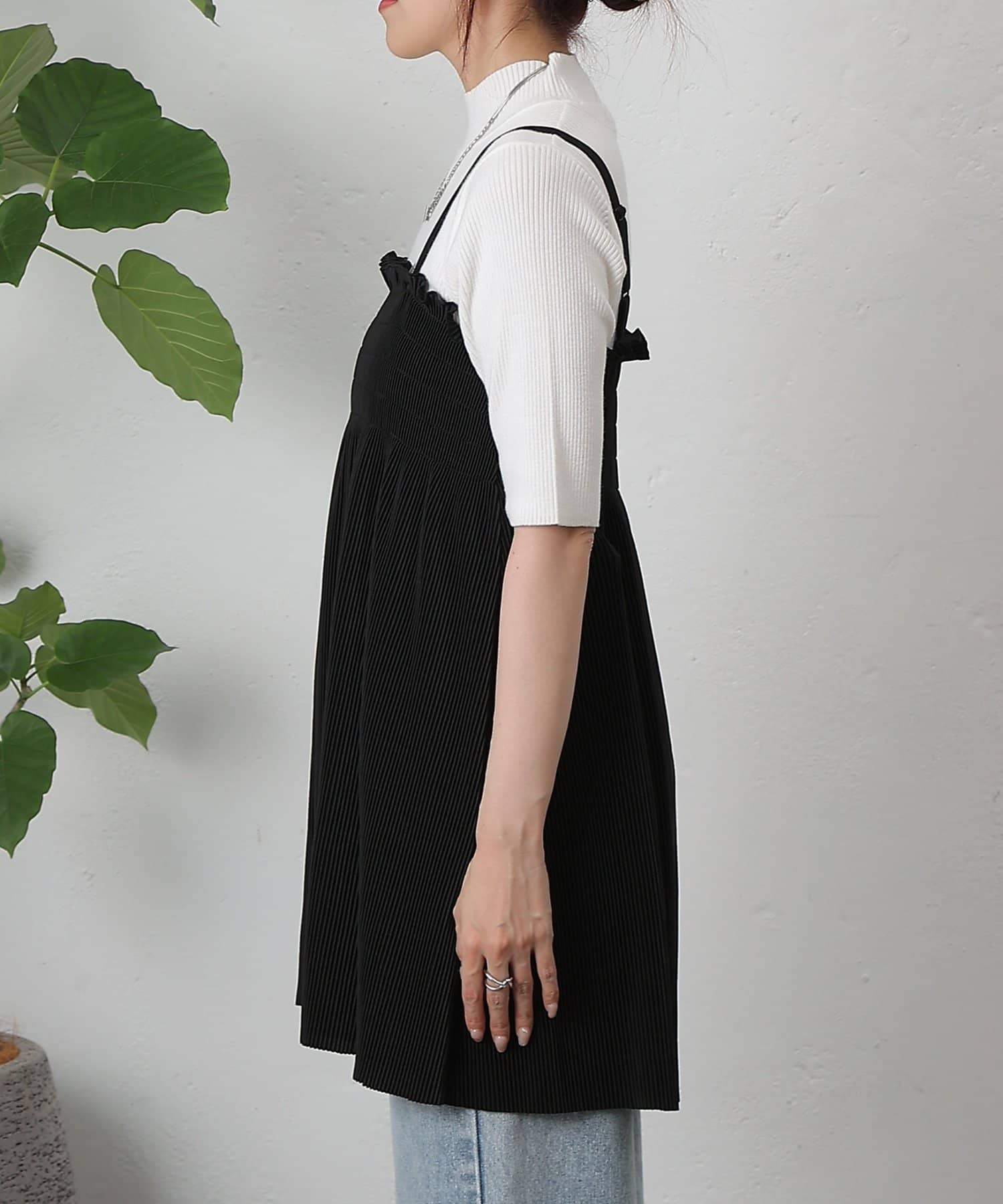 胸元にはシャーリング、全体には縦にプリーツが入っているため細見え効果も抜群です。