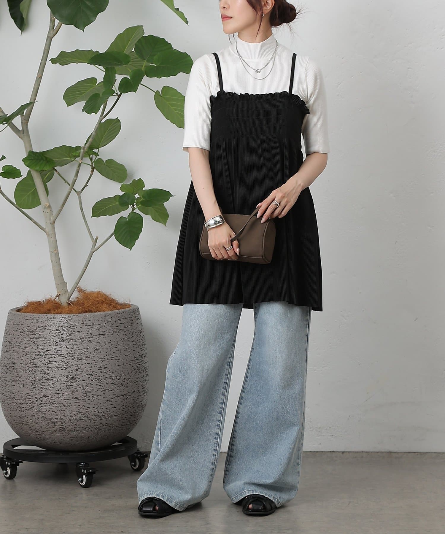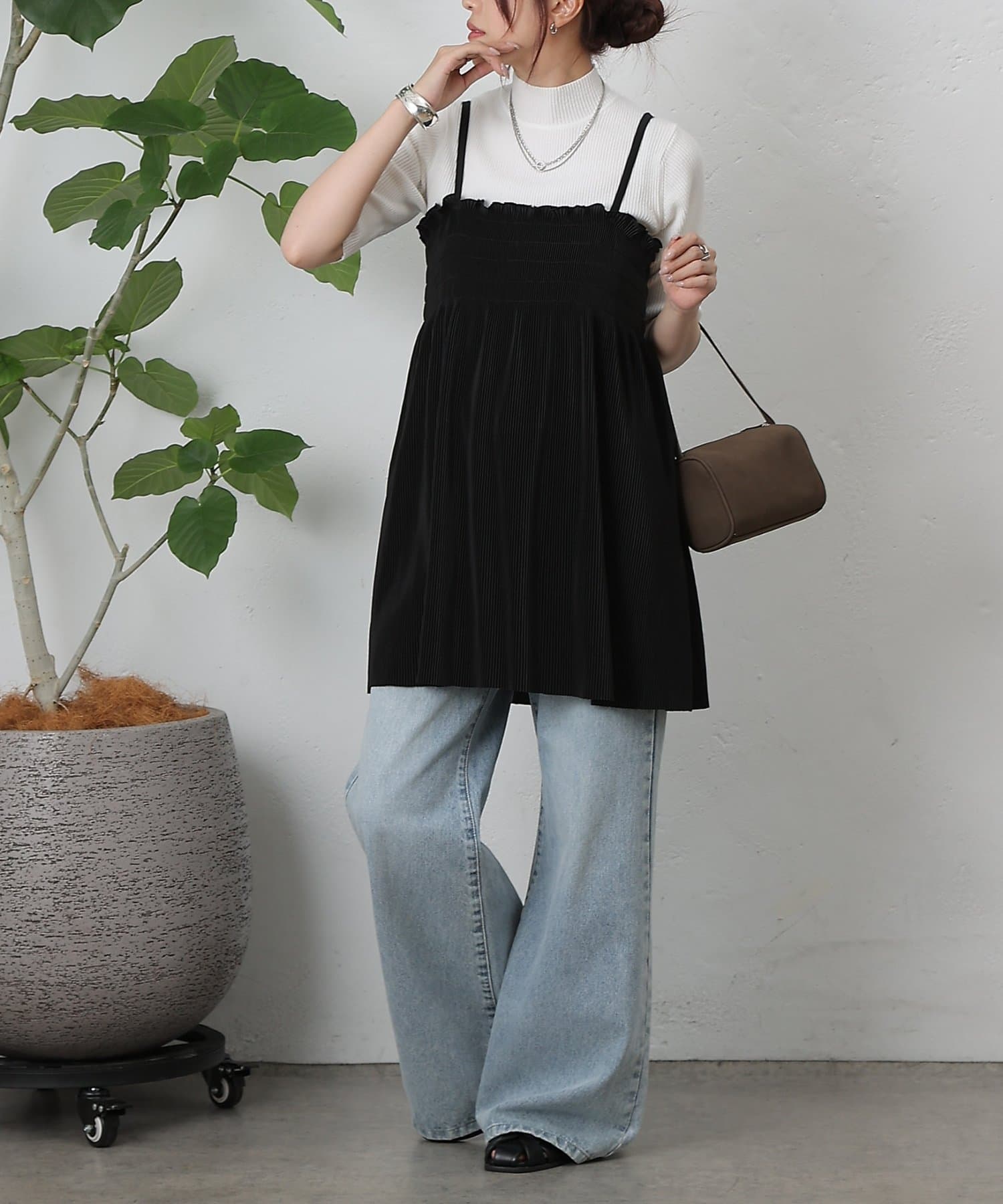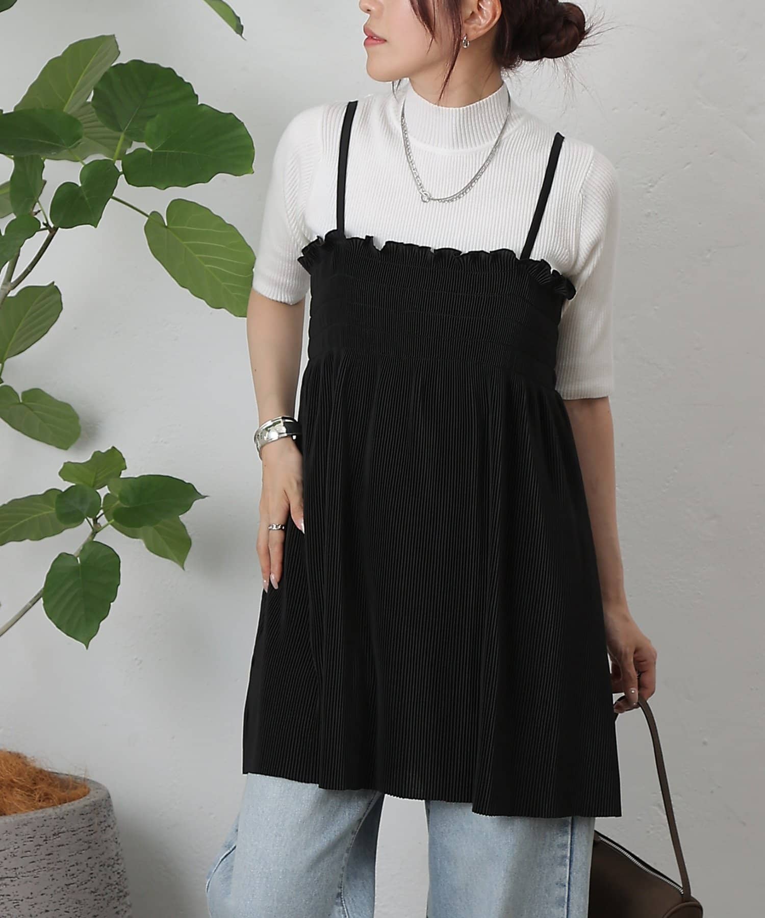 胸元にはシャーリング、全体には縦にプリーツが入っているため細見え効果も抜群です。