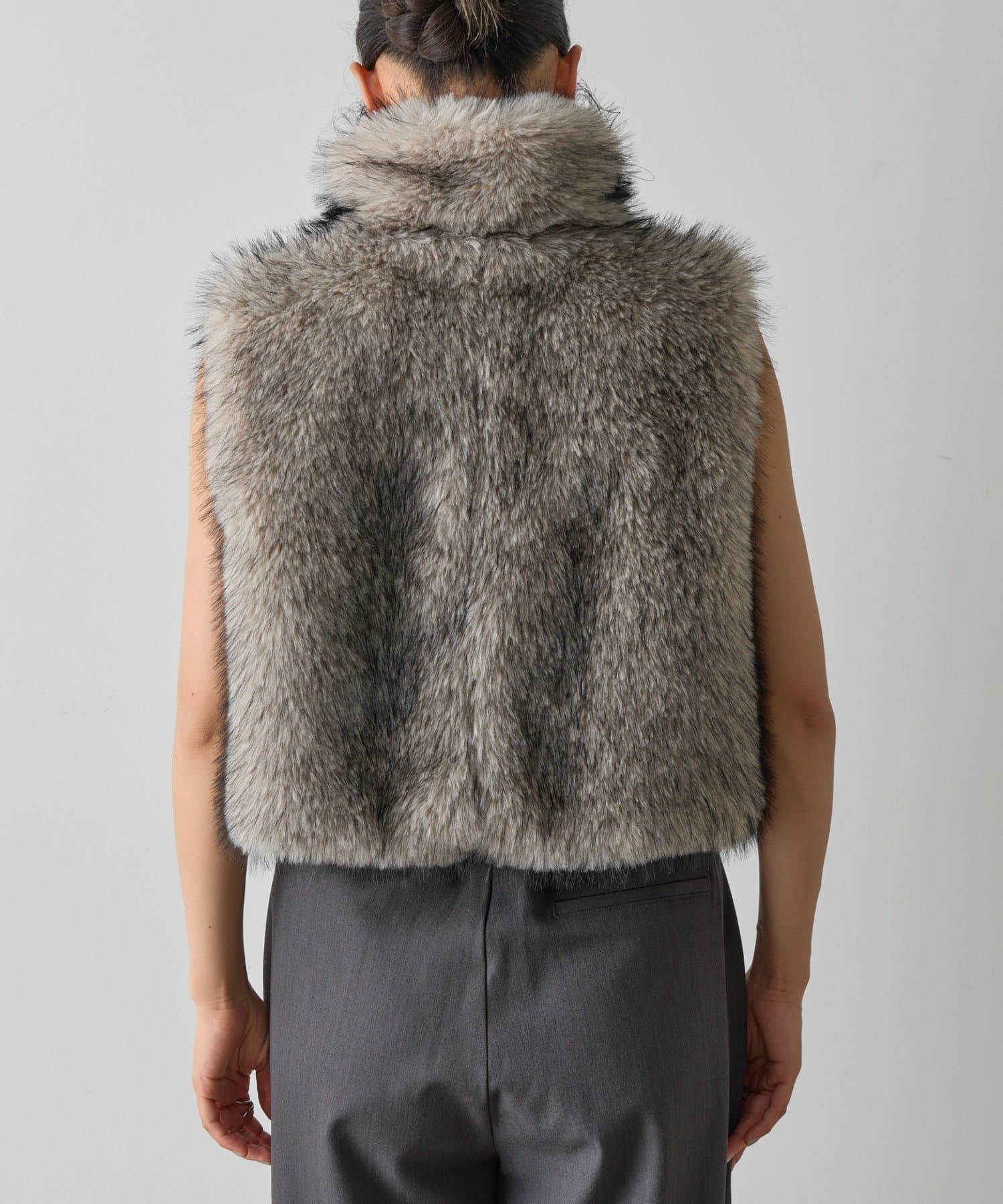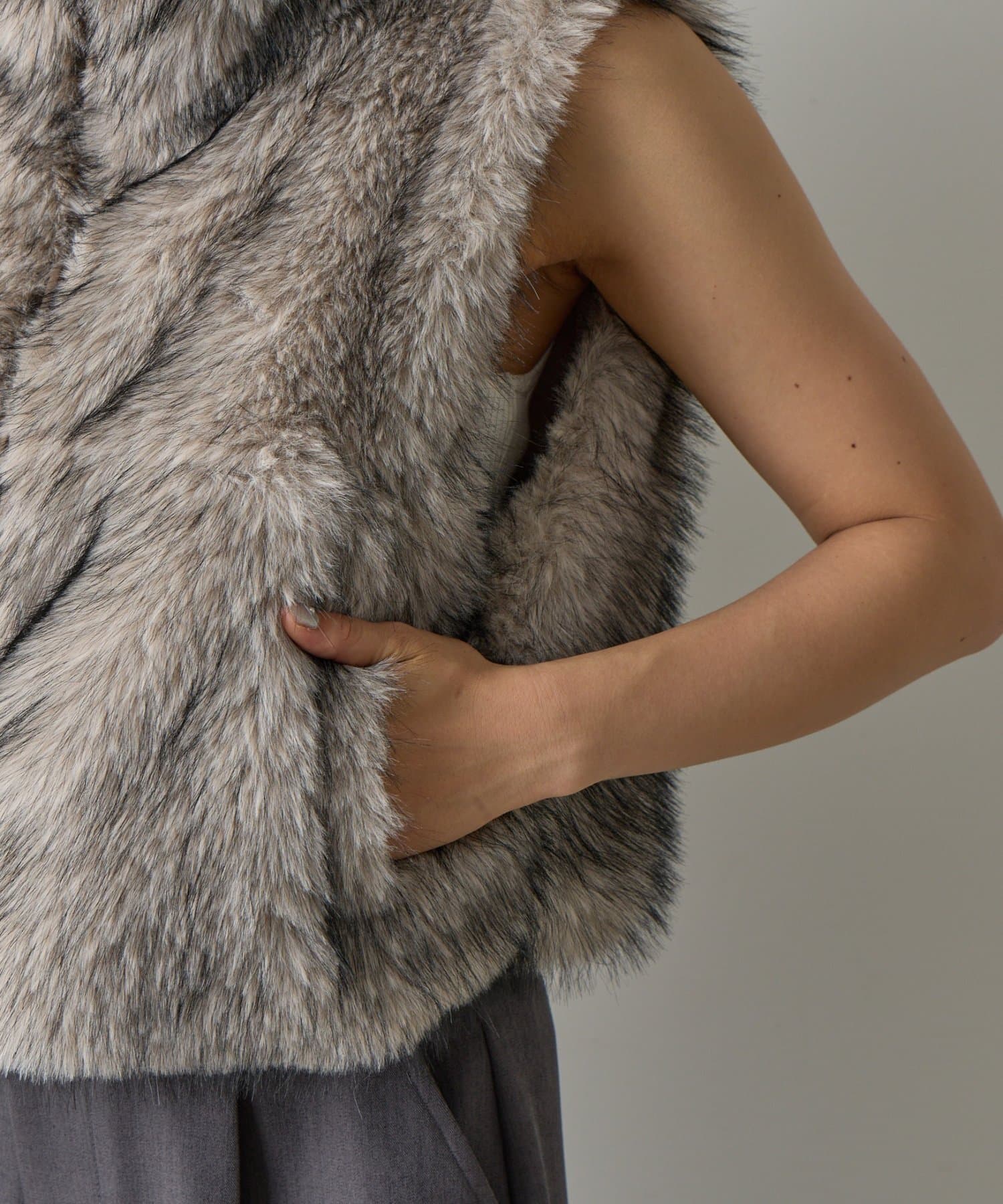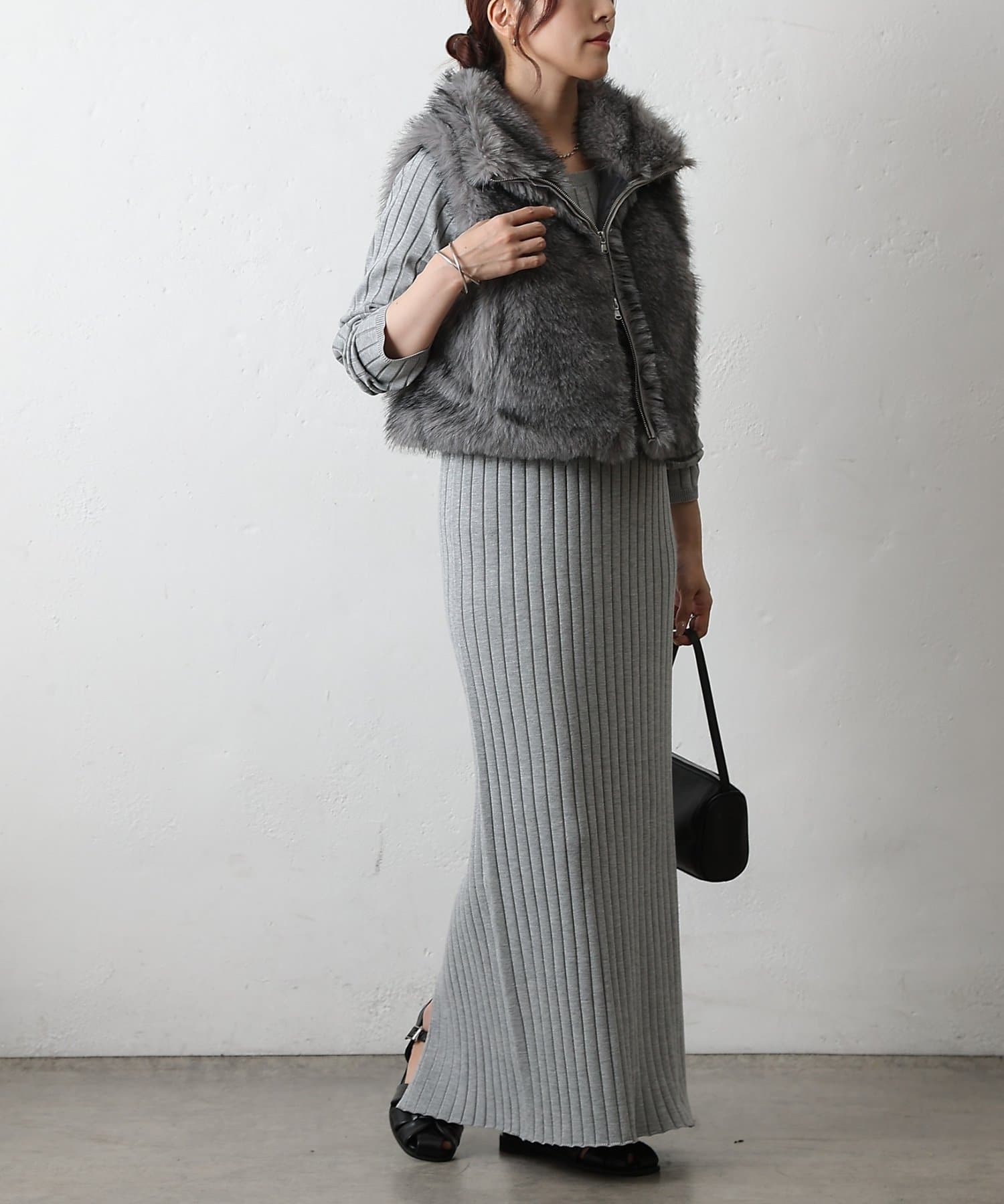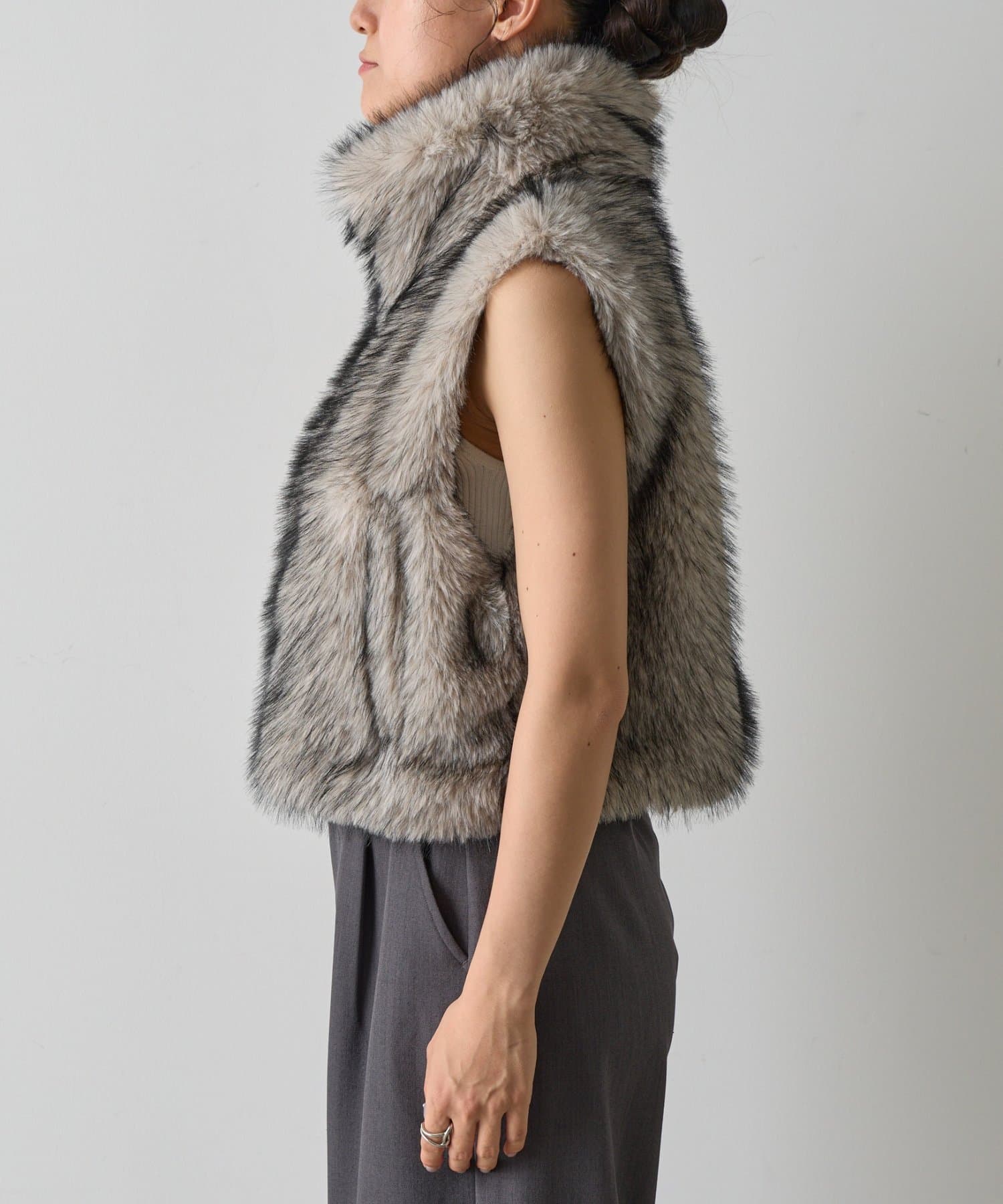 いつものコーディネートにプラスするだけで、ワンランク上のスタイリングが完成します。毛足の異なったファーを程よい密度でMIXすることで、まるで高級なリアルファーのような上品な光沢と心地よさを実現。思わず触れたくなるような、柔らかな質感にこだわりました。デザインにもこだわり、カジュアルにもきれいめにも合わせやすい絶妙な丈感に仕上げました。