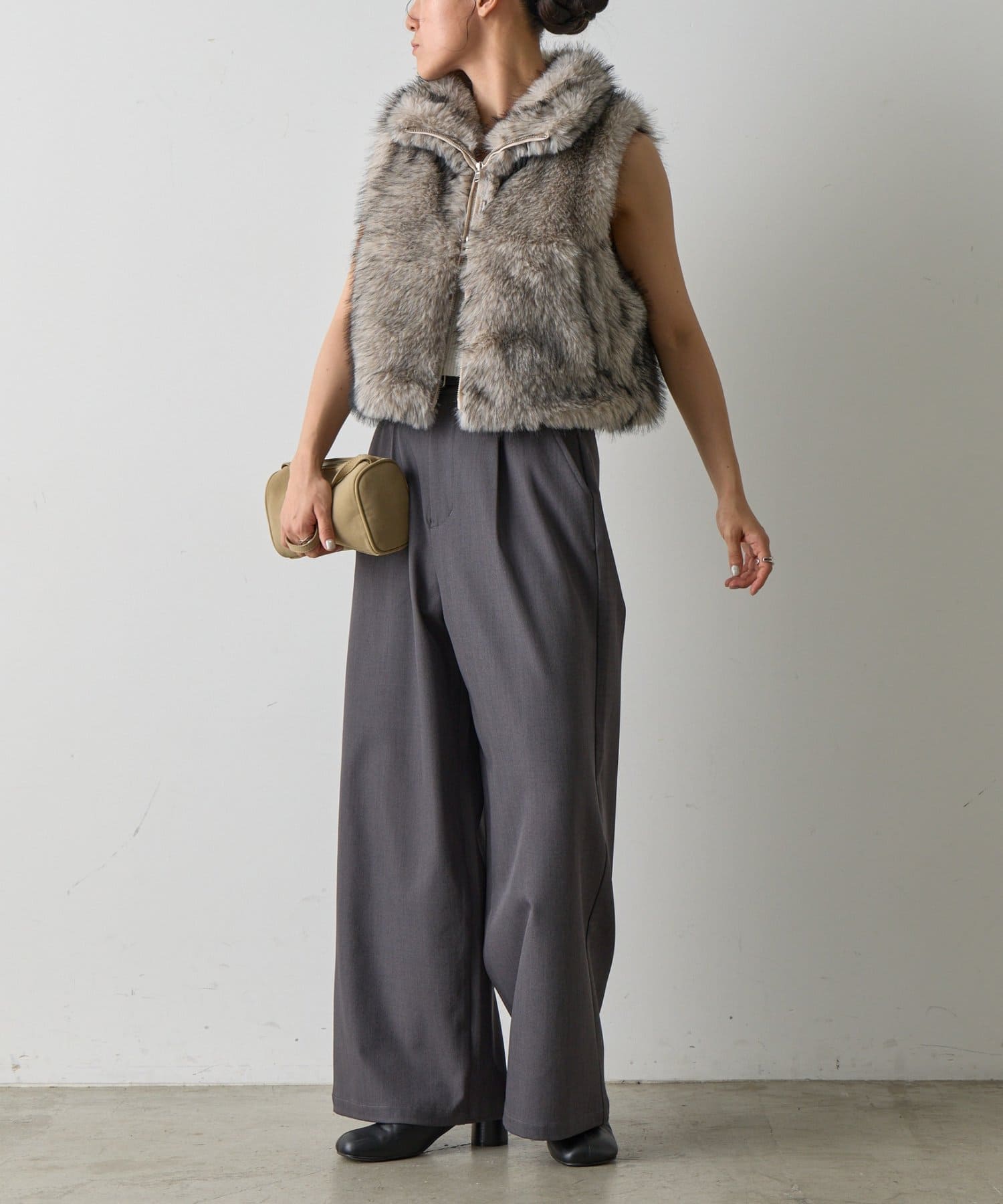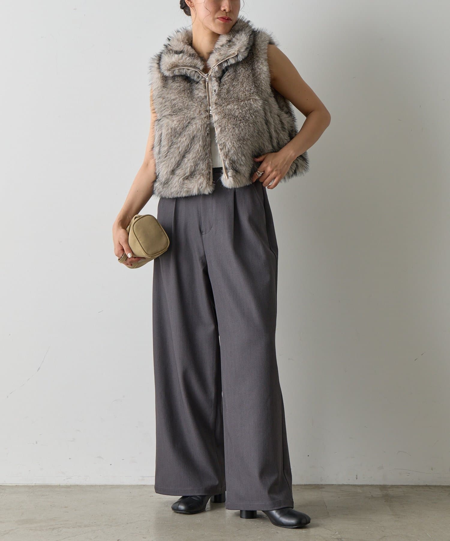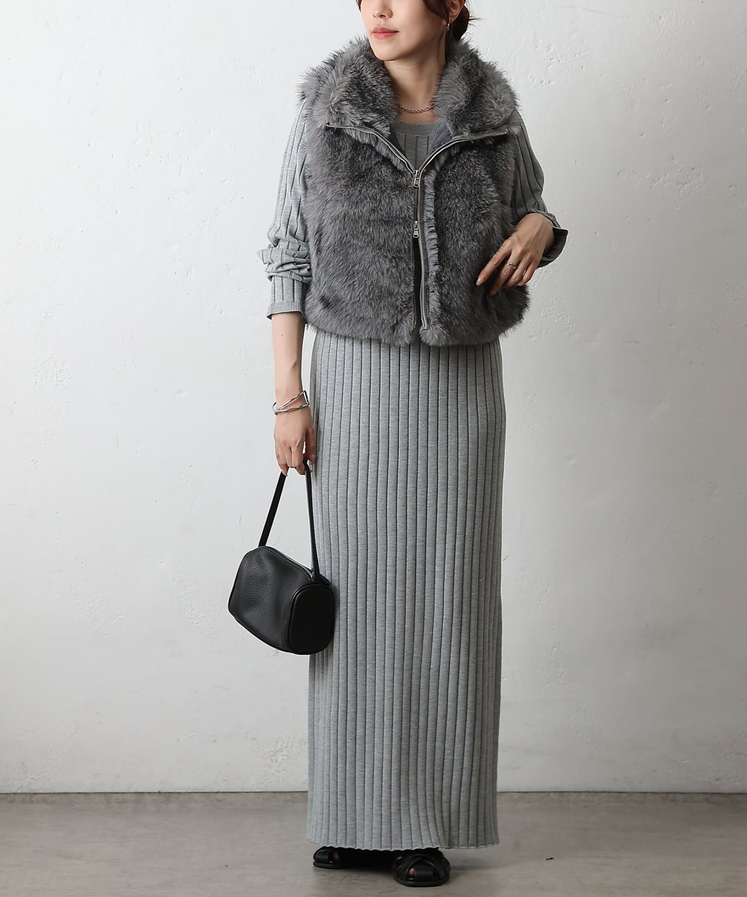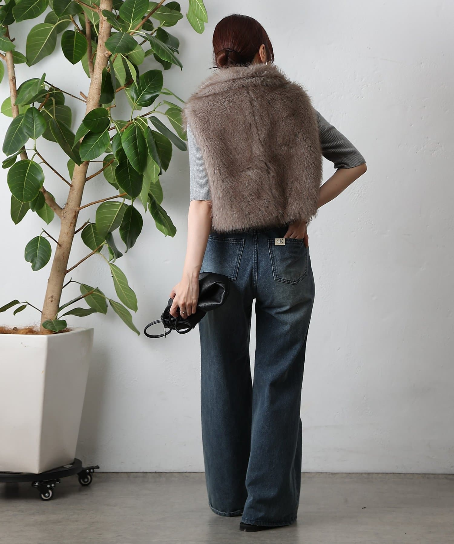いつものコーディネートにプラスするだけで、ワンランク上のスタイリングが完成します。毛足の異なったファーを程よい密度でMIXすることで、まるで高級なリアルファーのような上品な光沢と心地よさを実現。思わず触れたくなるような、柔らかな質感にこだわりました。デザインにもこだわり、カジュアルにもきれいめにも合わせやすい絶妙な丈感に仕上げました。