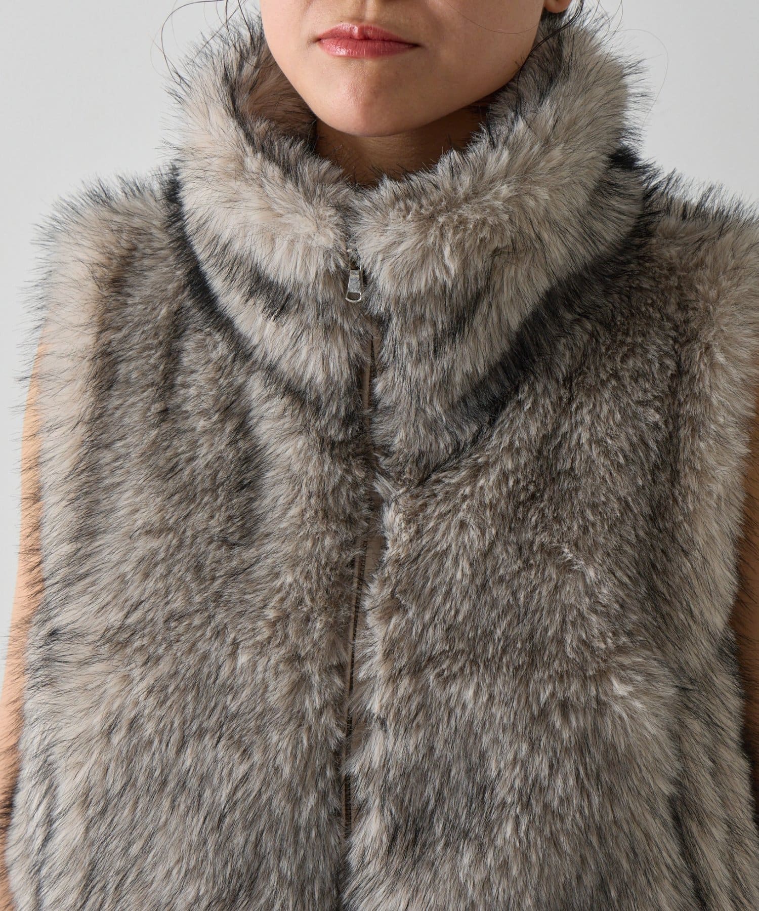 奥行きのあるミックスファーが、リッチで洗練された印象を与えるミックスシープのファーZIPベストが登場。