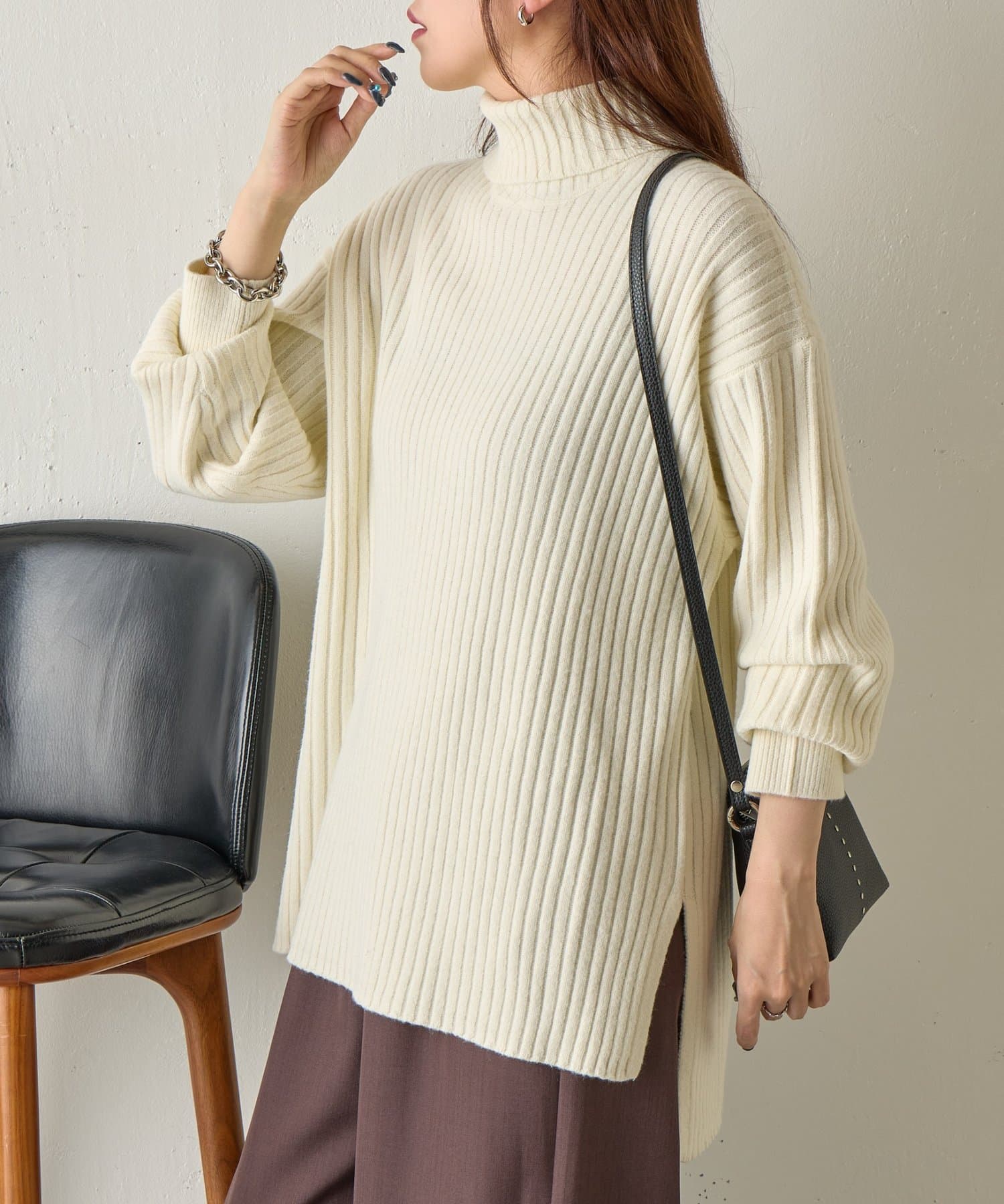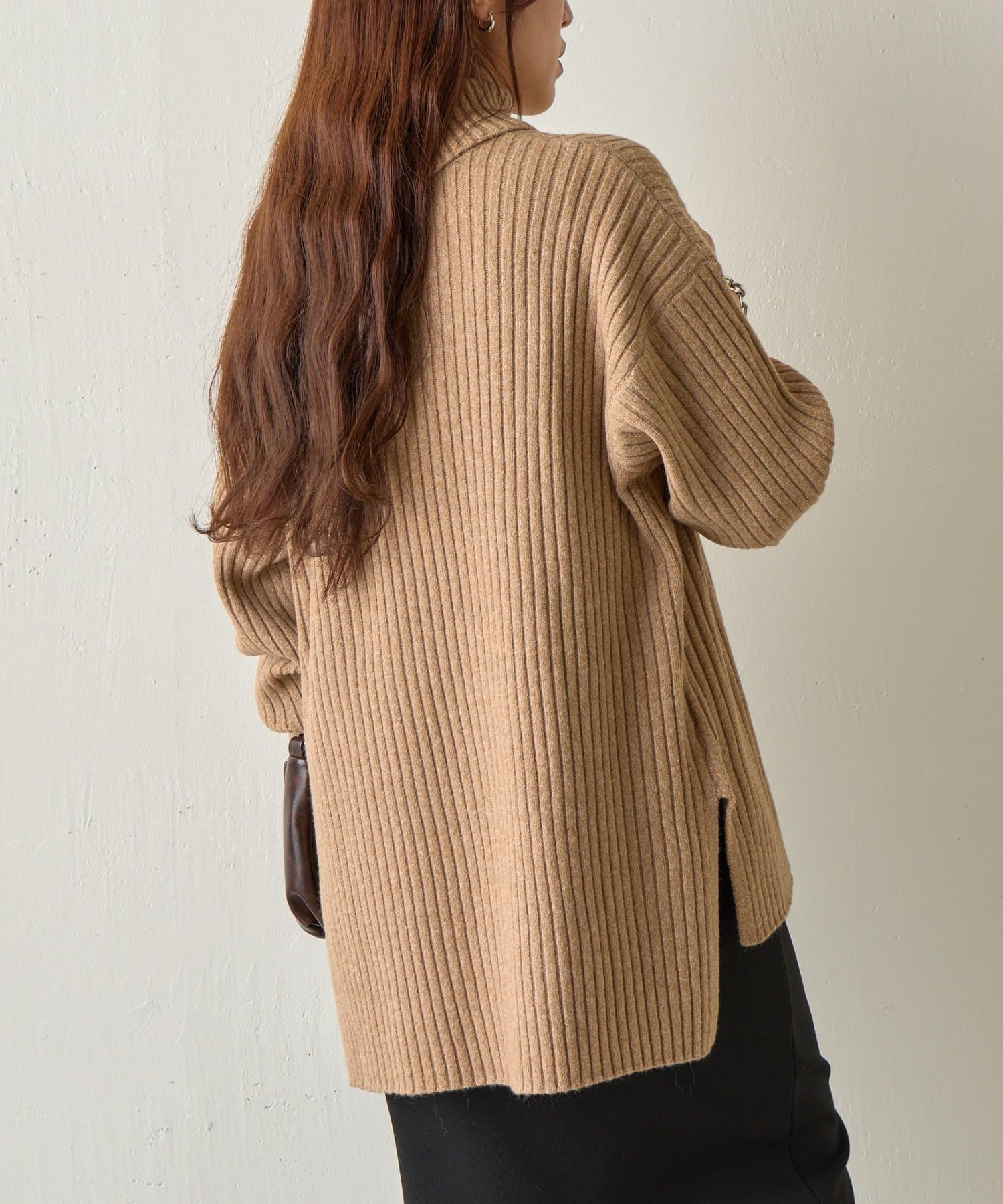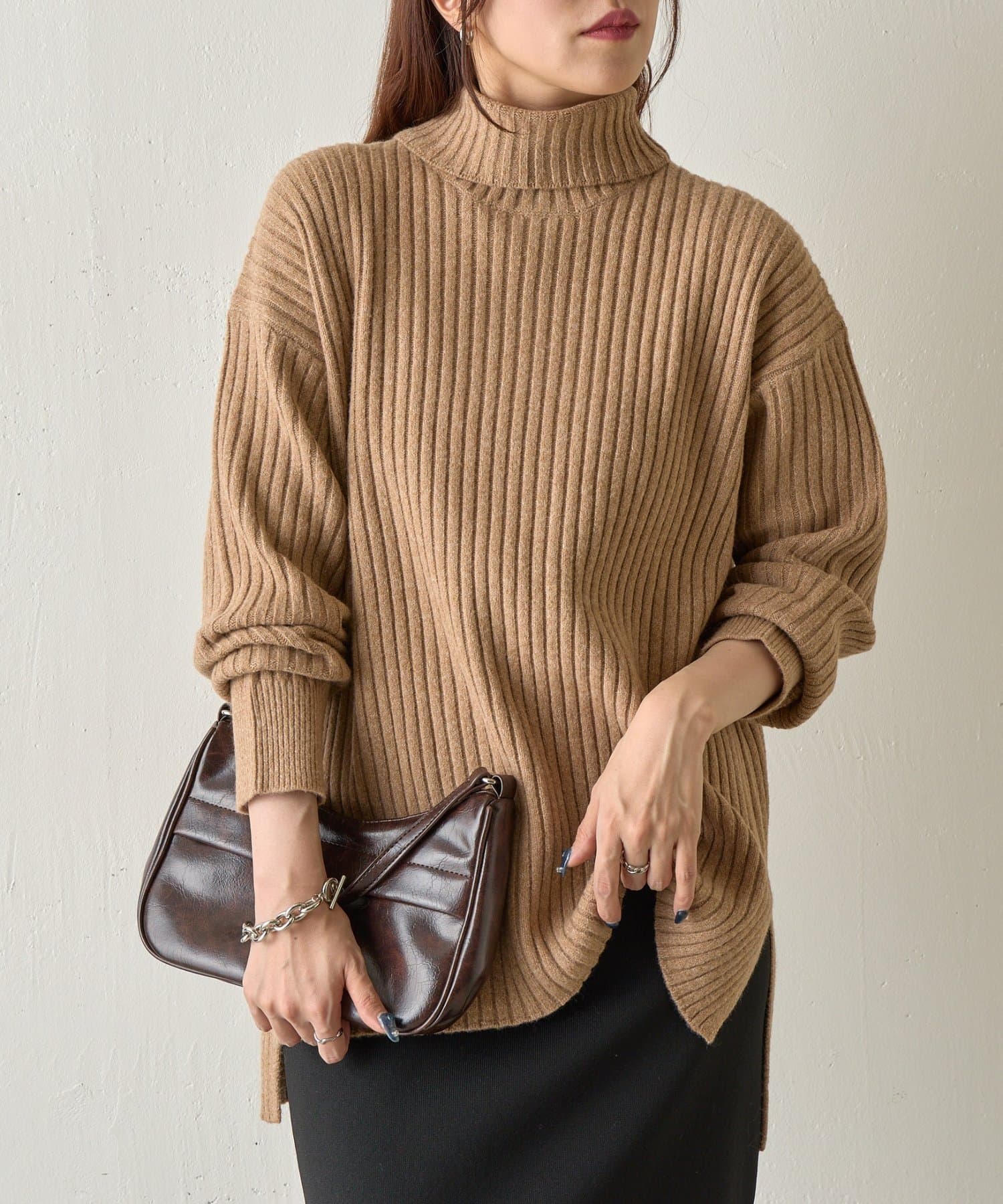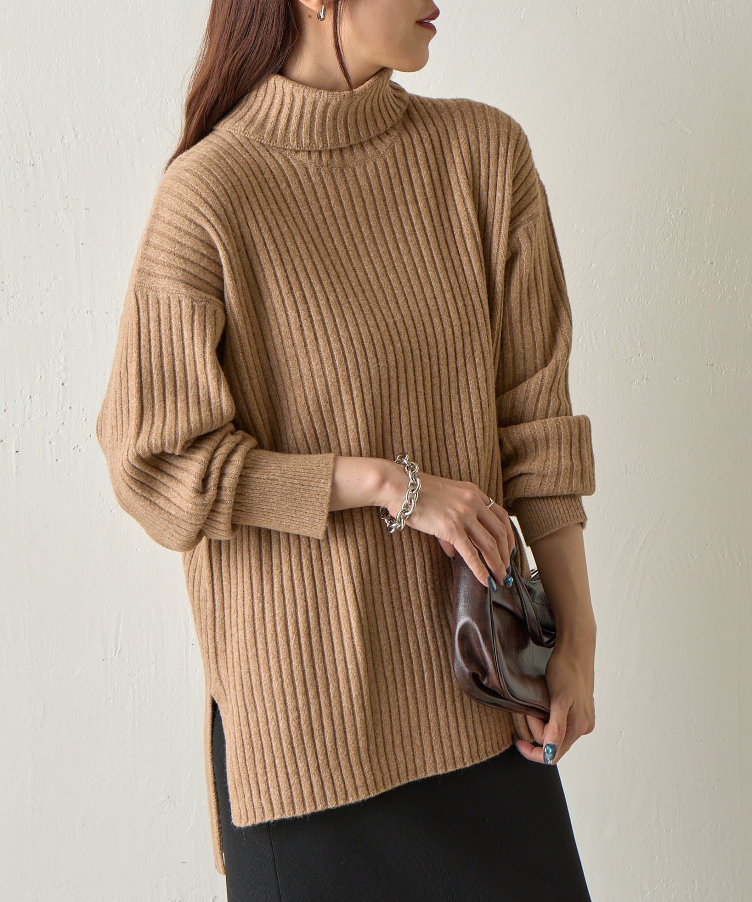 やわらかなリブ編み素材で仕上げたリラックスリブタートルニットです。