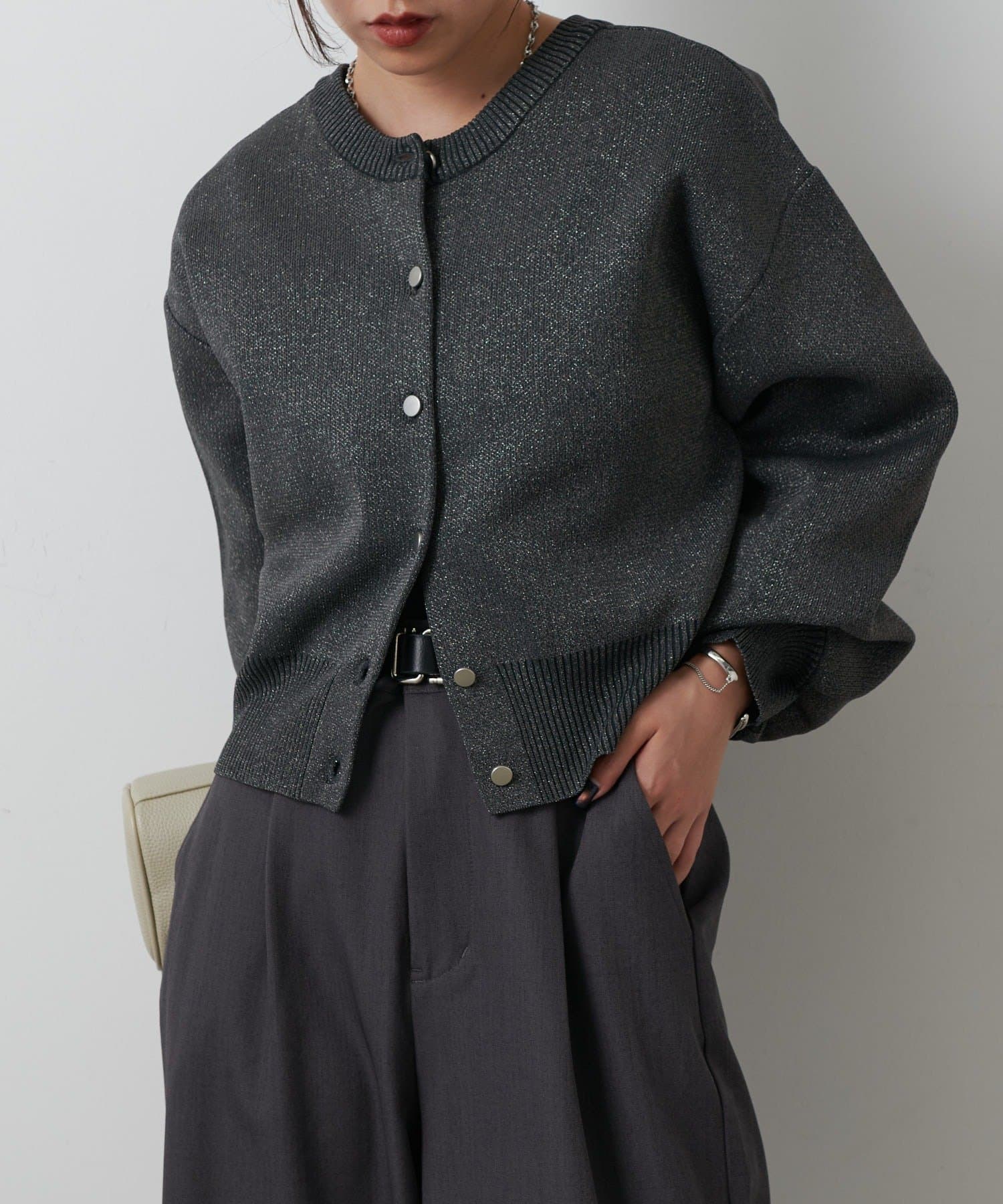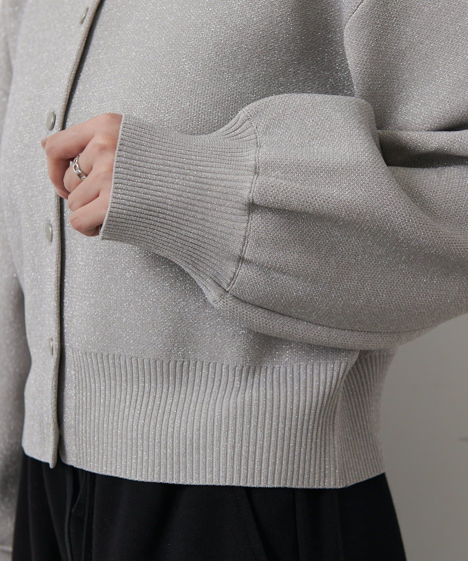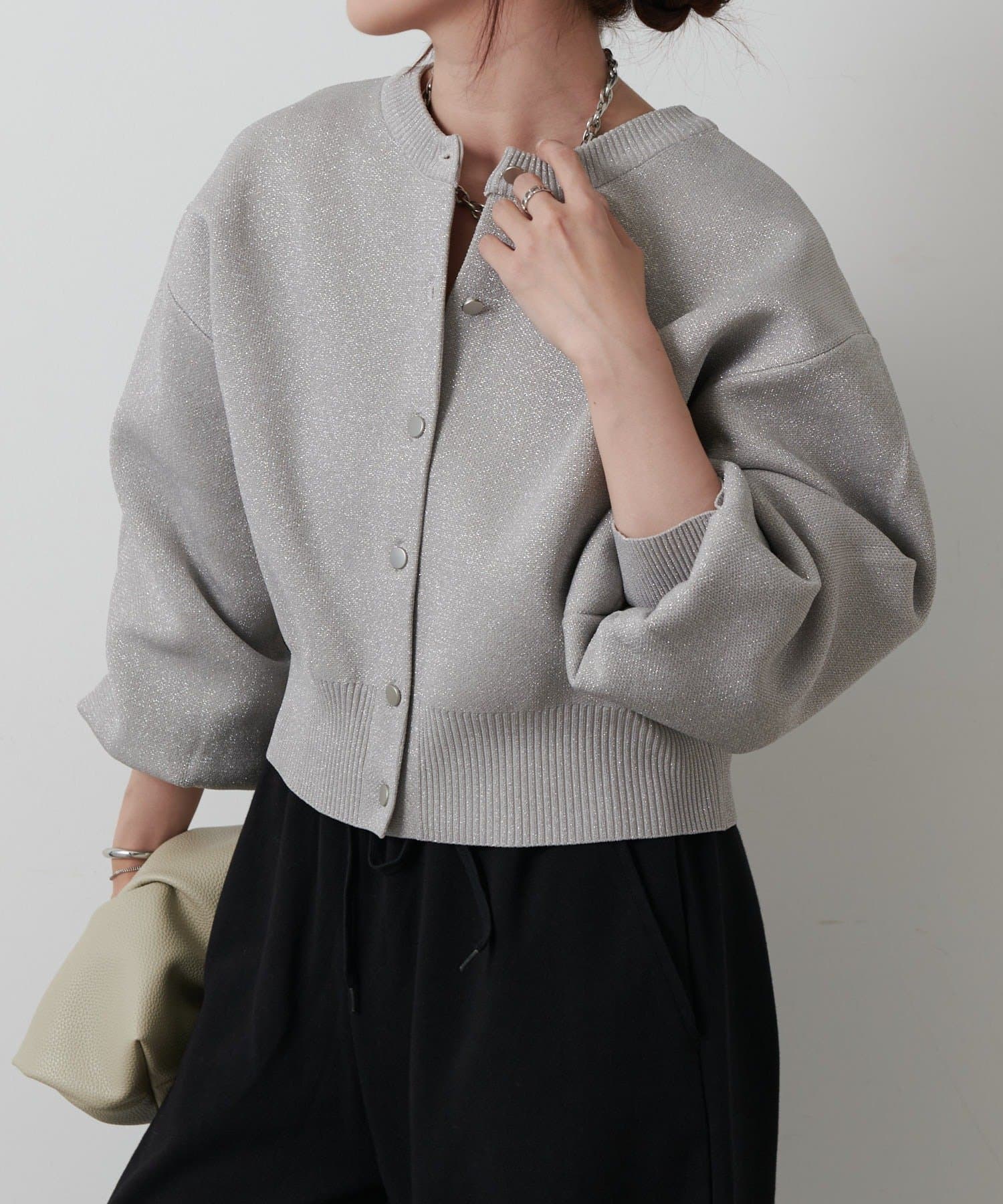 【ラメ入りのスポンディッシュ素材が美しいクルーネックカーディガン】