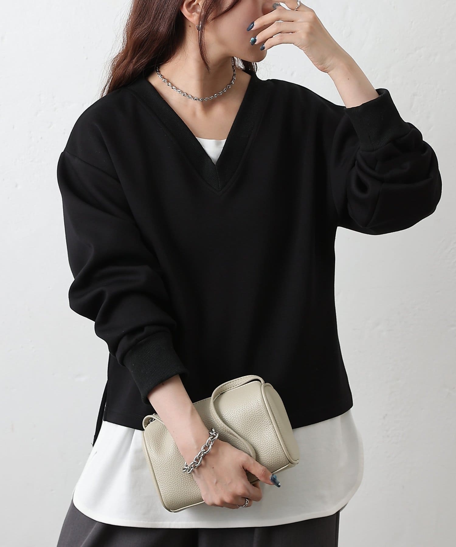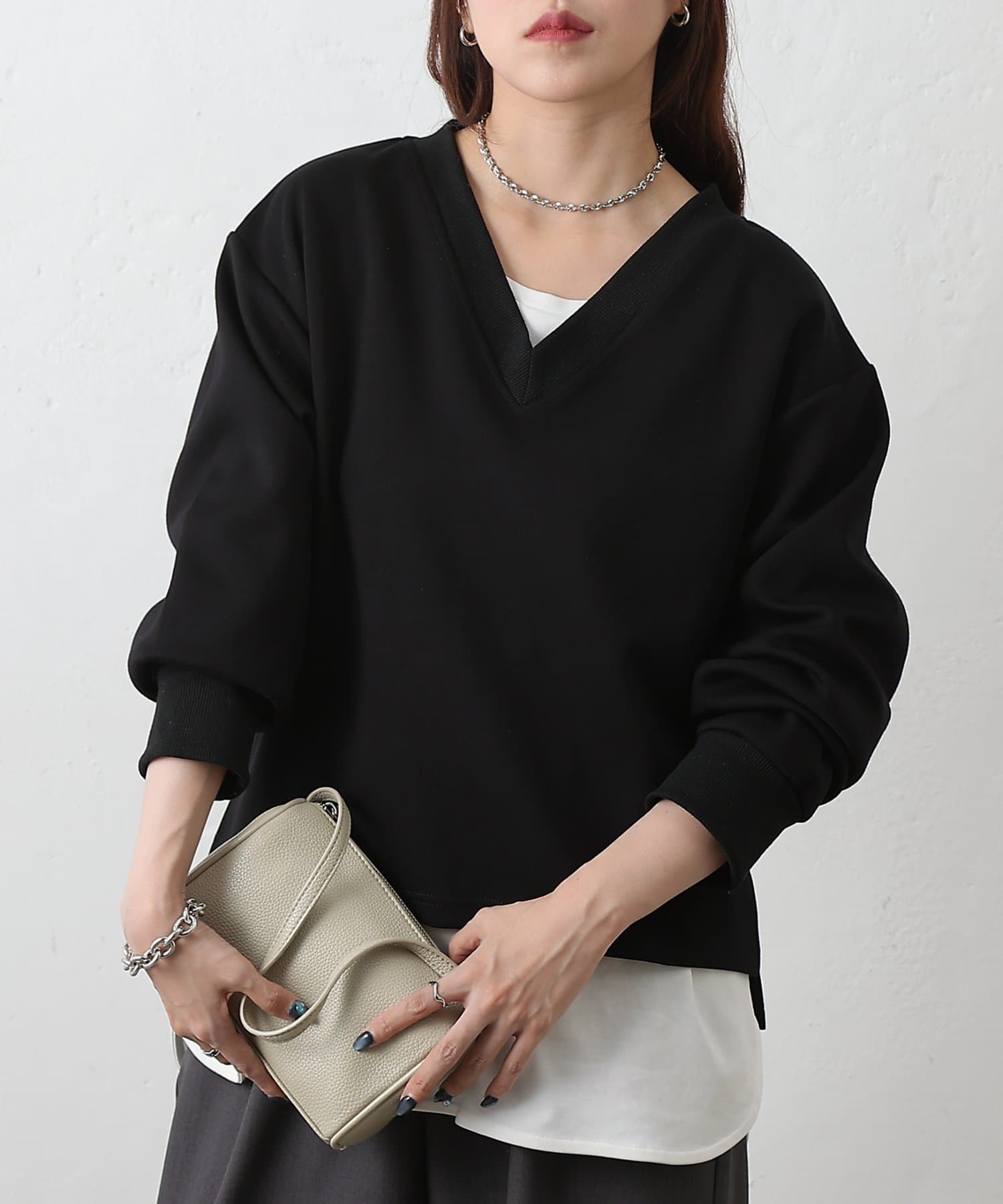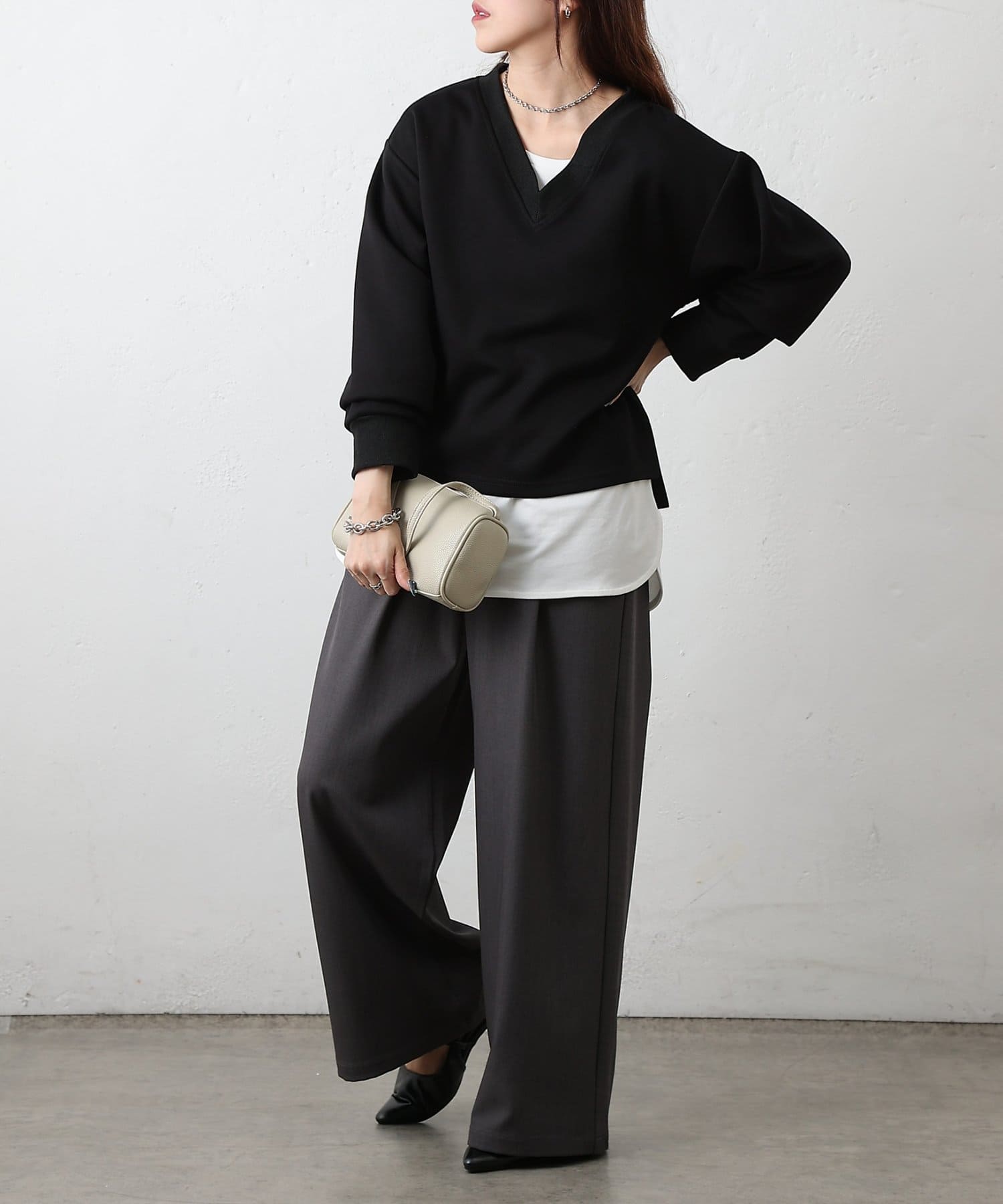 首元はすっきりとしたVネックで、すっきりとした顔まわりに◎