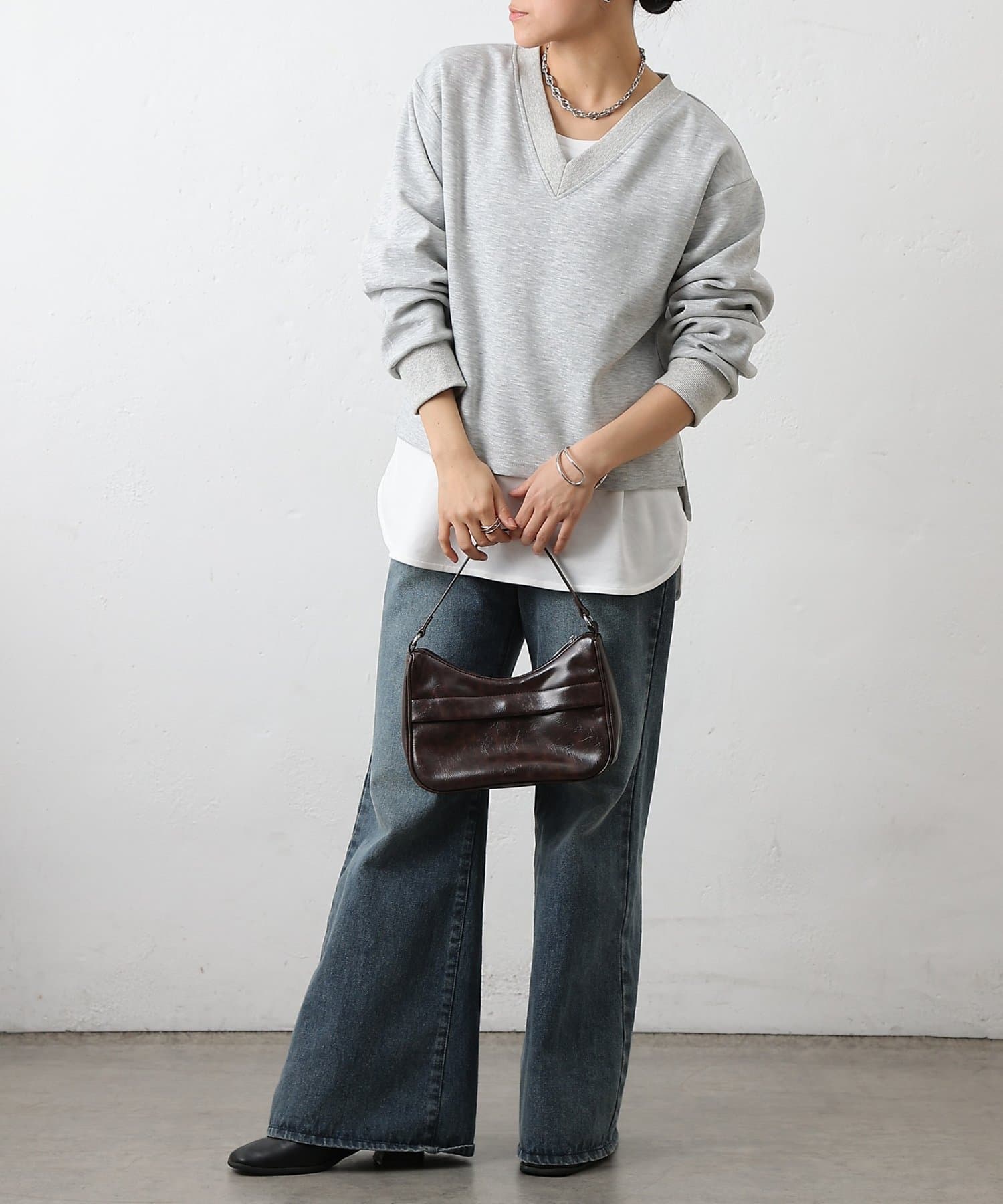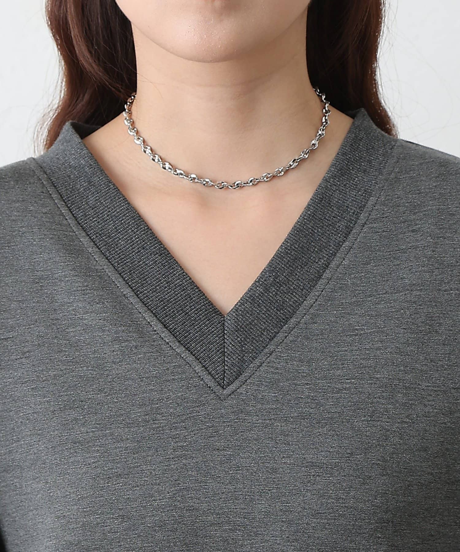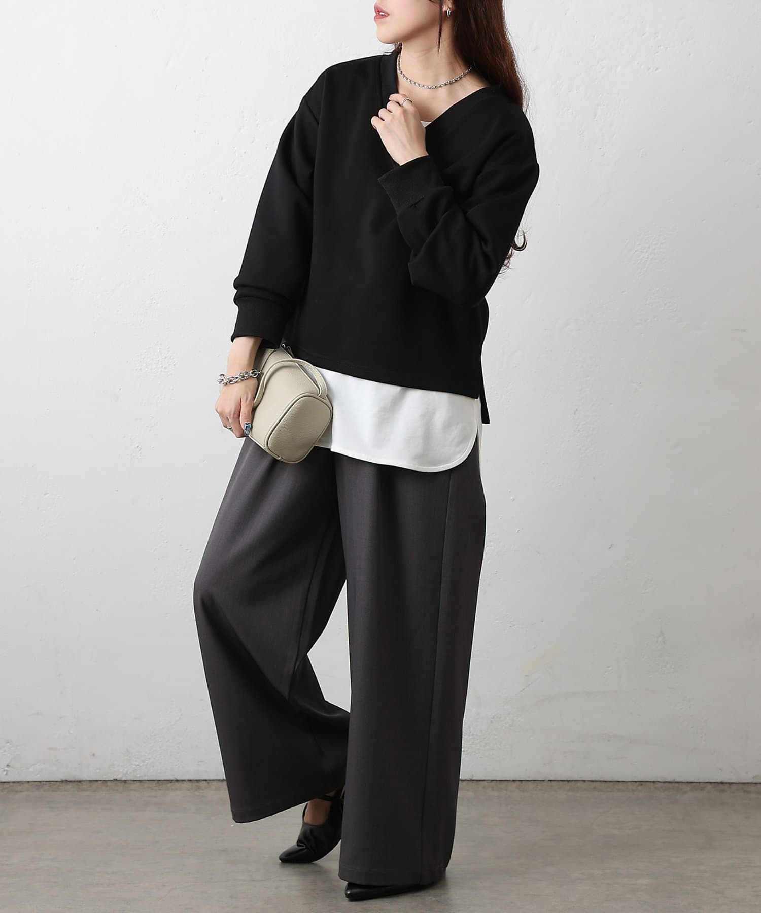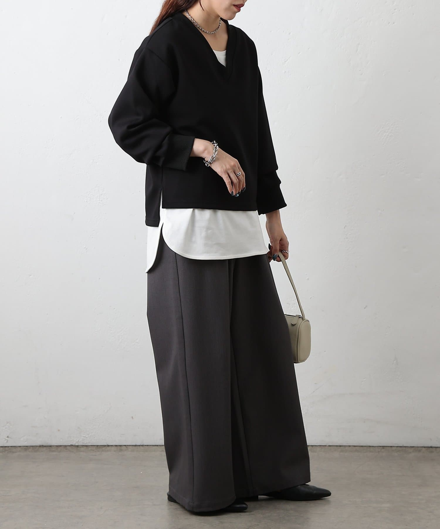 首元はすっきりとしたVネックで、すっきりとした顔まわりに◎