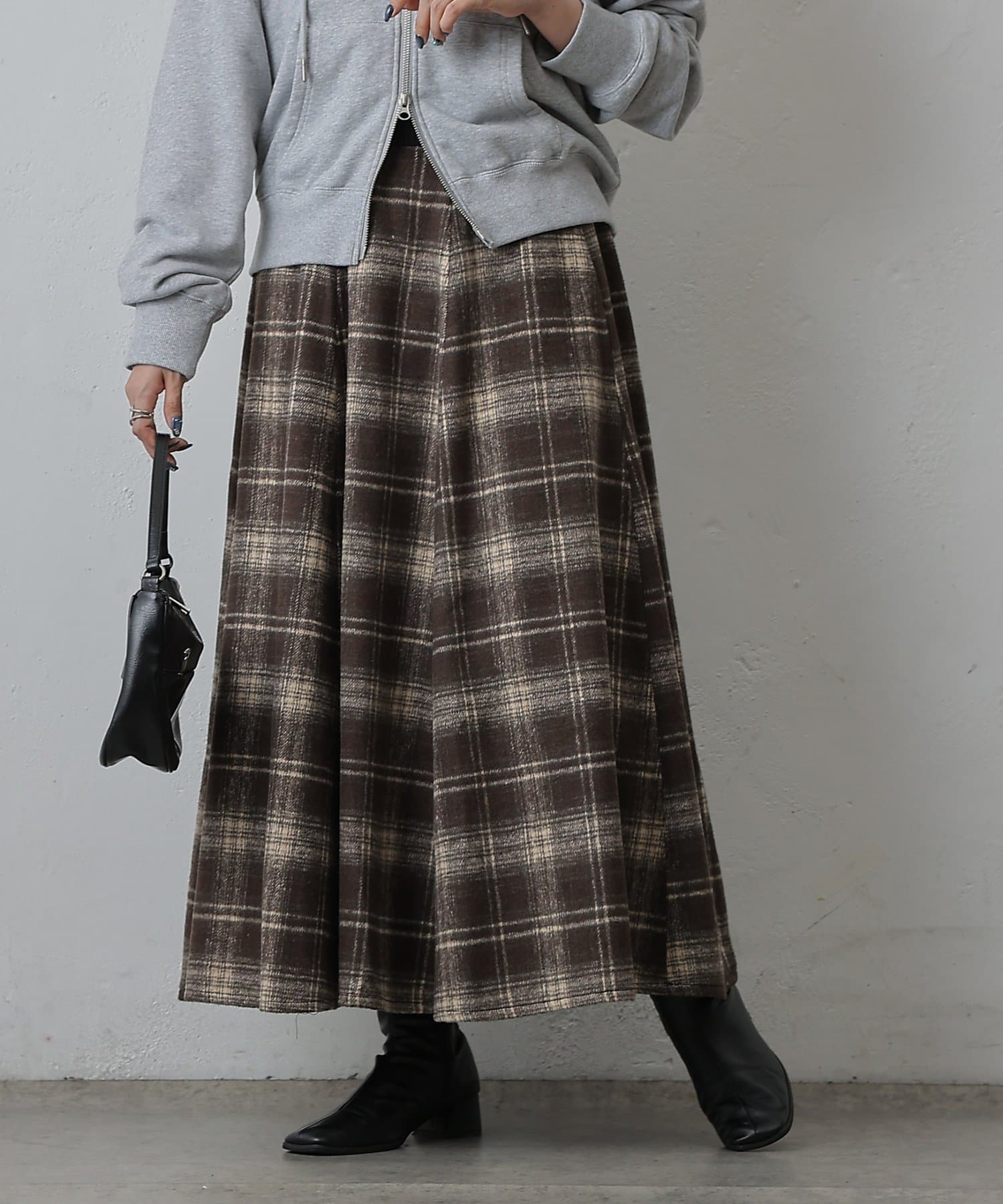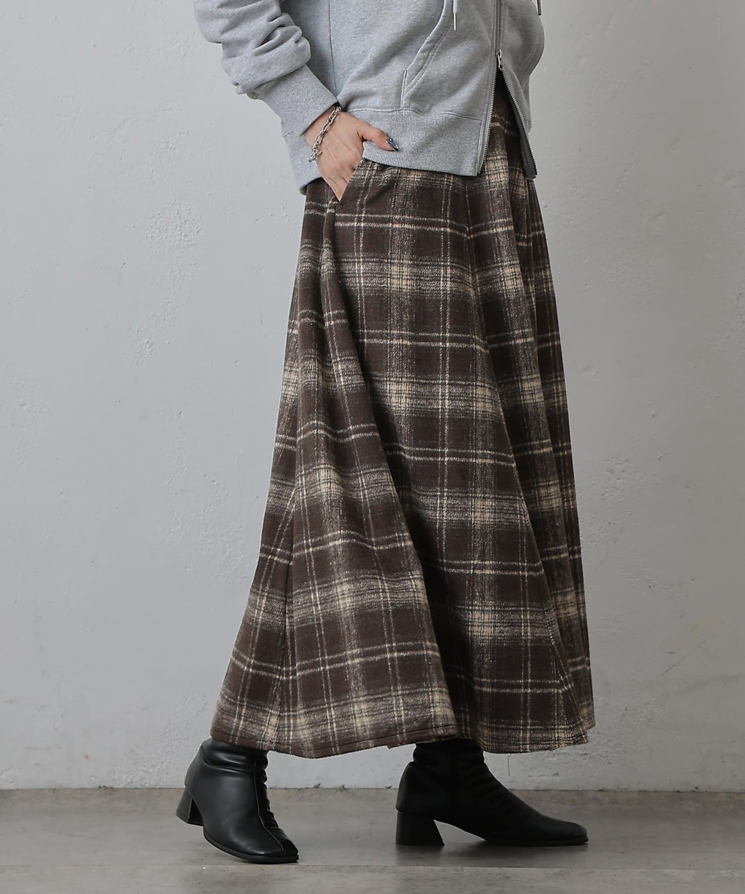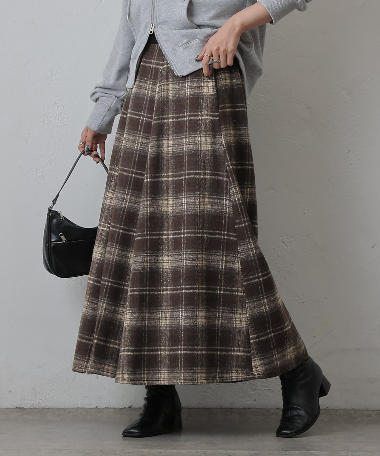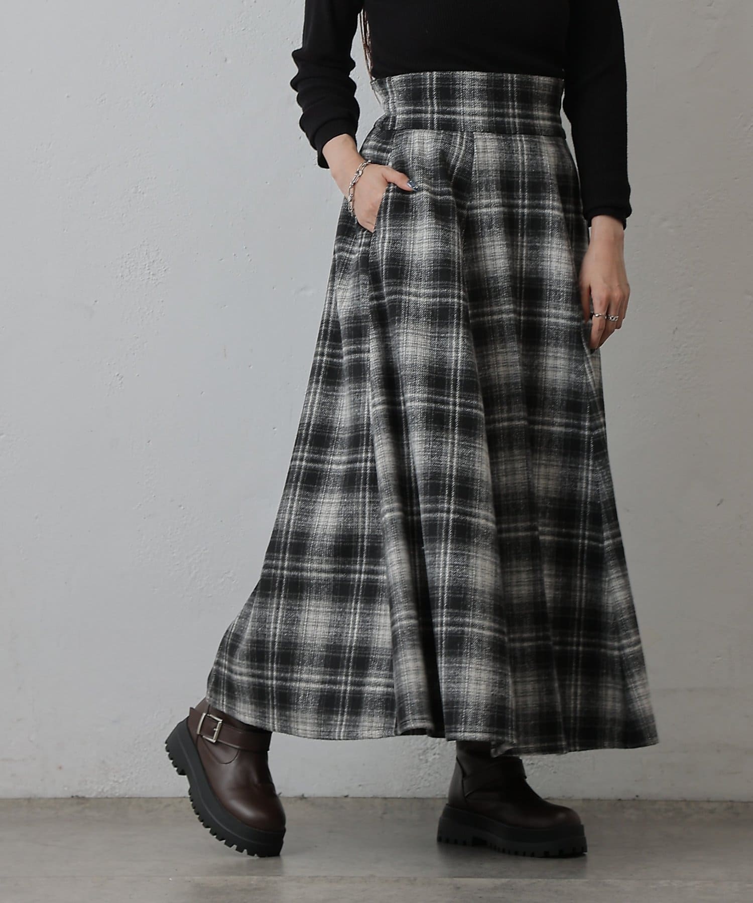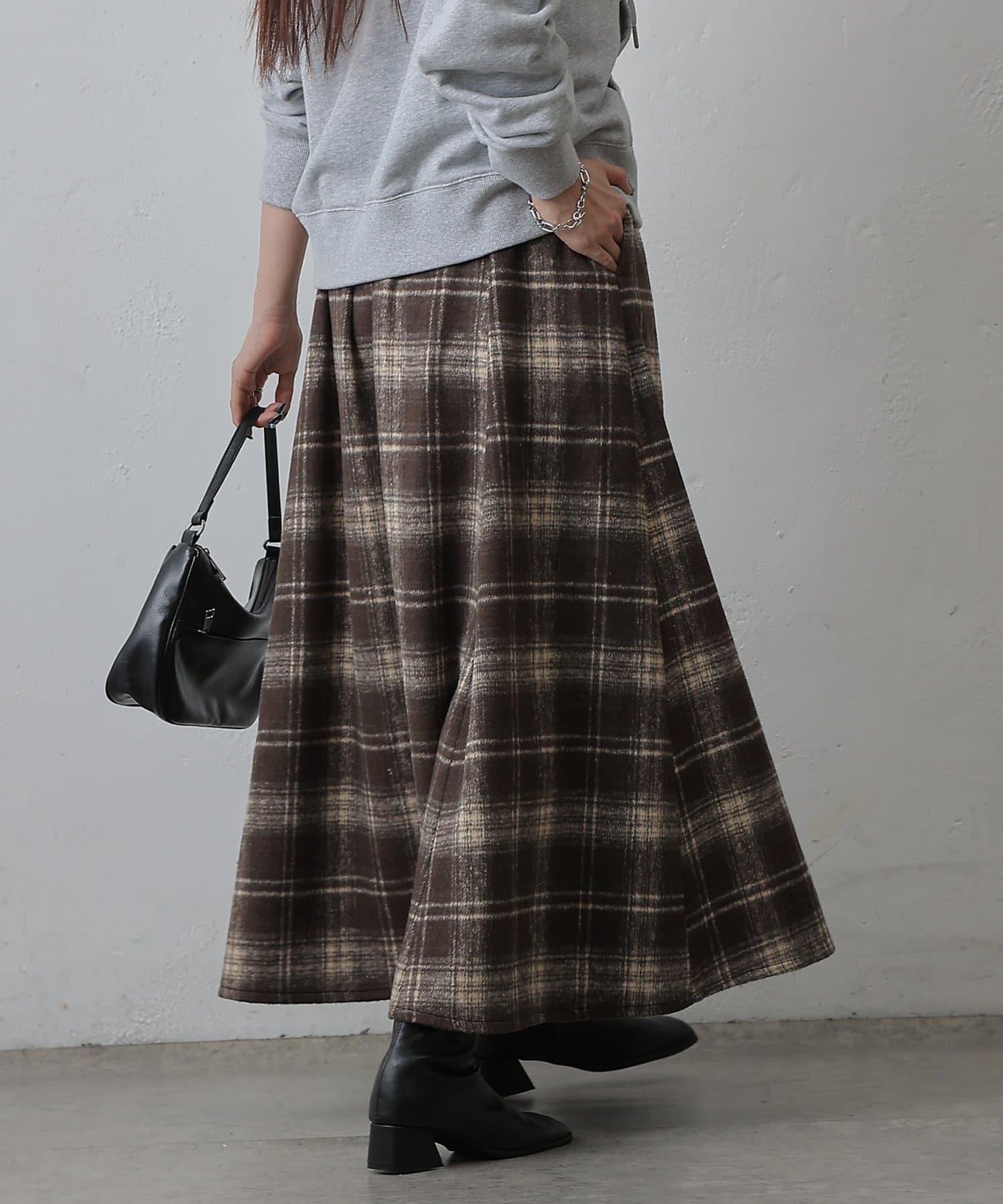 起毛素材と大きめのチェック柄がかわいいフレアスカートです。